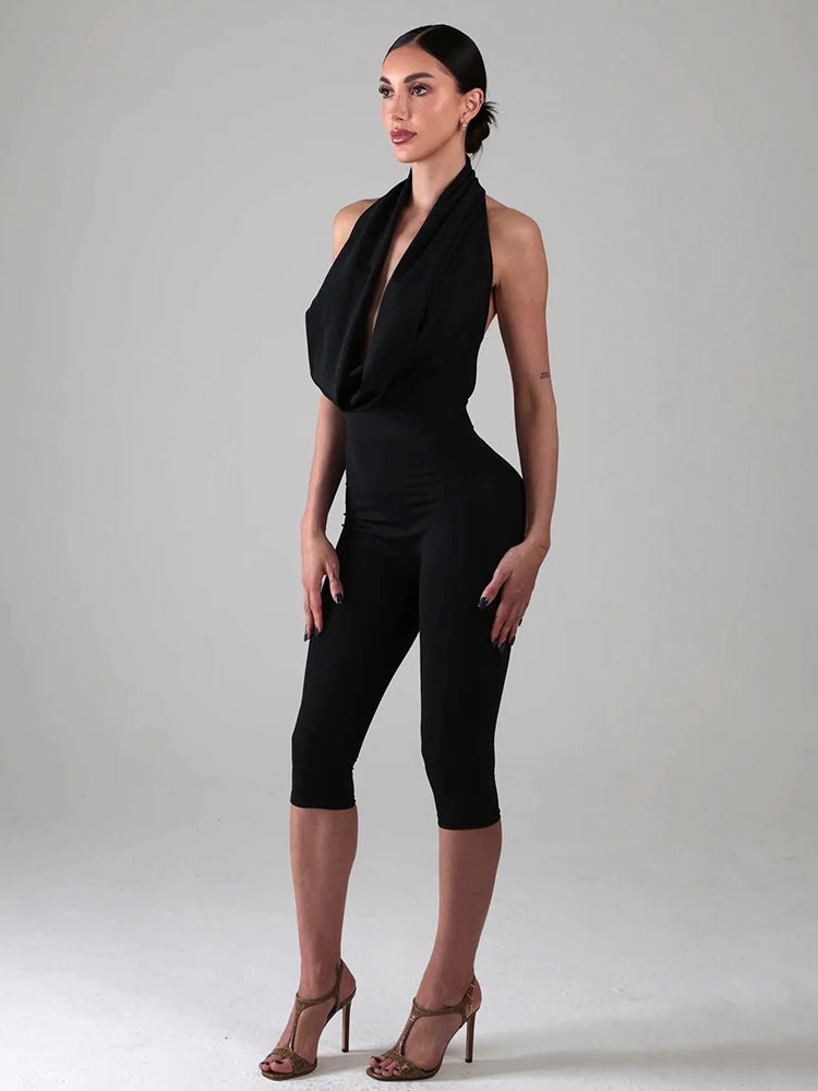 Trend4us Halter Plunge Backless Capri Jumpsuit