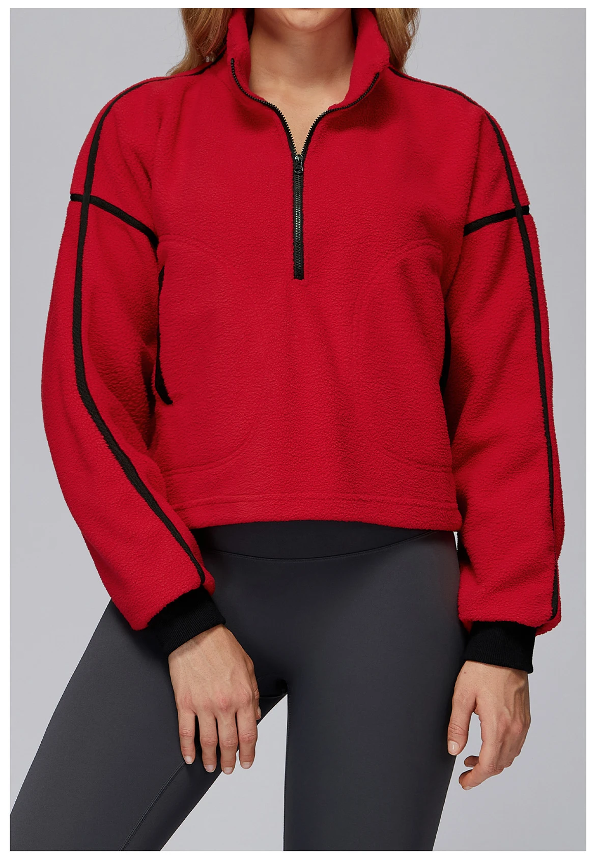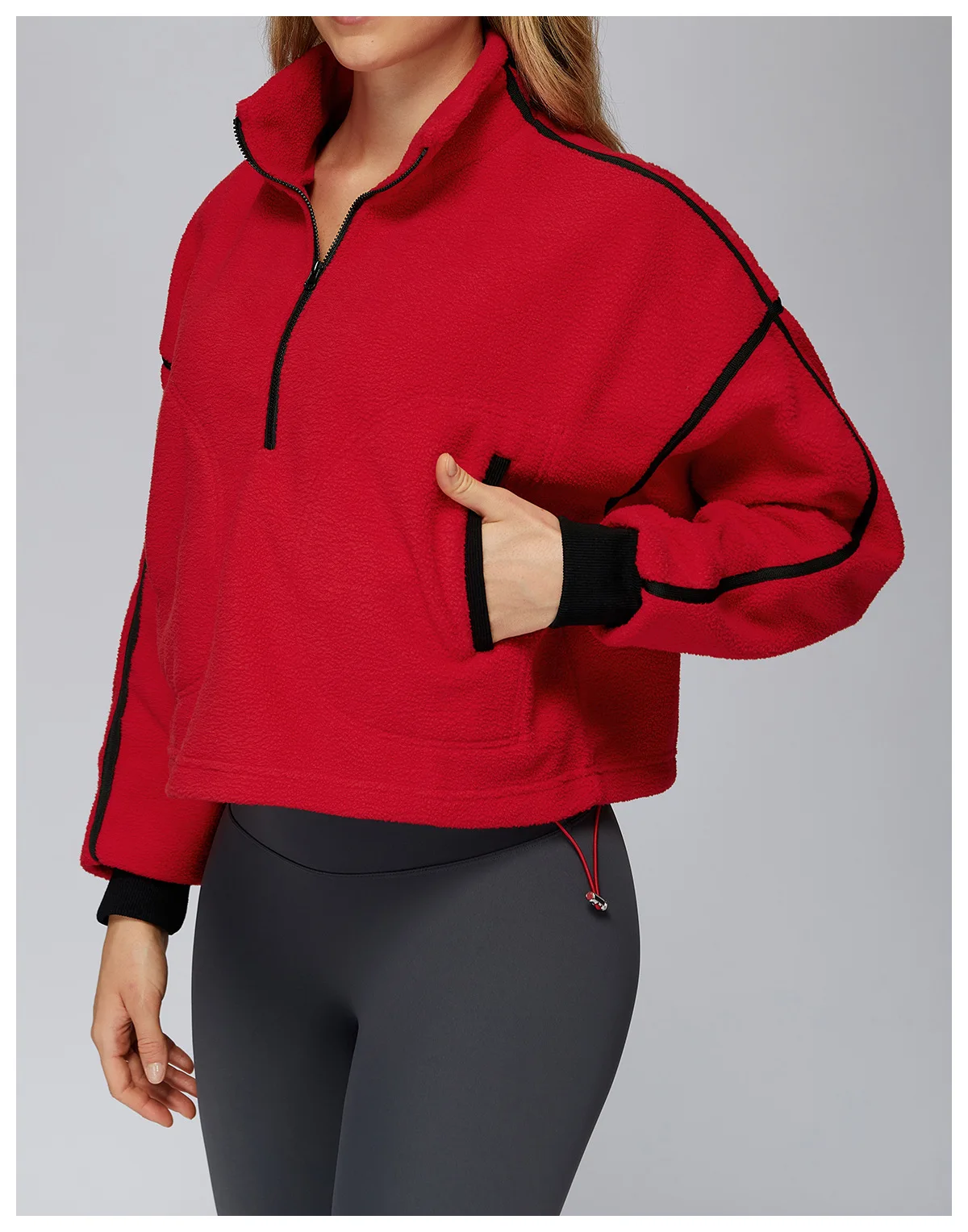 The half-zip design allows for easy layering and temperature control, while the contrast trim detailing and structured mock neck add a refined touch to your casual or activewear look. With side pockets for convenience and an adjustable drawstring hem for a customizable fit, it’s designed to keep you both comfortable and chic from workouts to weekend lounging.
