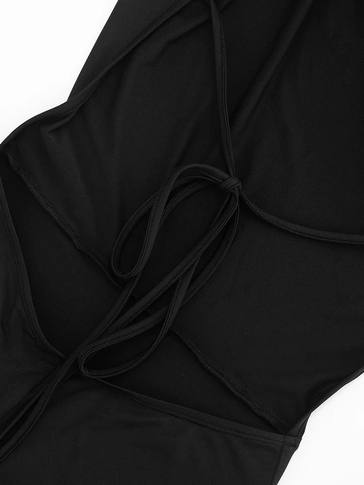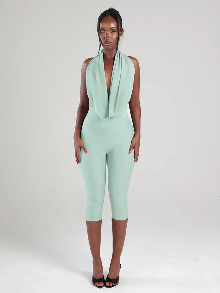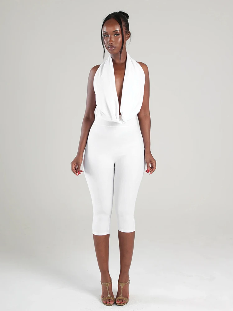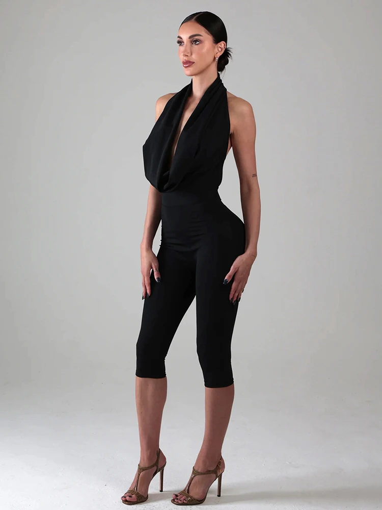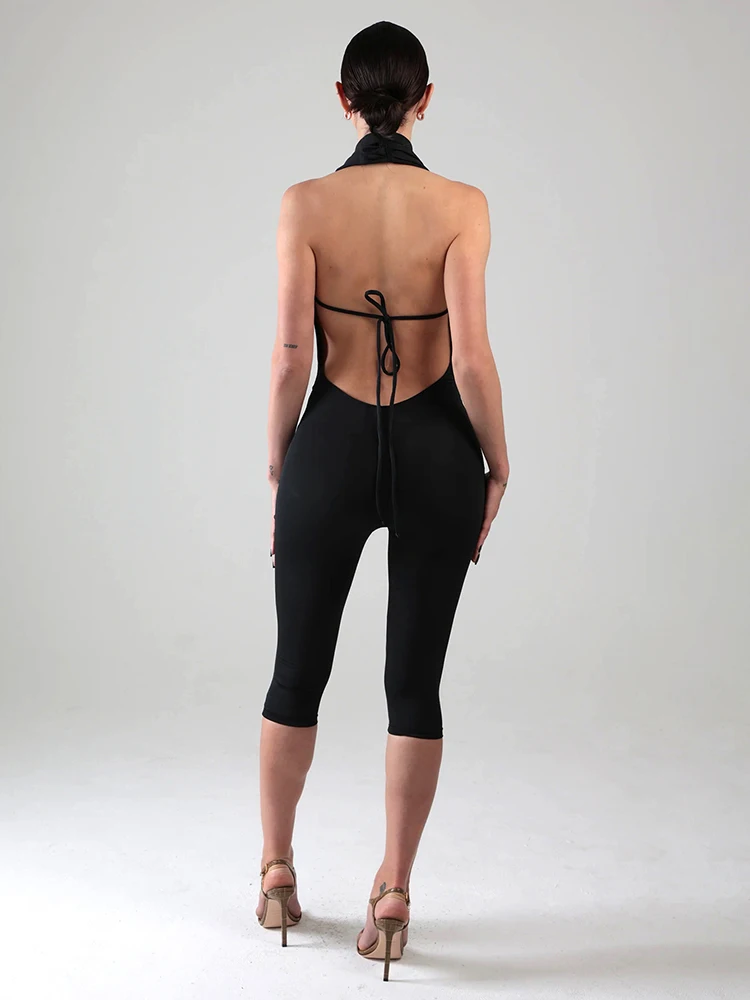The open-back design with adjustable tie closure adds a striking, minimal finish, balancing elegance with confidence. Crafted from a soft, stretch-enhanced fabric, the capri-length cut hugs the body while offering comfort and flexibility—perfect for warm nights, elevated events, or resort-ready styling.