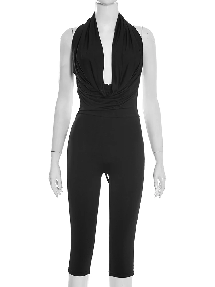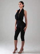 Effortlessly refined with a sensual edge, the Trend4us Halter Plunge Backless Capri Jumpsuit is designed to sculpt, elongate, and command attention. Featuring a deep plunge halter neckline, this sleek one-piece highlights the décolletage while cinching the waist for a smooth, contoured silhouette.