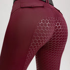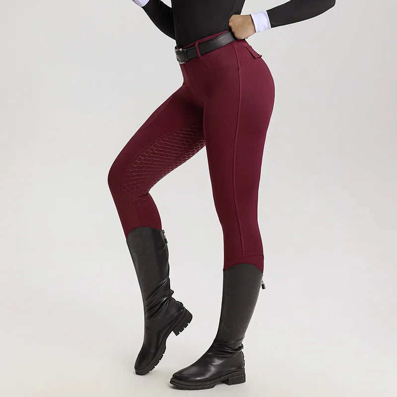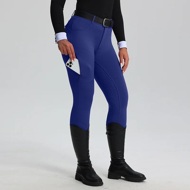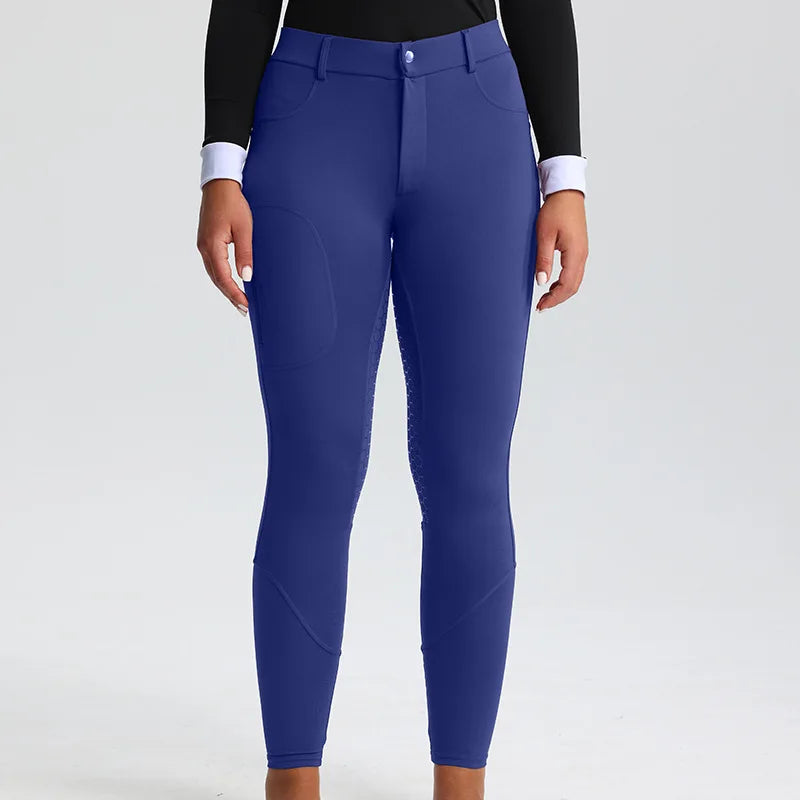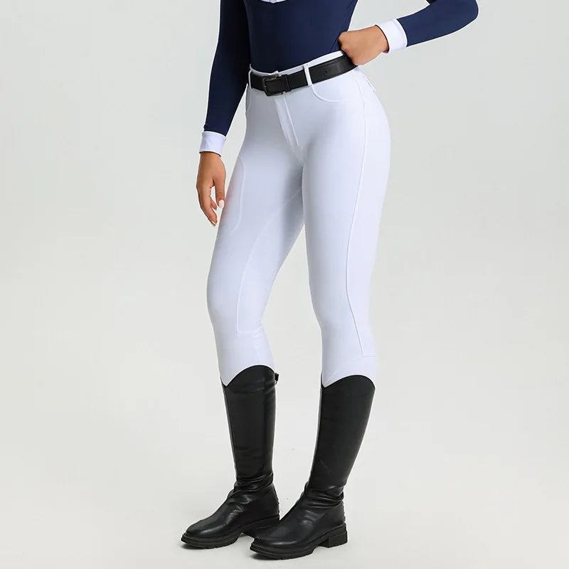 The high-rise waistband delivers a secure, flattering fit, while the full-seat silicone grip enhances contact and control for confident riding. Tailored seam lines and a smooth, second-skin feel create a sleek silhouette that performs as beautifully as it looks. Finished with functional pockets and classic breeches detailing, this piece is ideal for training, competition prep, and elevated stable wear.