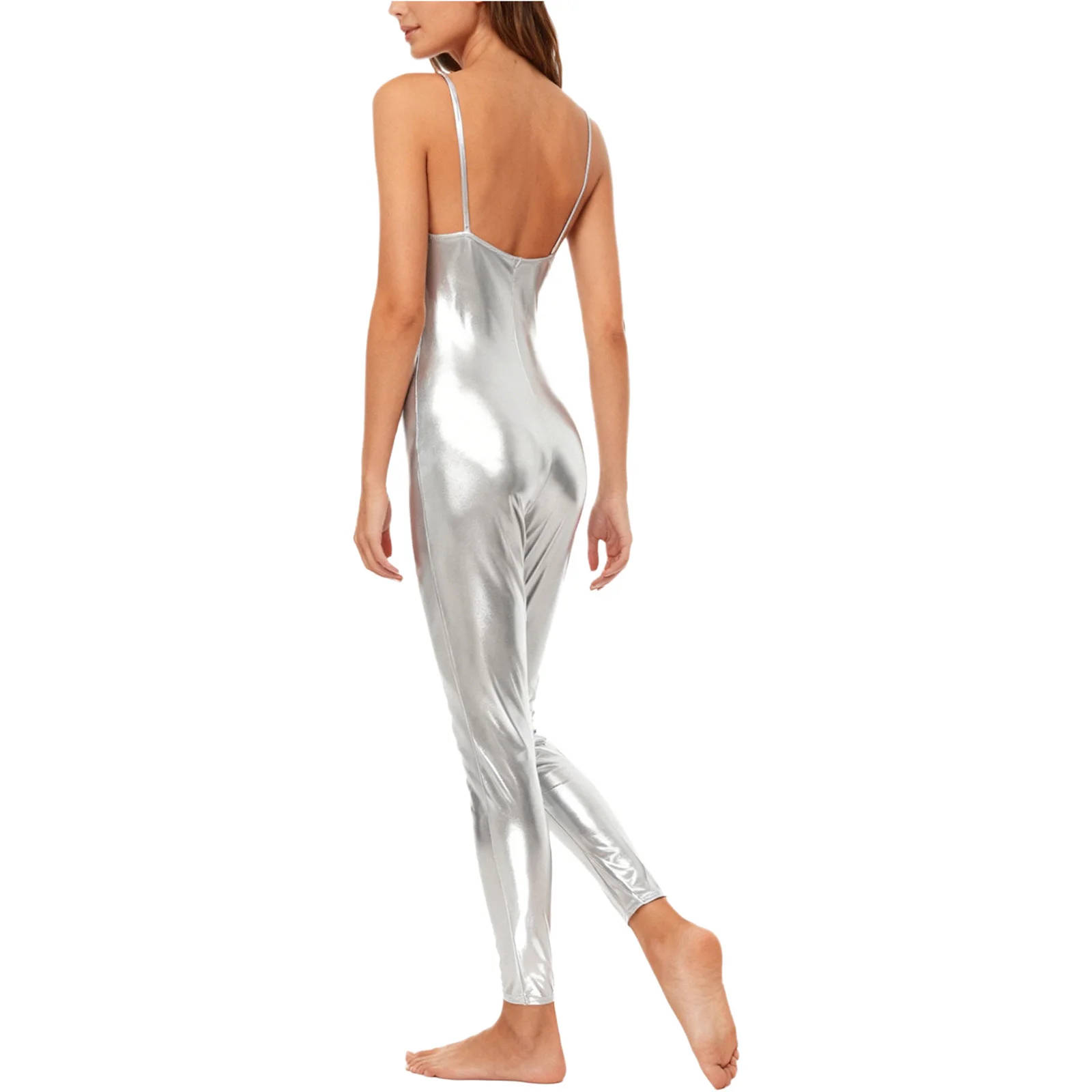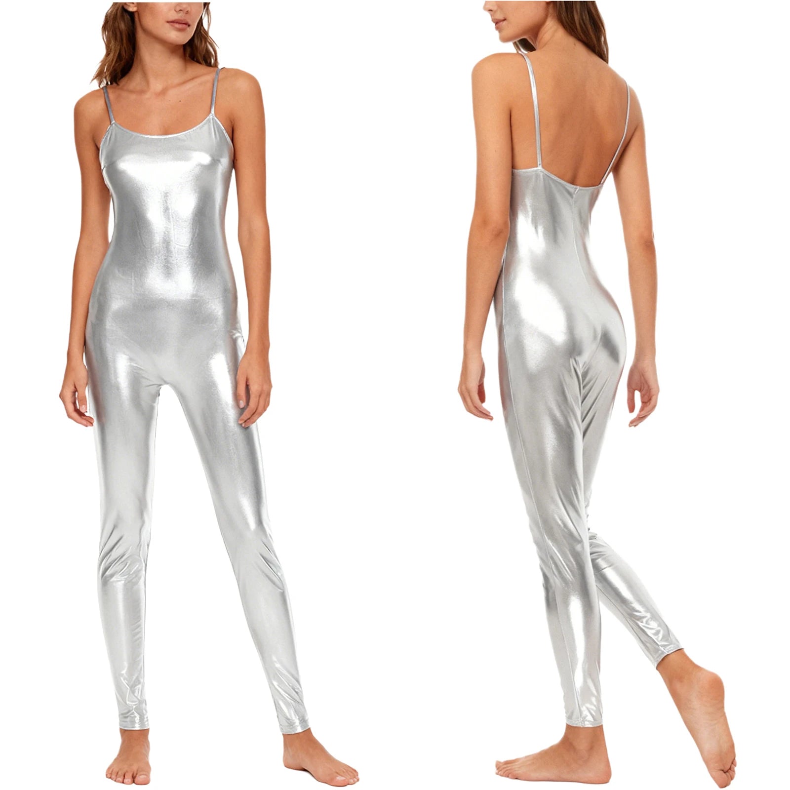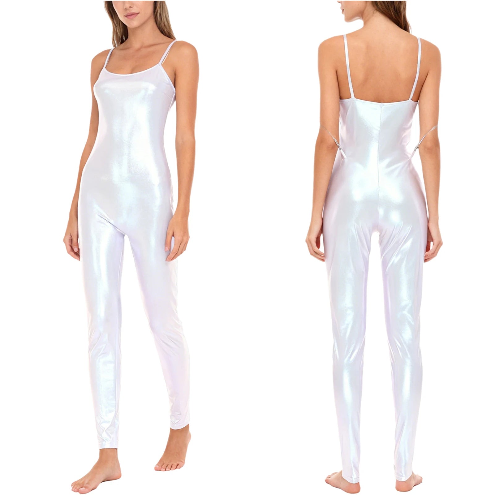 The streamlined silhouette contours smoothly from shoulder to ankle, while the lightweight stretch fabric supports full range of motion without restriction. Spaghetti straps provide a clean, minimalist look that keeps focus on movement and form. Whether under stage lights or in competition settings, this catsuit reflects light beautifully for maximum visual impact.