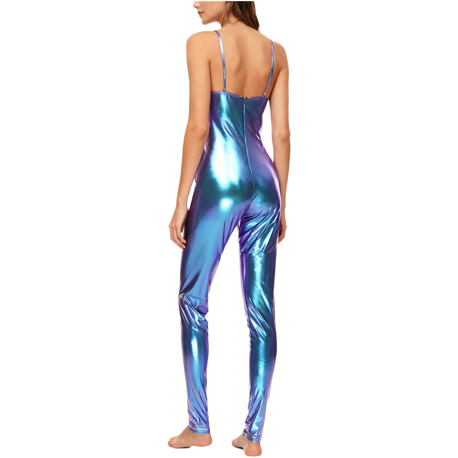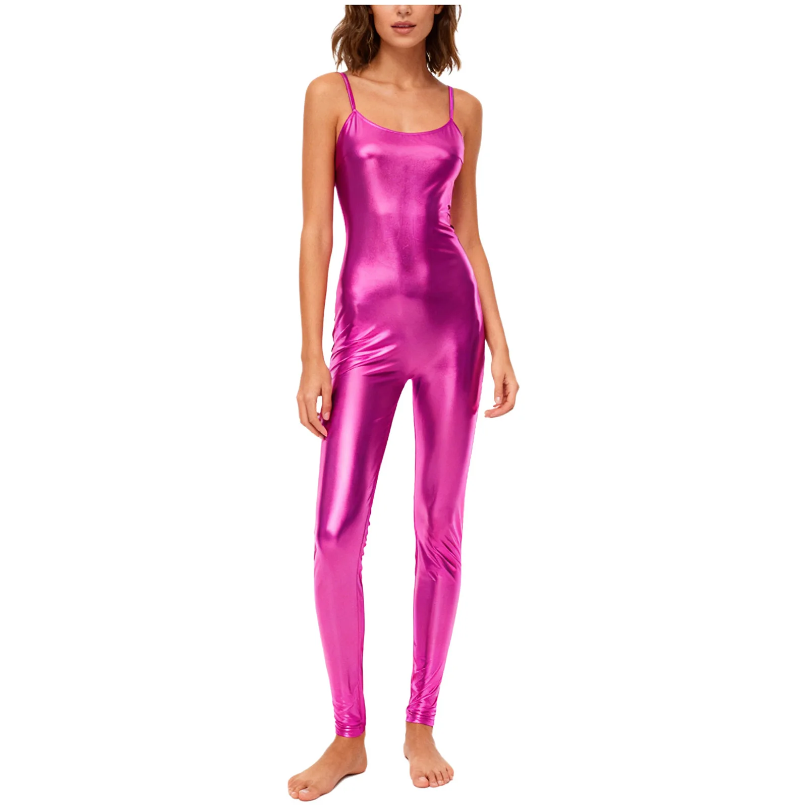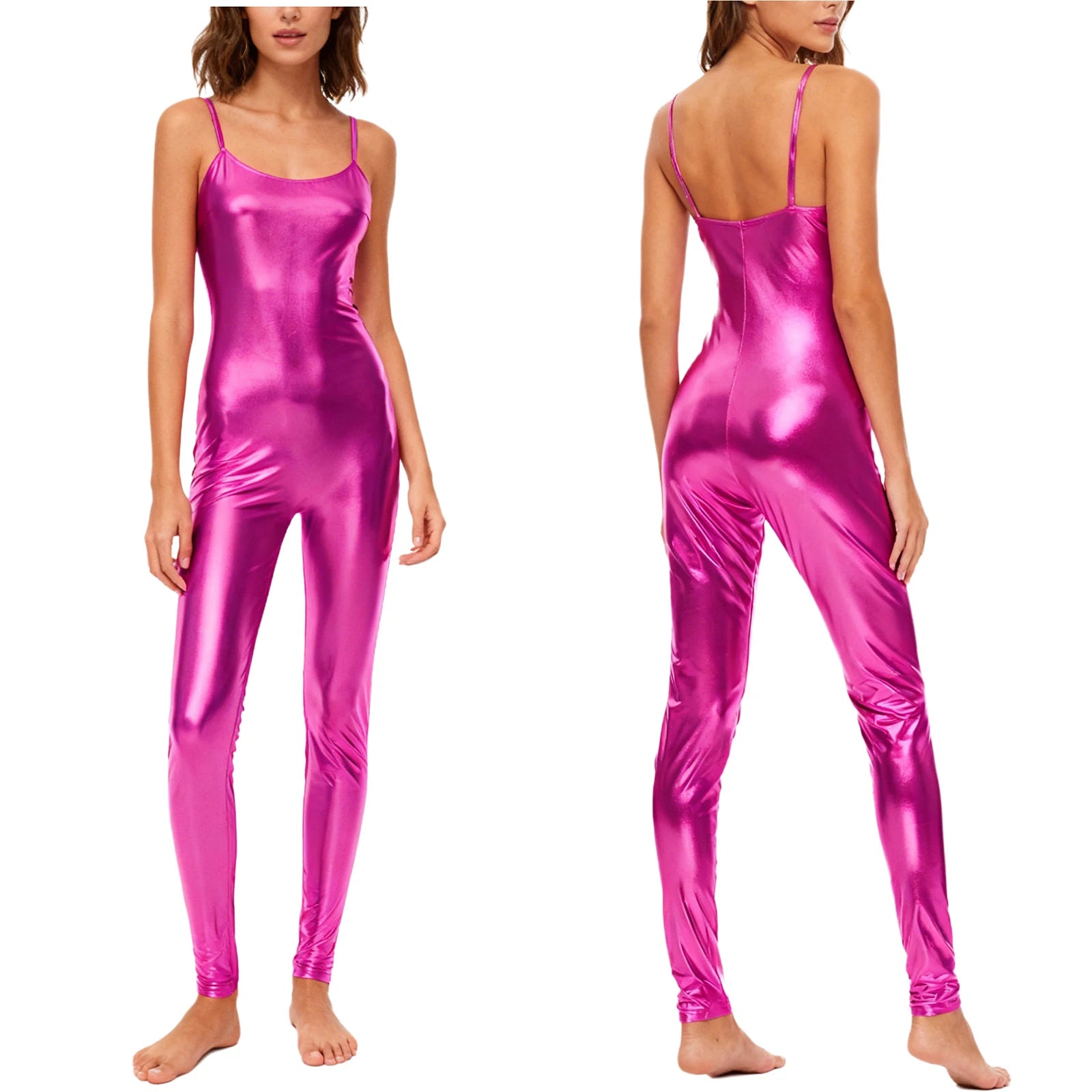 The streamlined silhouette contours smoothly from shoulder to ankle, while the lightweight stretch fabric supports full range of motion without restriction. Spaghetti straps provide a clean, minimalist look that keeps focus on movement and form. Whether under stage lights or in competition settings, this catsuit reflects light beautifully for maximum visual impact.
