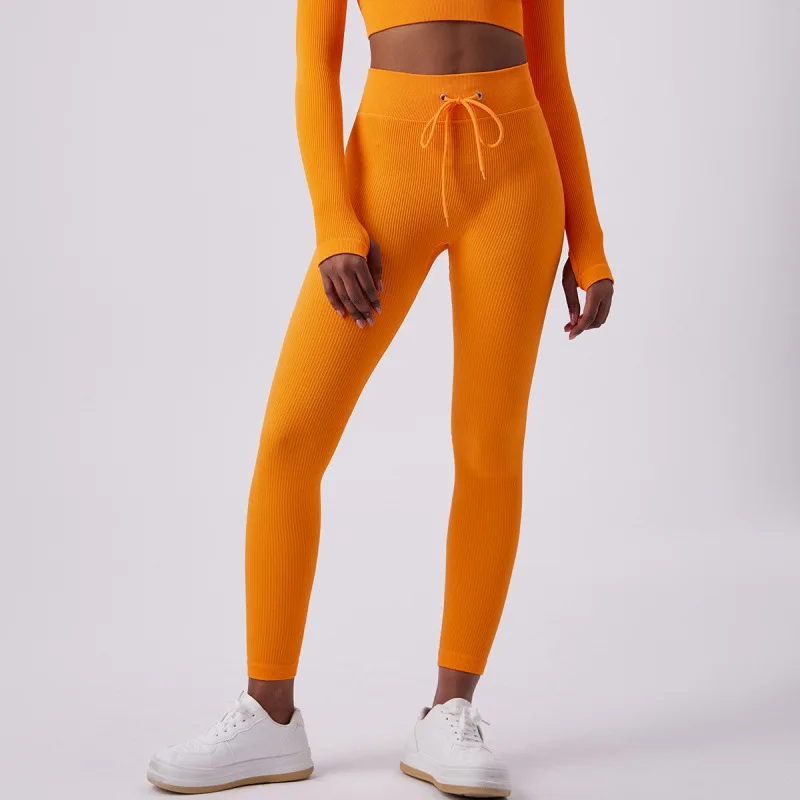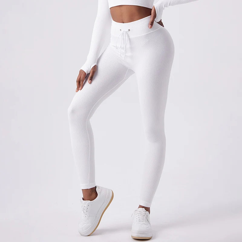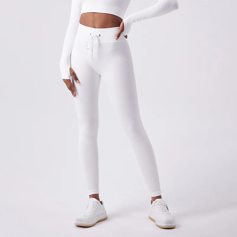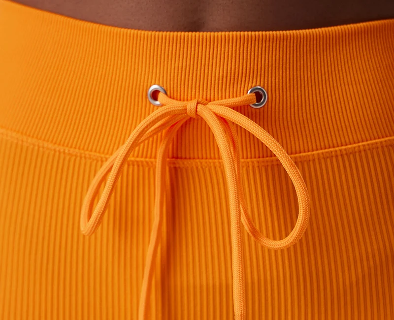 The high-rise waistband features an adjustable drawstring for a secure, customized fit that stays in place during movement. The seamless ribbed texture enhances shape definition while delivering a smooth, flattering silhouette. Perfect for the gym, yoga, or styled with an oversized tee for off-duty days