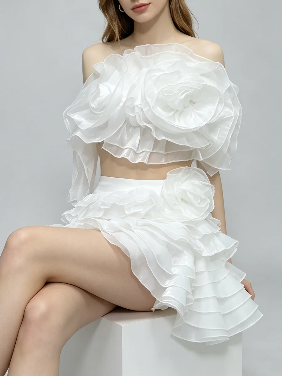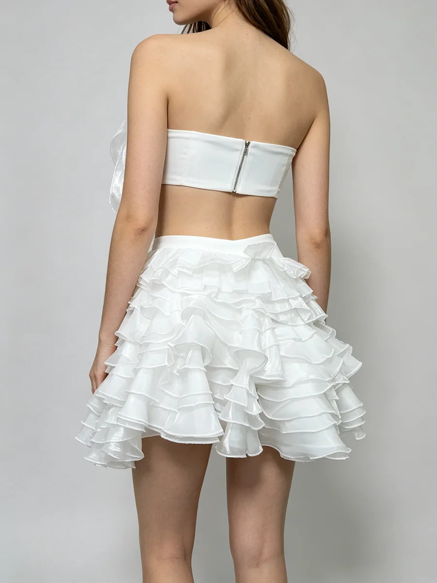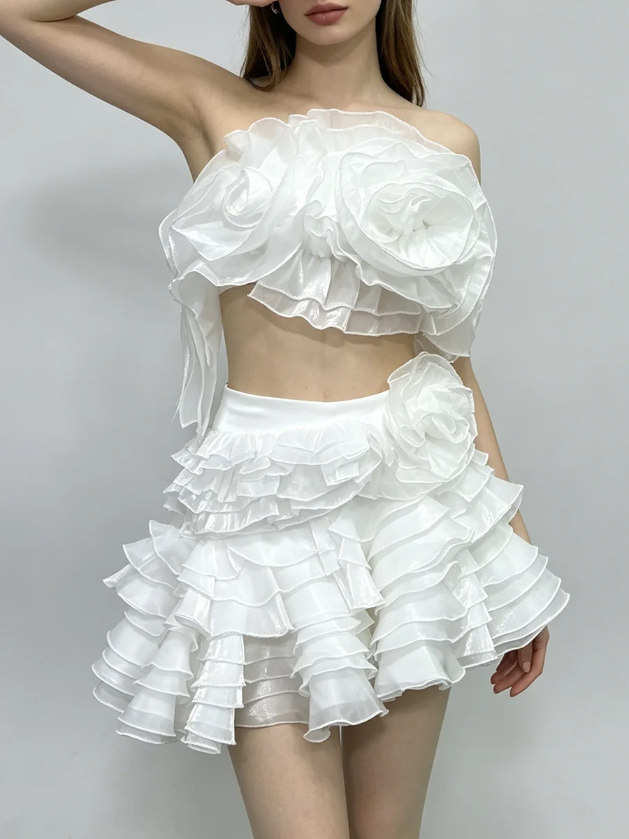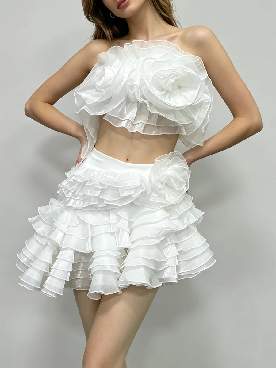 Trend4us Luxe Strapless 3D Ruffle Crop Top & Mini Skirt Set