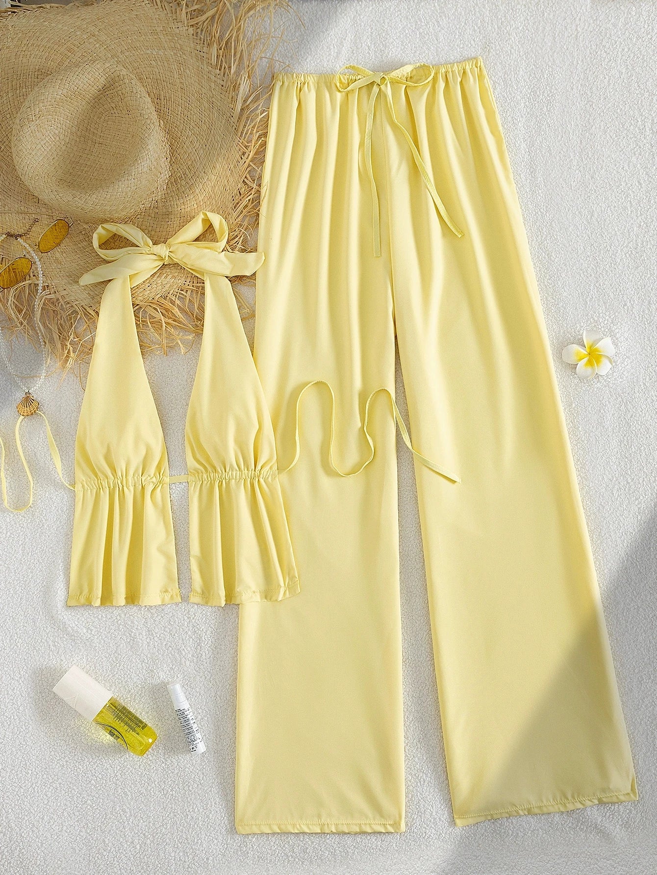 Effortlessly chic and beach-ready, this halter top and wide-leg pants two-piece set is your go-to for poolside lounging and resort days. The string halter neckline and high-waist wide-leg pants create a flattering, breezy silhouette that transitions seamlessly from the beach to a sunset dinner. Available in Yellow.