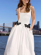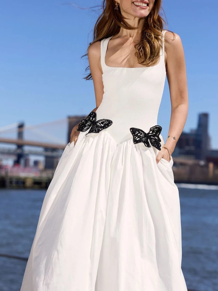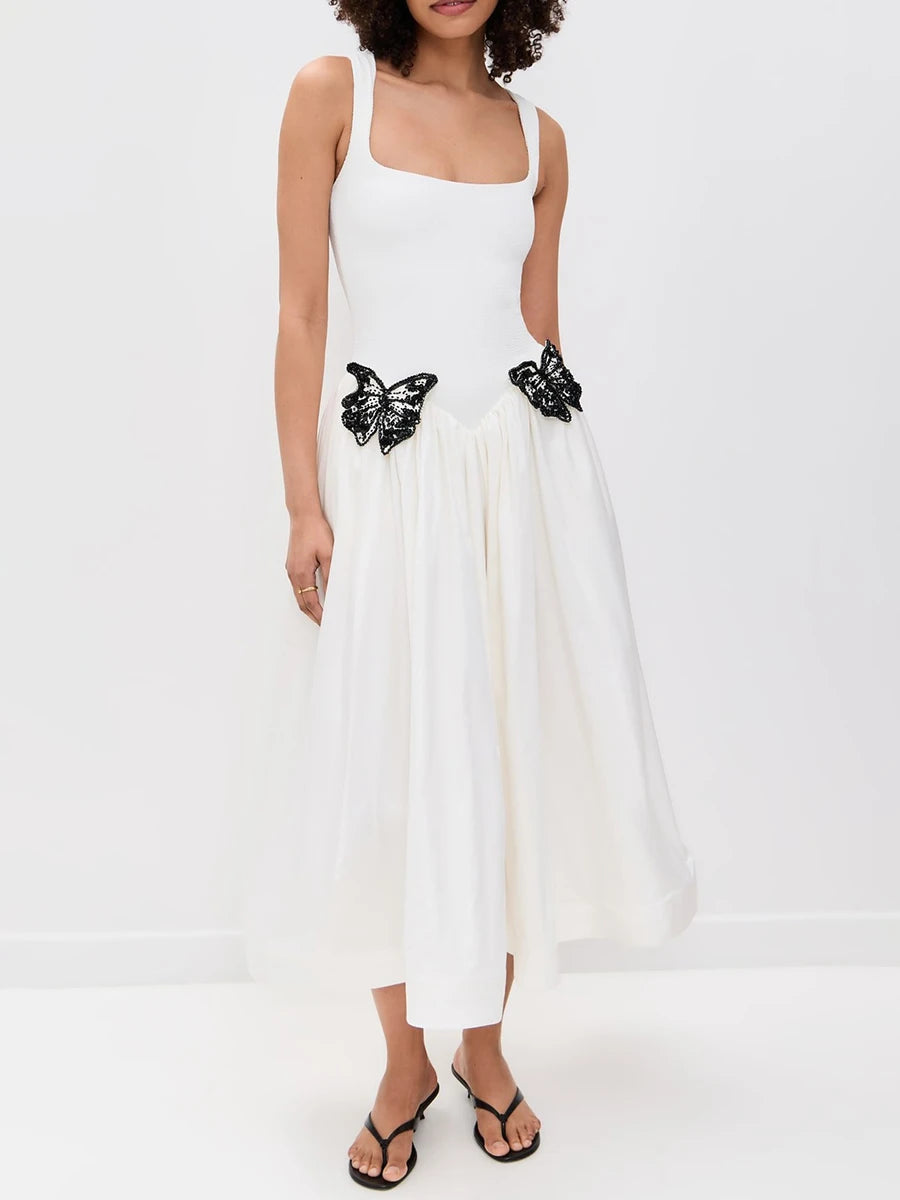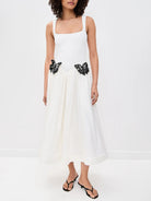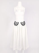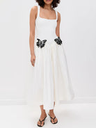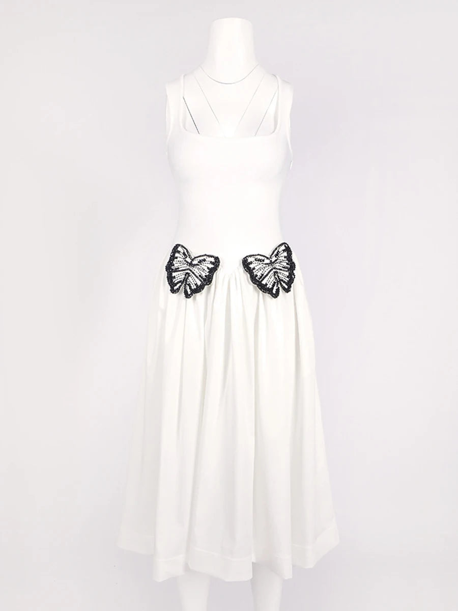 Elevate your wardrobe with the Trend4us Butterfly Embellished White Midi Dress, a graceful fusion of elegance and charm. Crafted from a smooth white fabric, this sleeveless midi dress features a fitted bodice with delicate shoulder straps and a flowing pleated skirt. Two hand-sewn black sequin butterfly embellishments at the waist add a striking contrast, highlighting feminine curves with an artistic touch. Perfect for special occasions, evening gatherings, or statement daywear, this dress brings timeless sophistication with a modern twist.