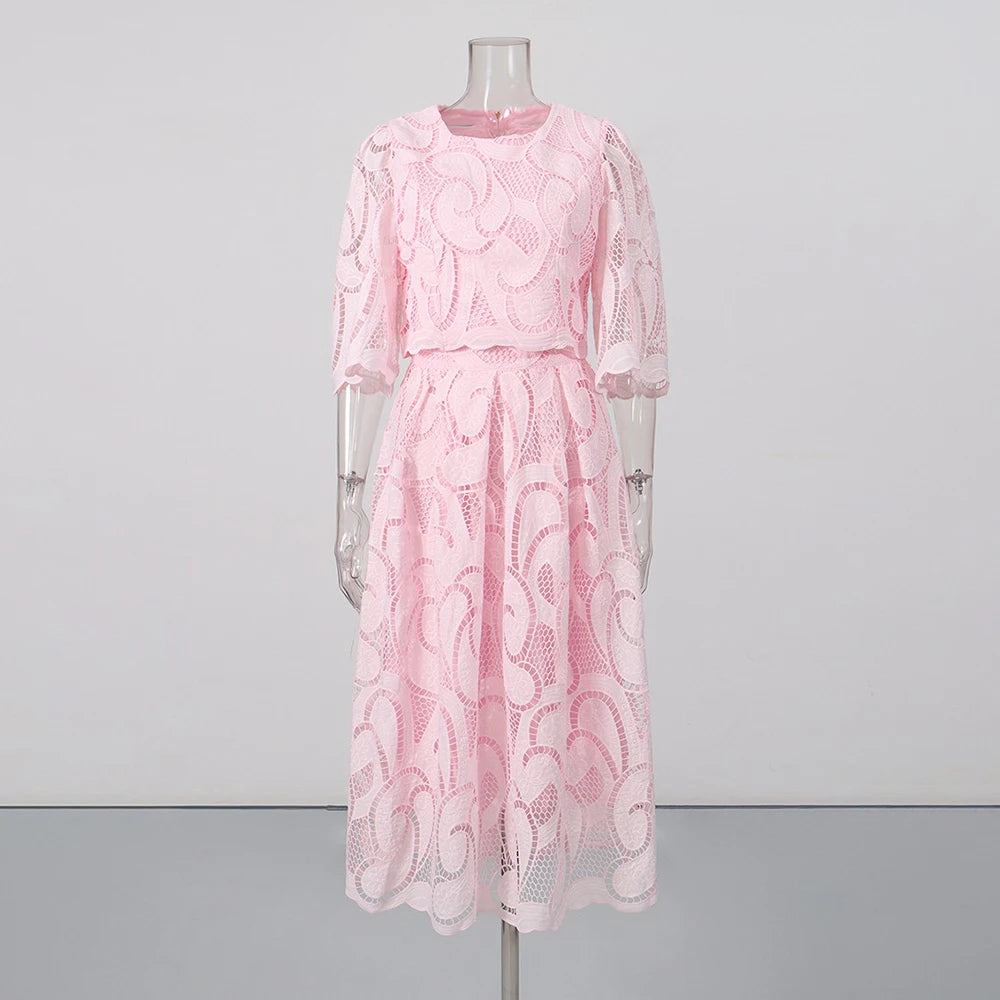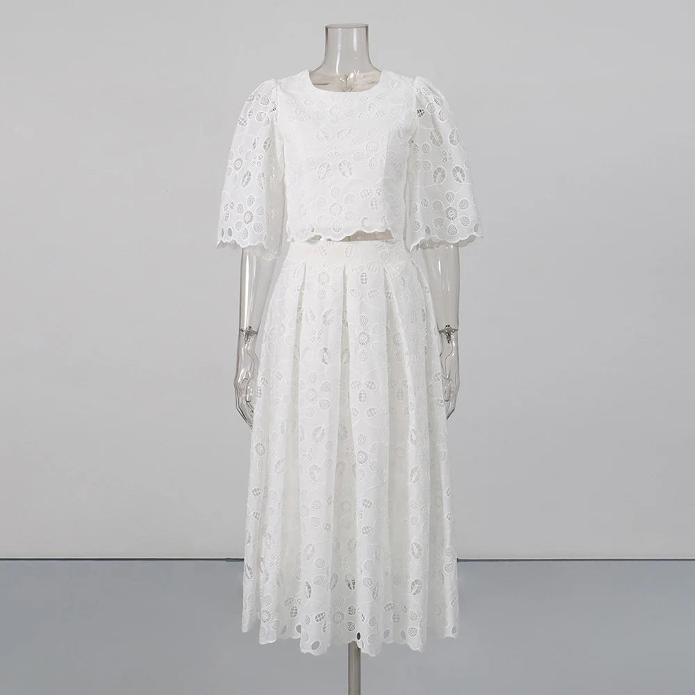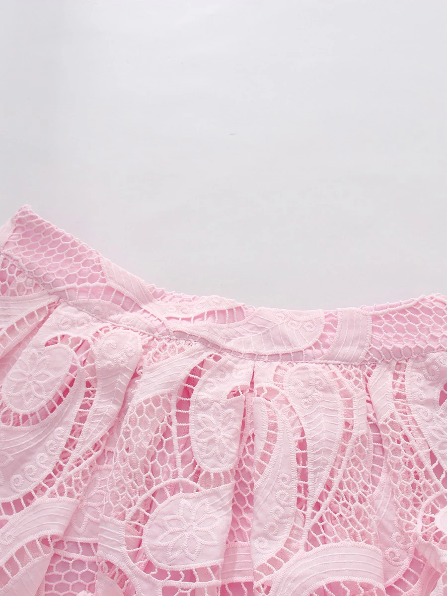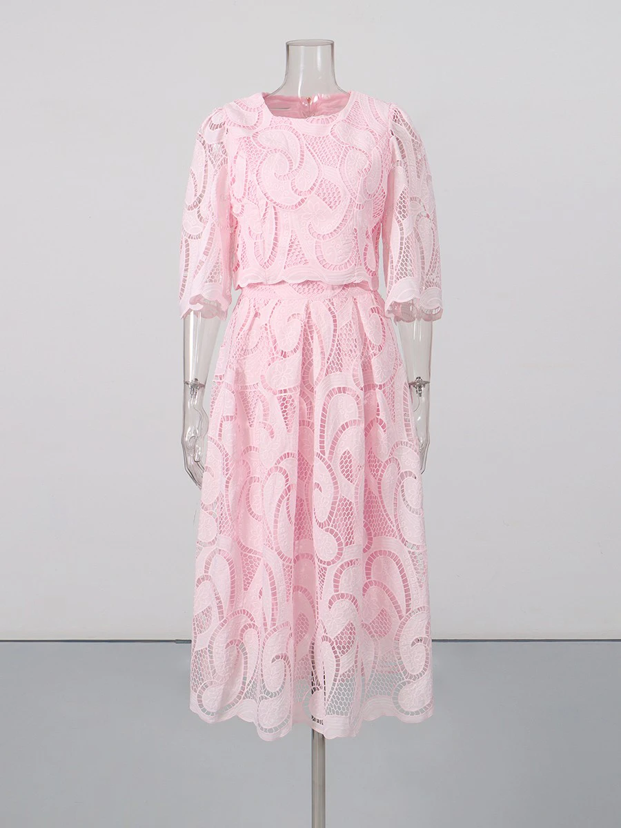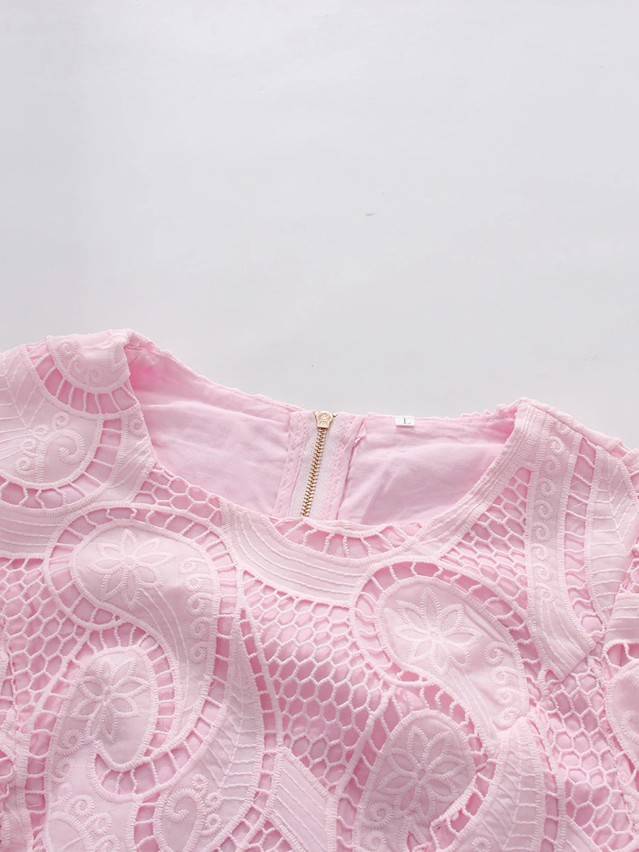 Feminine elegance, effortlessly coordinated — this chic embroidered lace short-sleeve top and A-line skirt two-piece set is a wardrobe essential that brings a romantic, occasion-ready sophistication to the classic co-ord silhouette. Delicate embroidered lace detailing is woven across both pieces with a rich, artisanal quality that adds a lush, three-dimensional texture to the fabric, creating a look that feels both luxurious and effortlessly chic. The short-sleeve top features a clean round neckline that keeps the look fresh and versatile, while the coordinating A-line skirt creates a seamless, head-to-toe look with a sweeping, fluid silhouette that flatters every figure with a graceful, feminine ease. Together, the set delivers a polished, put-together elegance that transitions beautifully from garden parties and brunches to evening events and special occasions. A zipper closure delivers a seamless, polished finish. Available in White and Pink — two soft, romantic shades that make the embroidered lace truly stand out. Sizes S–XL.