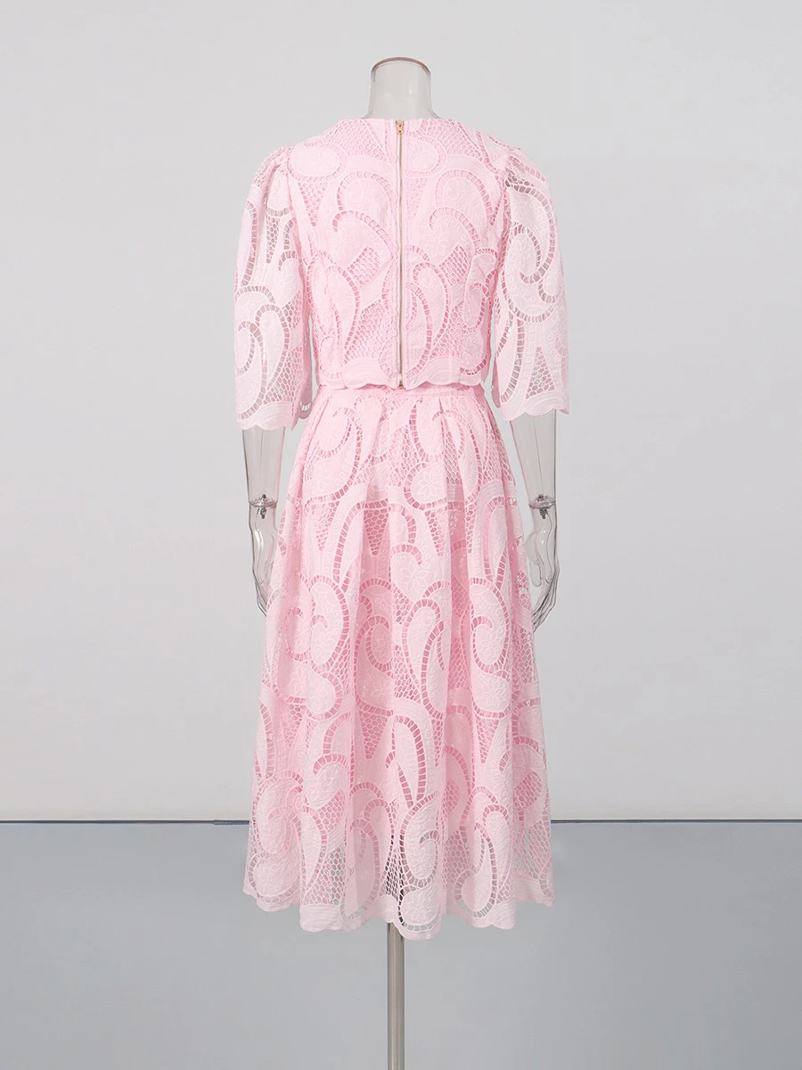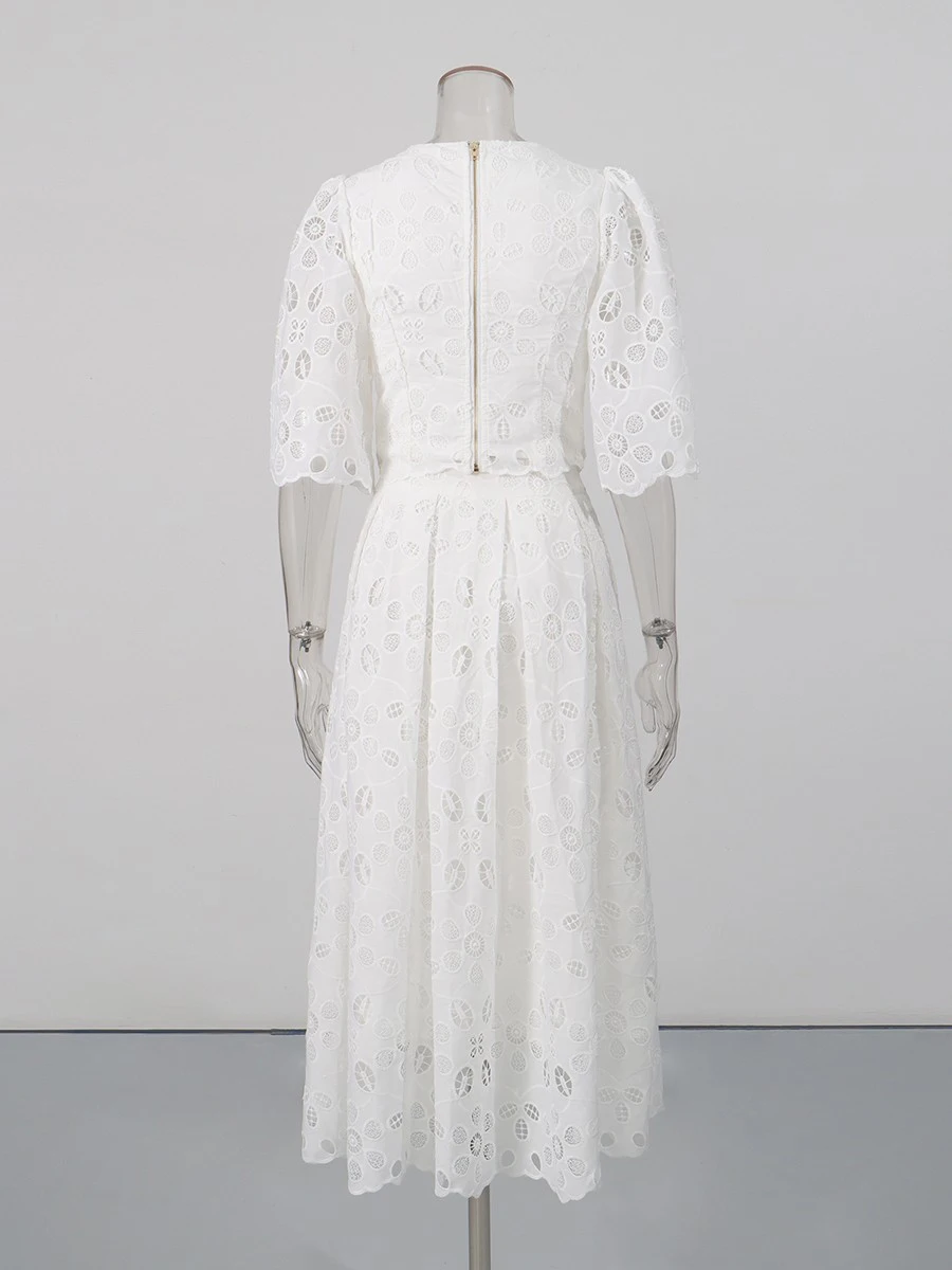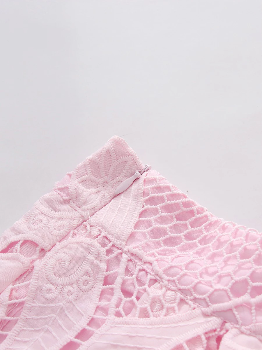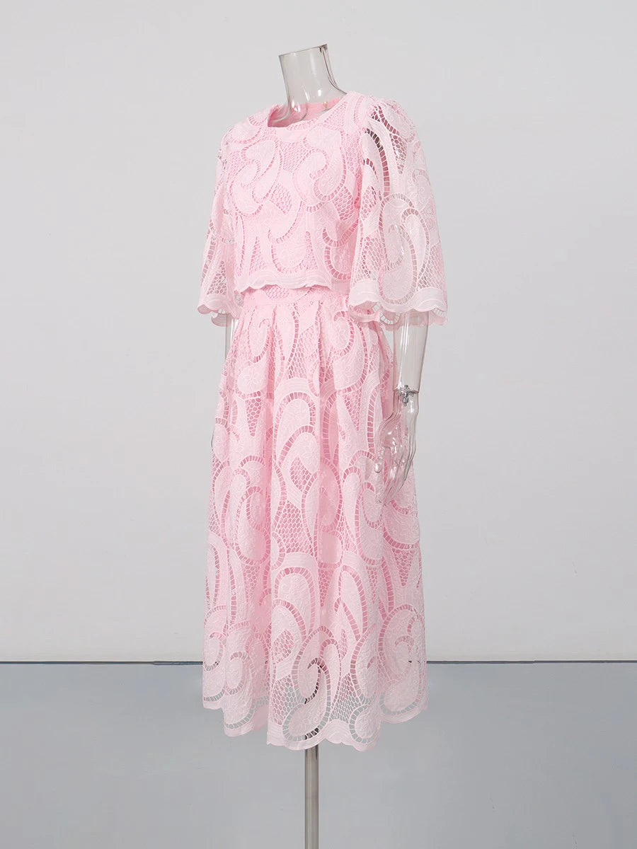 Feminine elegance, effortlessly coordinated — this chic embroidered lace short-sleeve top and A-line skirt two-piece set is a wardrobe essential that brings a romantic, occasion-ready sophistication to the classic co-ord silhouette. Delicate embroidered lace detailing is woven across both pieces with a rich, artisanal quality that adds a lush, three-dimensional texture to the fabric, creating a look that feels both luxurious and effortlessly chic. The short-sleeve top features a clean round neckline that keeps the look fresh and versatile, while the coordinating A-line skirt creates a seamless, head-to-toe look with a sweeping, fluid silhouette that flatters every figure with a graceful, feminine ease. Together, the set delivers a polished, put-together elegance that transitions beautifully from garden parties and brunches to evening events and special occasions. A zipper closure delivers a seamless, polished finish. Available in White and Pink — two soft, romantic shades that make the embroidered lace truly stand out. Sizes S–XL.