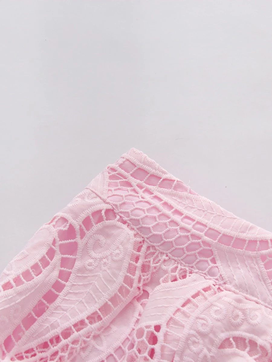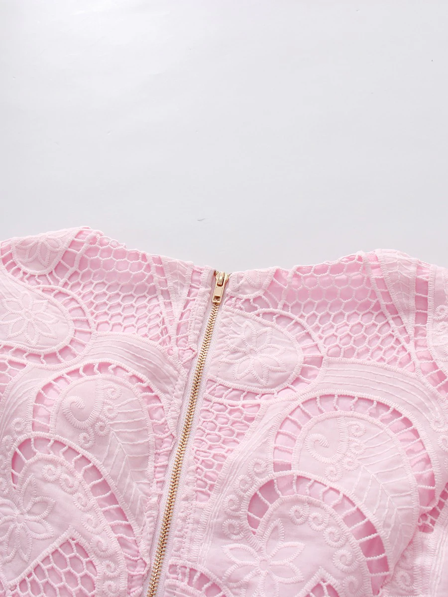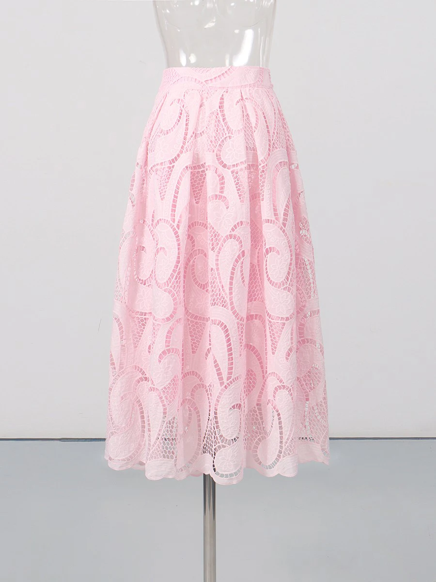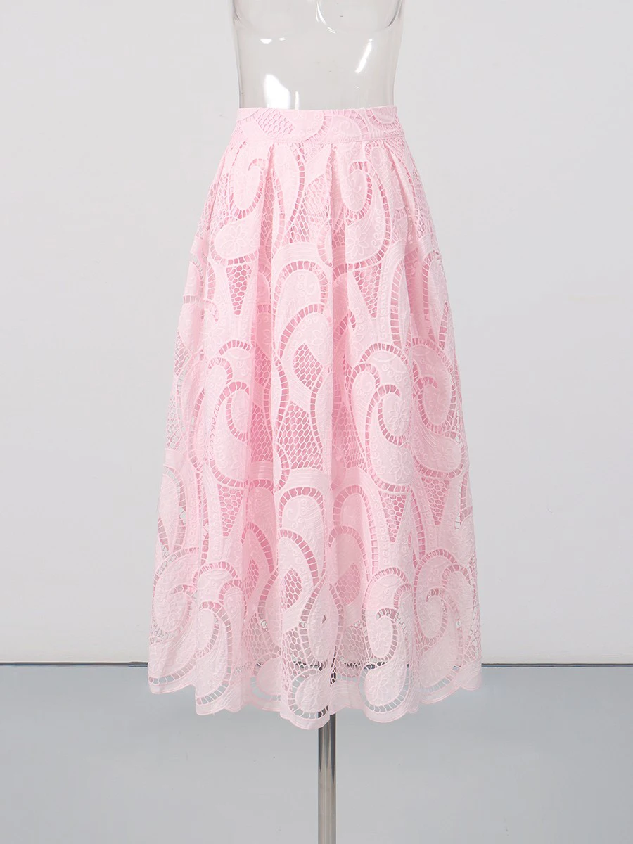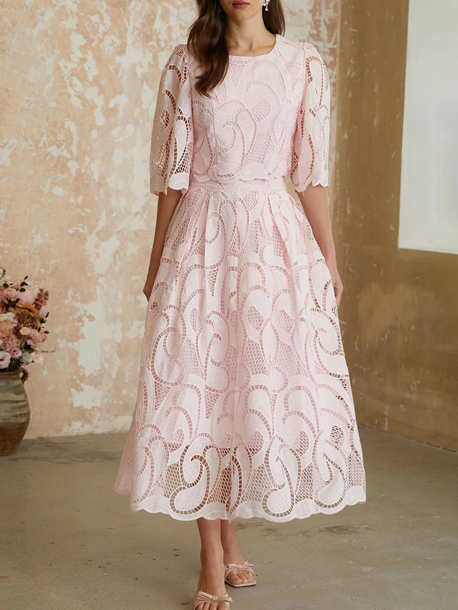 Feminine elegance, effortlessly coordinated — this chic embroidered lace short-sleeve top and A-line skirt two-piece set is a wardrobe essential that brings a romantic, occasion-ready sophistication to the classic co-ord silhouette. Delicate embroidered lace detailing is woven across both pieces with a rich, artisanal quality that adds a lush, three-dimensional texture to the fabric, creating a look that feels both luxurious and effortlessly chic. The short-sleeve top features a clean round neckline that keeps the look fresh and versatile, while the coordinating A-line skirt creates a seamless, head-to-toe look with a sweeping, fluid silhouette that flatters every figure with a graceful, feminine ease. Together, the set delivers a polished, put-together elegance that transitions beautifully from garden parties and brunches to evening events and special occasions. A zipper closure delivers a seamless, polished finish. Available in White and Pink — two soft, romantic shades that make the embroidered lace truly stand out. Sizes S–XL.