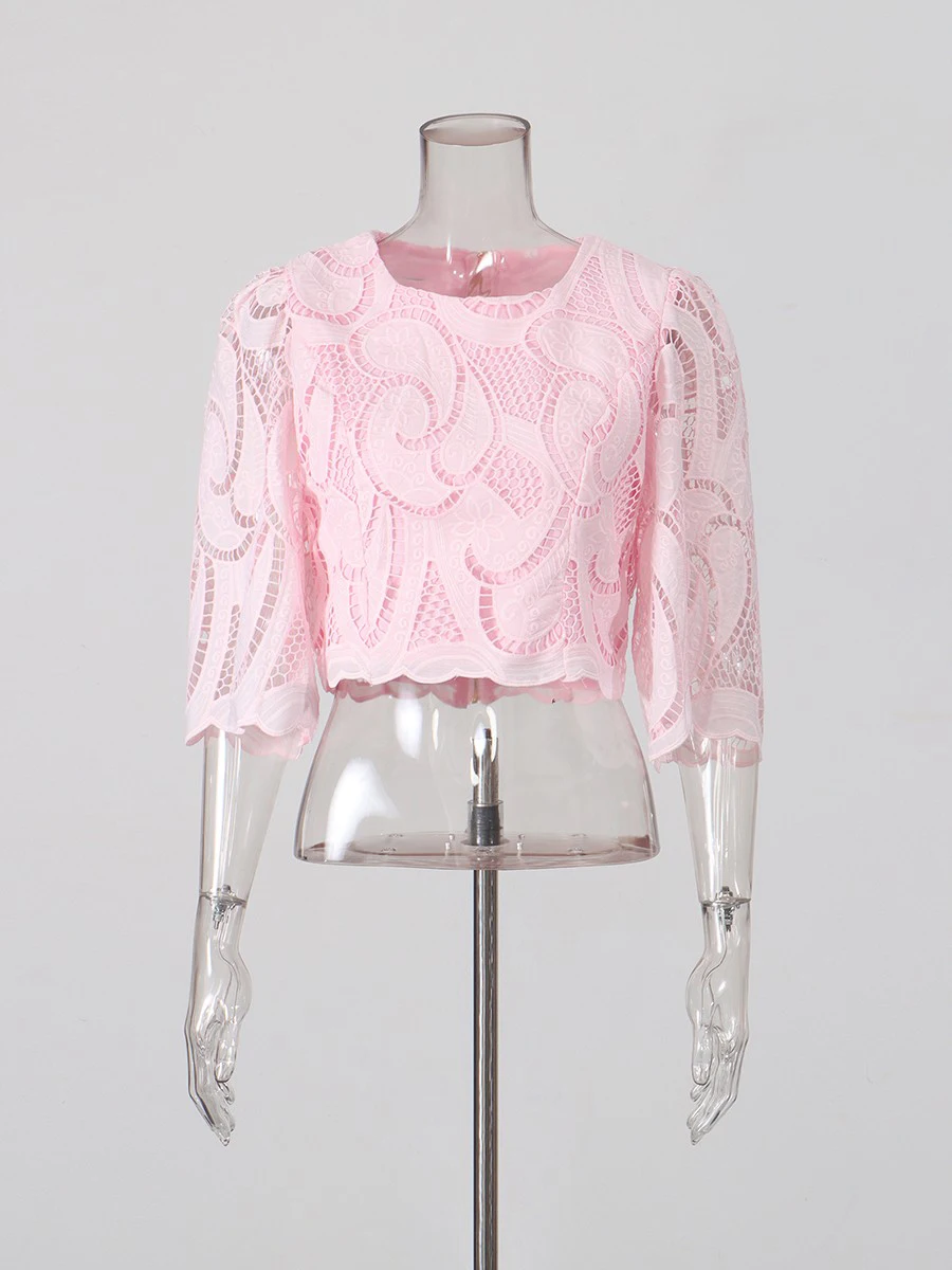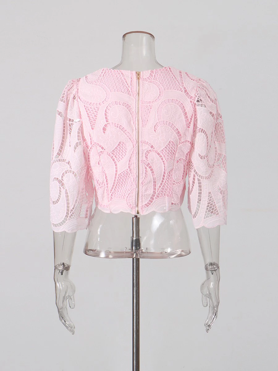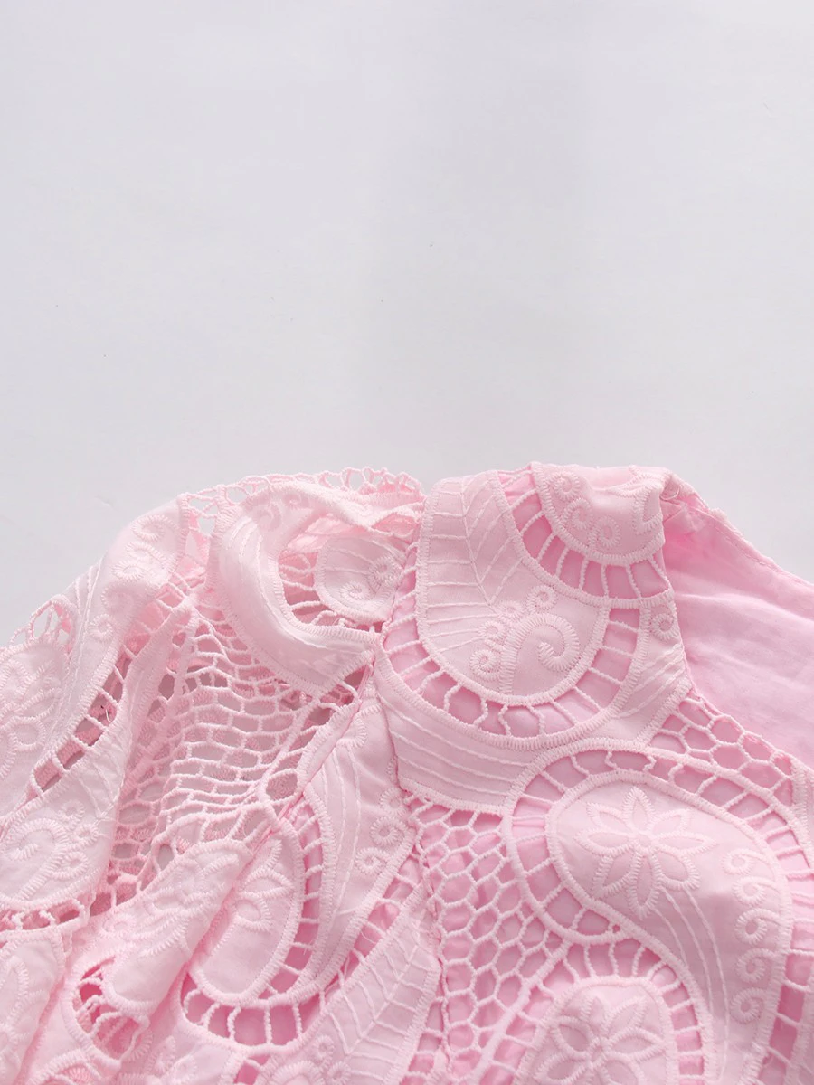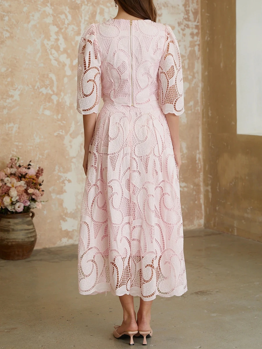 Feminine elegance, effortlessly coordinated — this chic embroidered lace short-sleeve top and A-line skirt two-piece set is a wardrobe essential that brings a romantic, occasion-ready sophistication to the classic co-ord silhouette. Delicate embroidered lace detailing is woven across both pieces with a rich, artisanal quality that adds a lush, three-dimensional texture to the fabric, creating a look that feels both luxurious and effortlessly chic. The short-sleeve top features a clean round neckline that keeps the look fresh and versatile, while the coordinating A-line skirt creates a seamless, head-to-toe look with a sweeping, fluid silhouette that flatters every figure with a graceful, feminine ease. Together, the set delivers a polished, put-together elegance that transitions beautifully from garden parties and brunches to evening events and special occasions. A zipper closure delivers a seamless, polished finish. Available in White and Pink — two soft, romantic shades that make the embroidered lace truly stand out. Sizes S–XL.