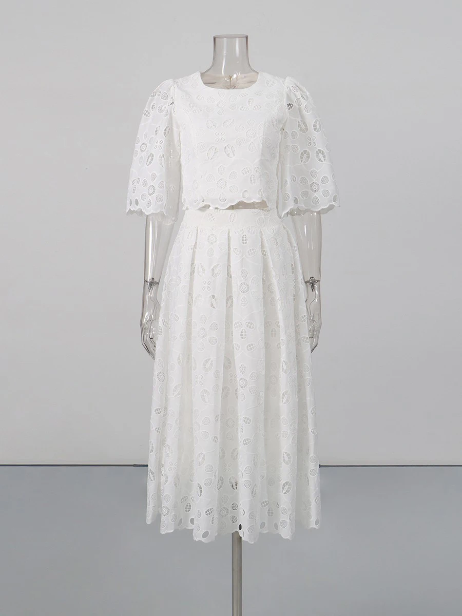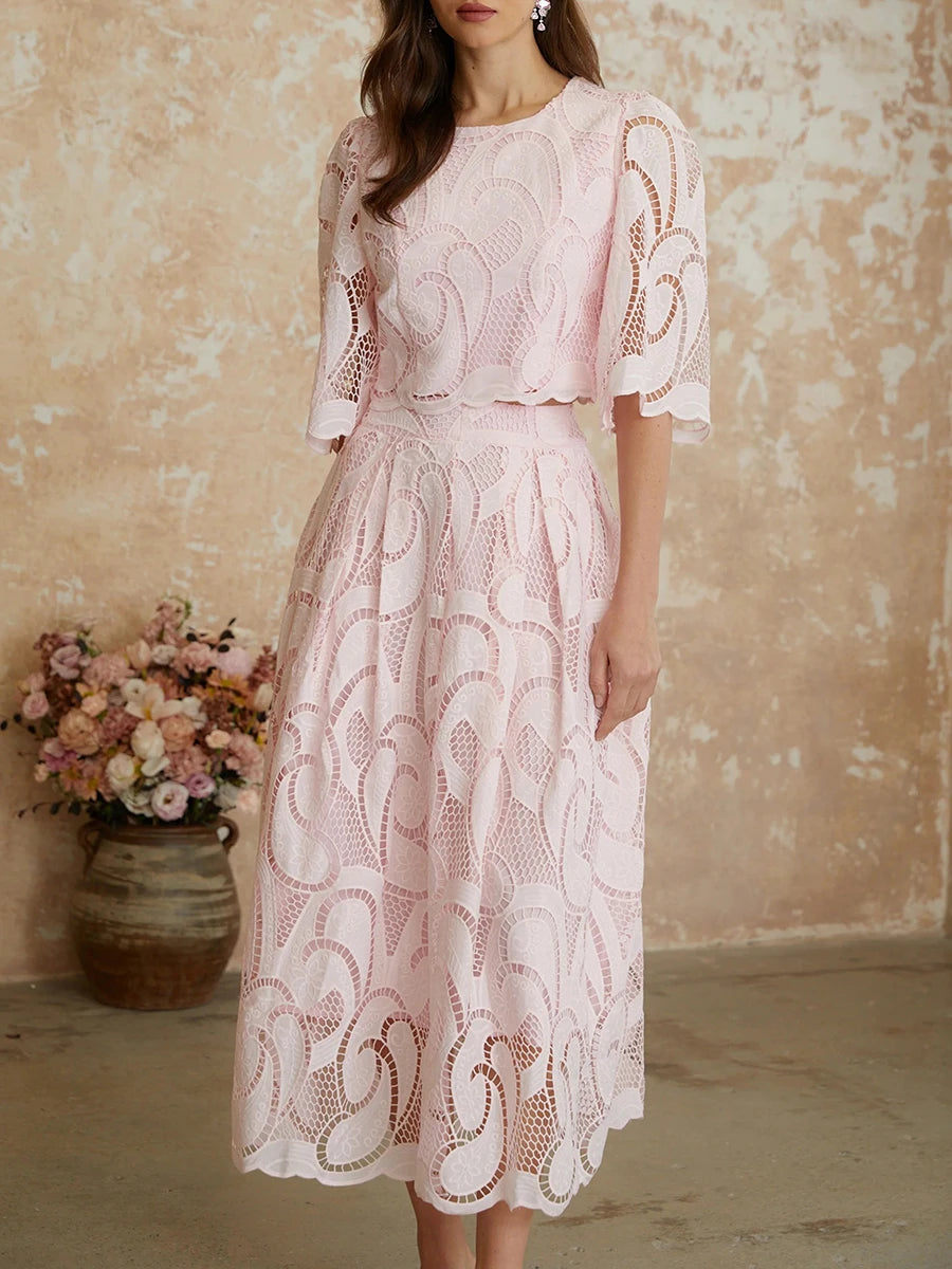 Chic Embroidered Lace Short-Sleeve Top & A-Line Skirt Set