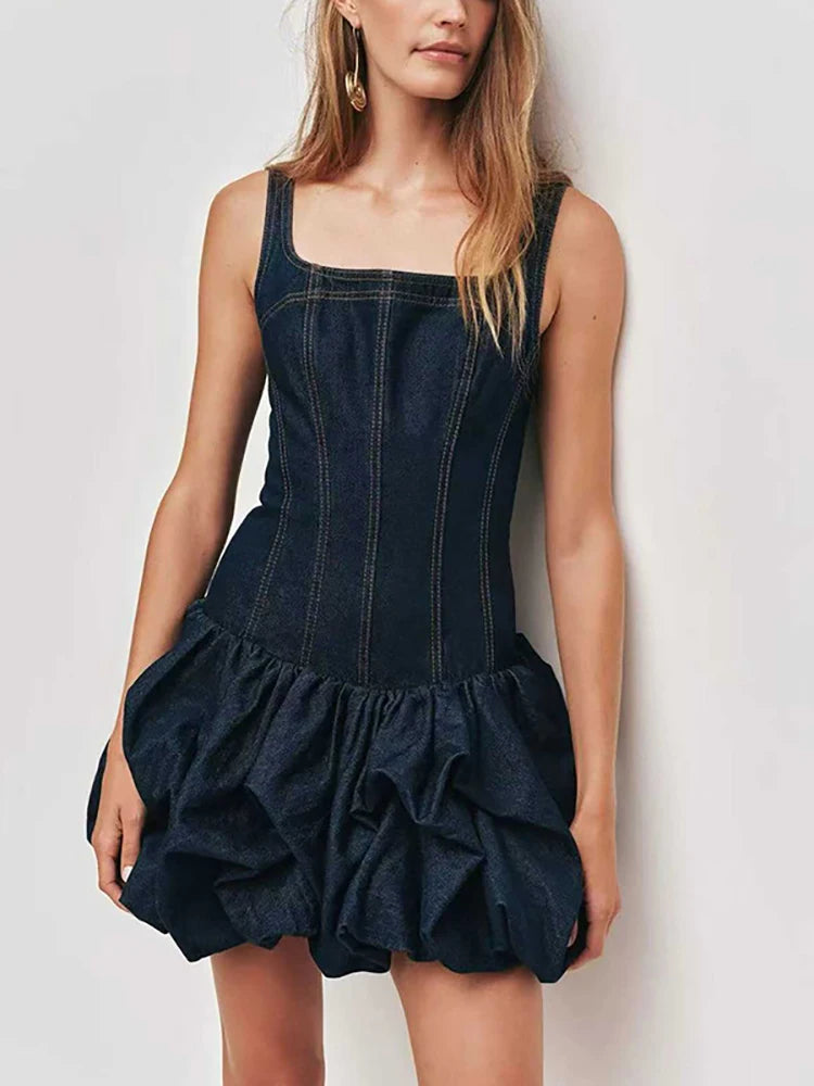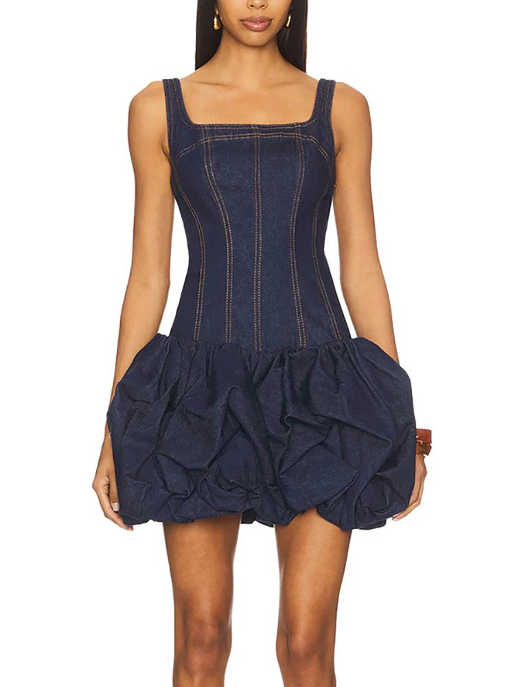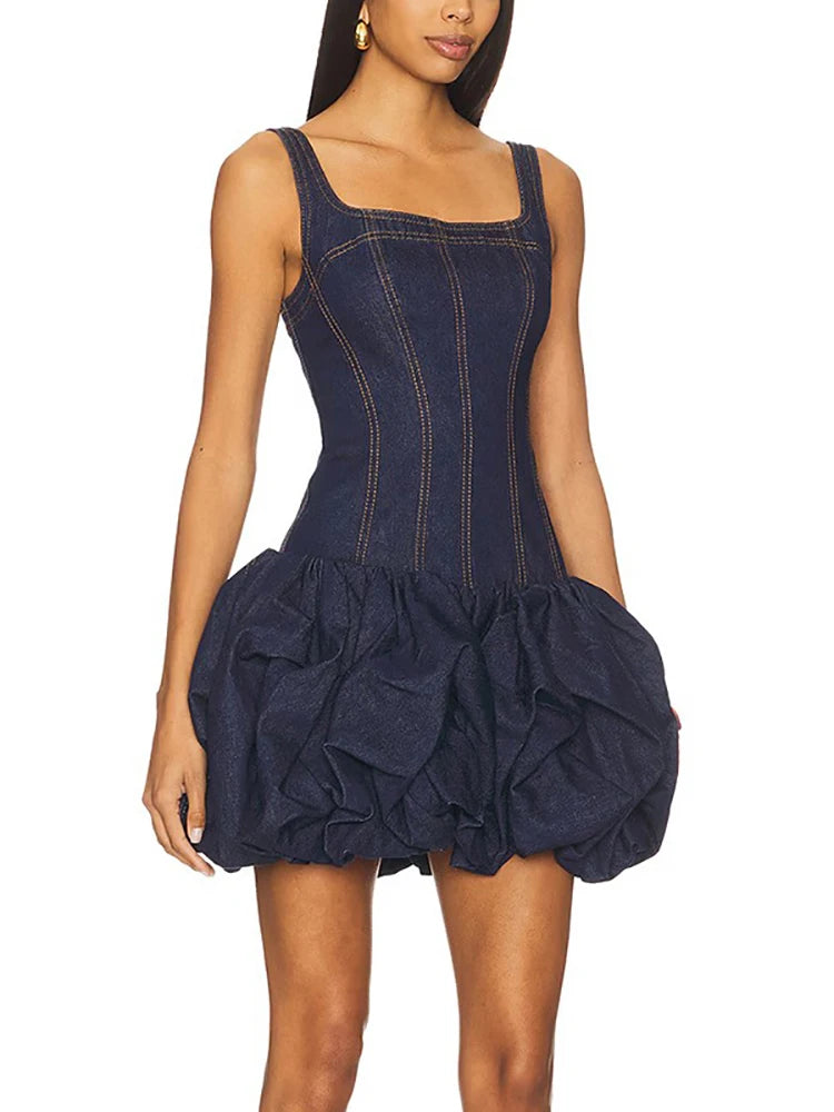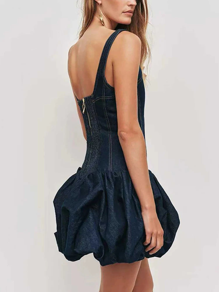 Make a bold statement in this denim corset mini dress featuring a ruched bubble silhouette, square neckline, and asymmetrical cut. A modern slim-fit style that effortlessly blends structure with edge — available in Blue.
