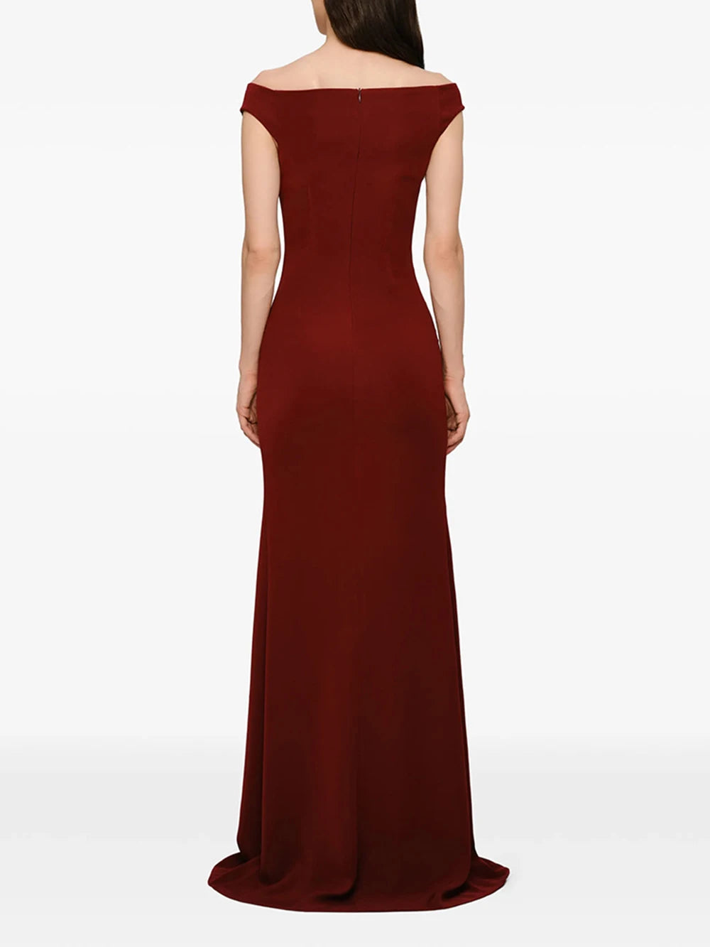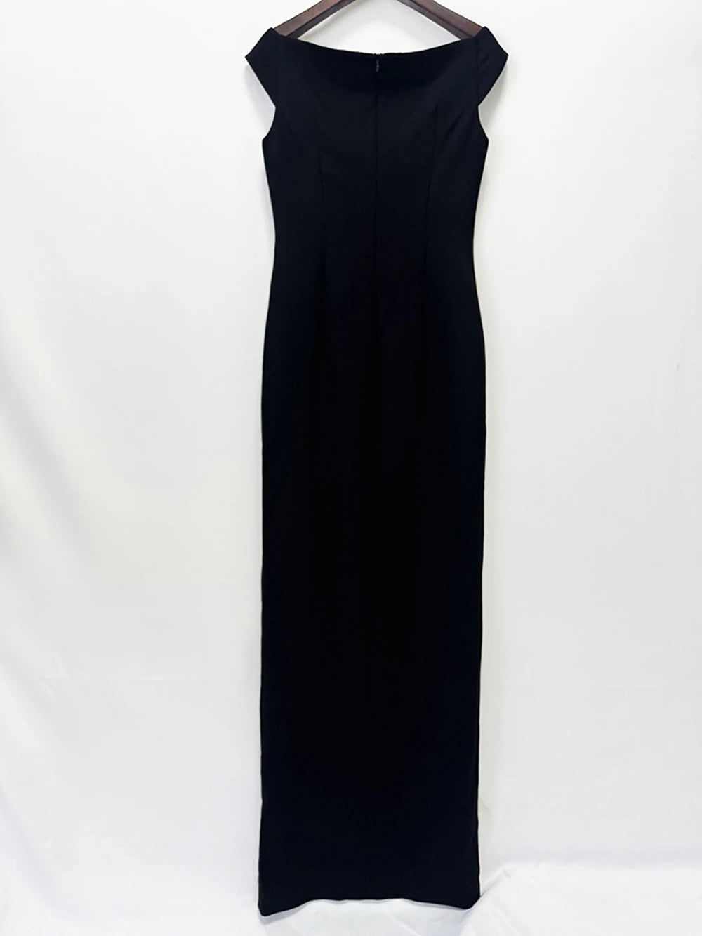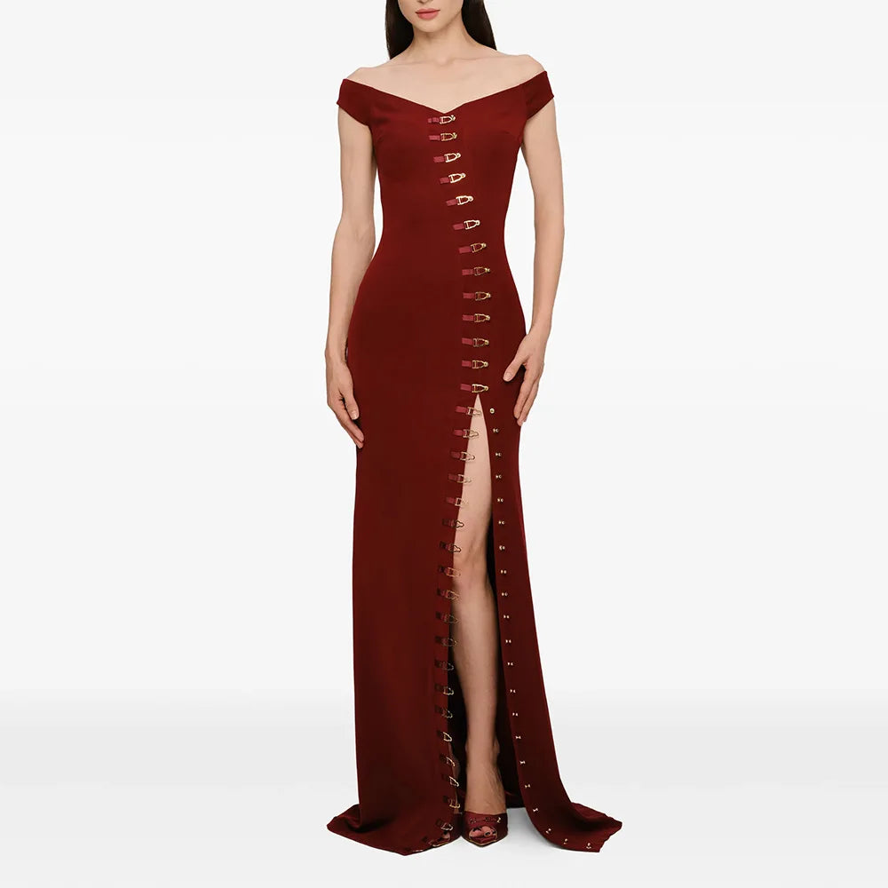 Arrive in pure luxury. This off-shoulder maxi evening dress features a V-neckline, empire waistline, slim sheath silhouette, and a dramatic slit — finished with button detailing for a refined, red-carpet-ready look. Available in Black and Burgundy.
