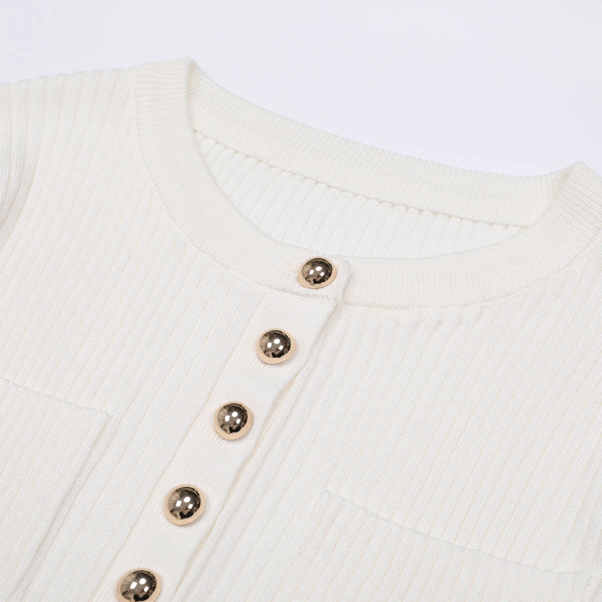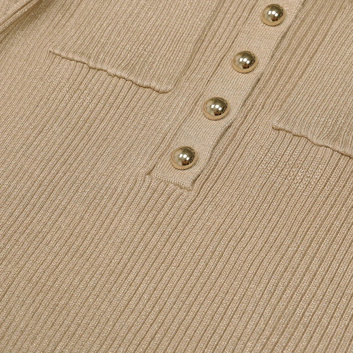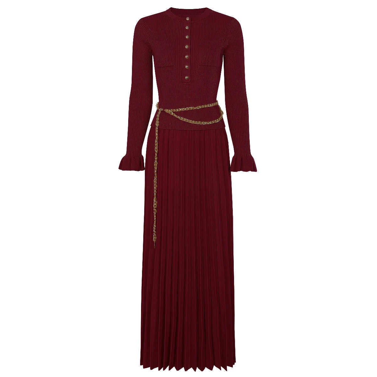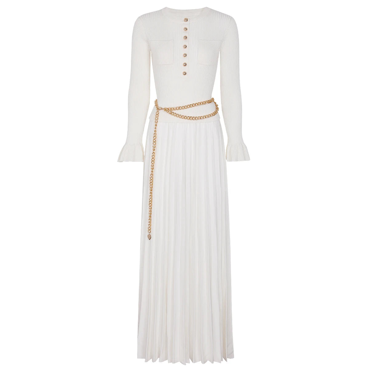 Refined femininity, effortlessly coordinated — this elegant ribbed knit top and pleated maxi skirt two-piece set is a wardrobe essential that brings a timeless, day-to-evening sophistication to the classic co-ord silhouette. The fitted long-sleeve top is crafted from a soft, textured viscose-polyamide ribbed knit with a flattering V-neckline and a delicate button-front detail that adds a polished, modern elegance to the look. A subtle gold chain accent at the waist introduces a touch of luxe, editorial styling that elevates the ensemble with a refined, fashion-forward quality that feels both effortless and intentional. The coordinating pleated maxi skirt drapes beautifully from an elastic waistband, elongating the figure with a fluid, graceful movement that flatters every silhouette with a sweeping, cinematic ease. Together, the set delivers a sophisticated, head-to-toe statement that transitions seamlessly from elevated daywear and office chic to travel and evening occasions.