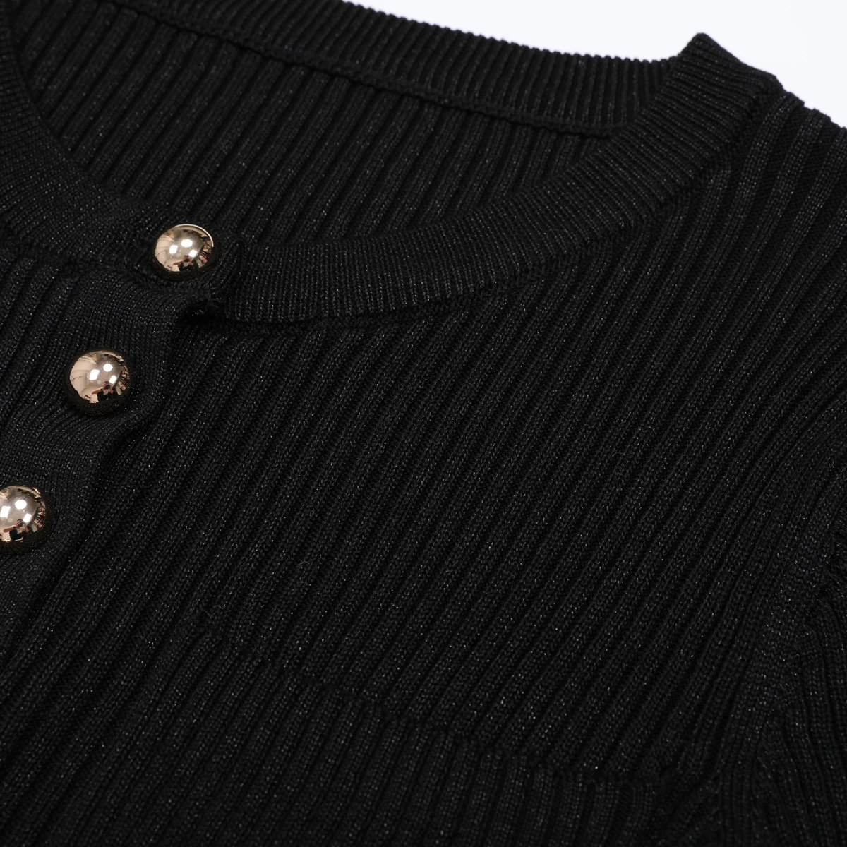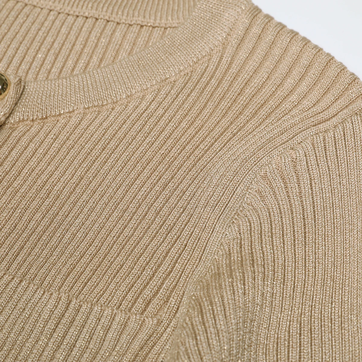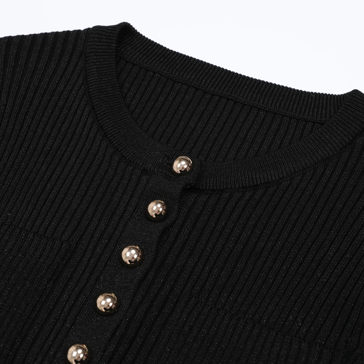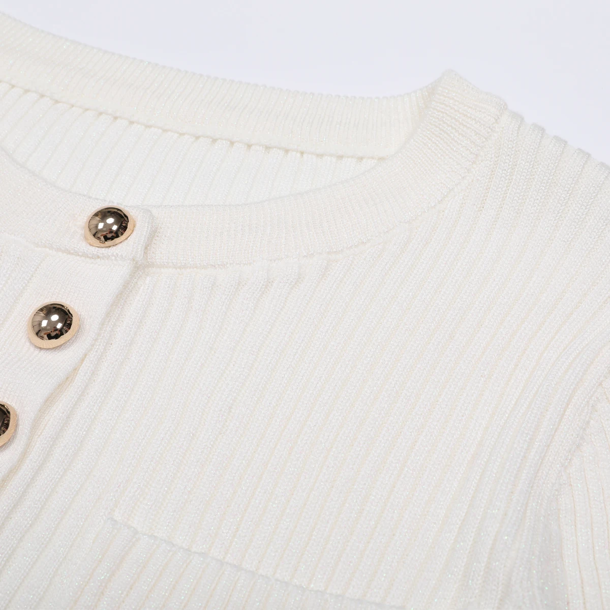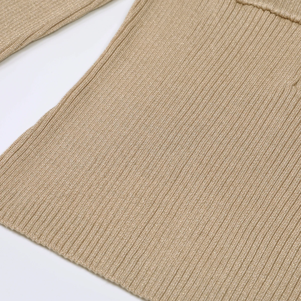 Refined femininity, effortlessly coordinated — this elegant ribbed knit top and pleated maxi skirt two-piece set is a wardrobe essential that brings a timeless, day-to-evening sophistication to the classic co-ord silhouette. The fitted long-sleeve top is crafted from a soft, textured viscose-polyamide ribbed knit with a flattering V-neckline and a delicate button-front detail that adds a polished, modern elegance to the look. A subtle gold chain accent at the waist introduces a touch of luxe, editorial styling that elevates the ensemble with a refined, fashion-forward quality that feels both effortless and intentional. The coordinating pleated maxi skirt drapes beautifully from an elastic waistband, elongating the figure with a fluid, graceful movement that flatters every silhouette with a sweeping, cinematic ease. Together, the set delivers a sophisticated, head-to-toe statement that transitions seamlessly from elevated daywear and office chic to travel and evening occasions.