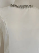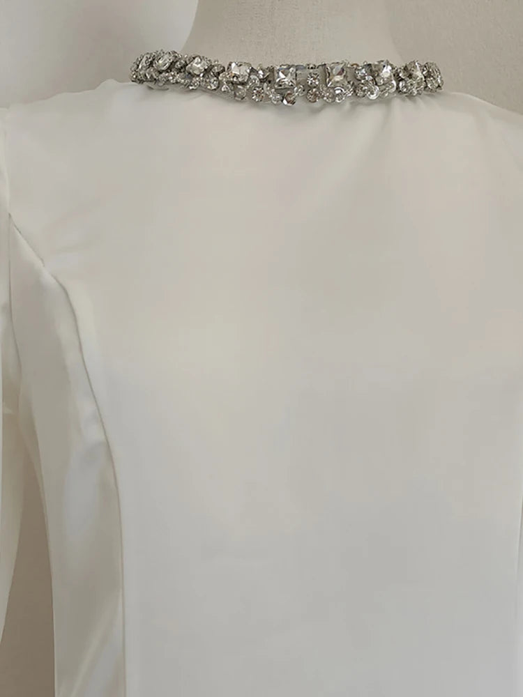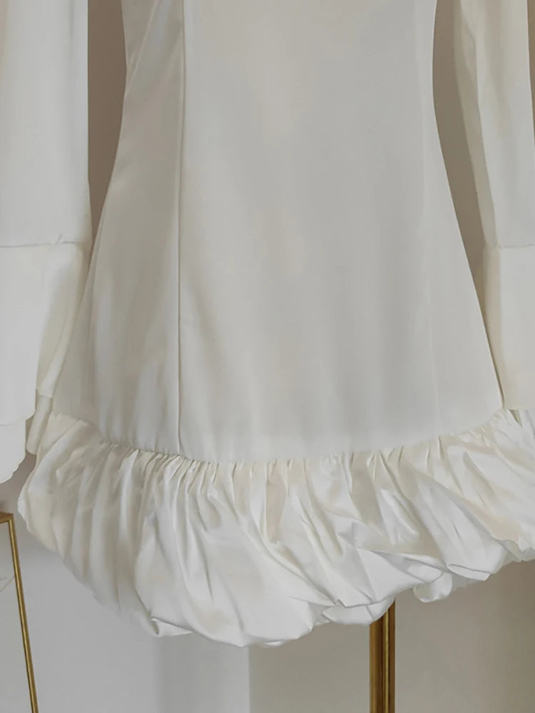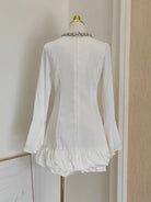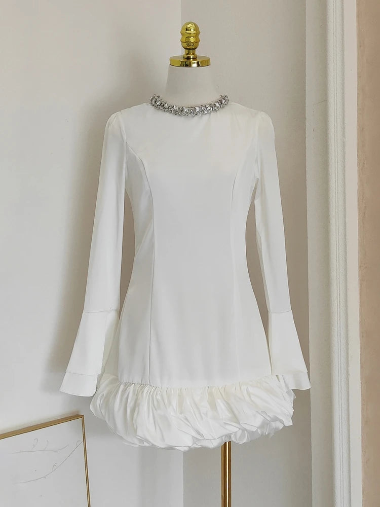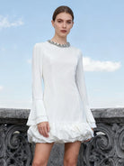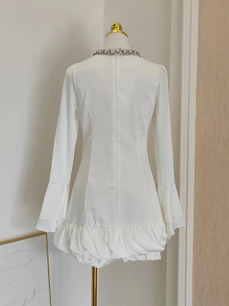 Make a statement with the Trend4us Luxe Crystal-Embellished Ruffled Hem Mini Dress, a masterpiece of modern elegance and sophistication. Crafted from premium satin-blend fabric, this white mini dress features a sculpted fit, sparkling crystal neckline, and dramatic flared cuffs for an elevated, couture-inspired finish. The voluminous bubble-style ruffled hem adds playful movement and dimension, creating a refined yet fashion-forward look.