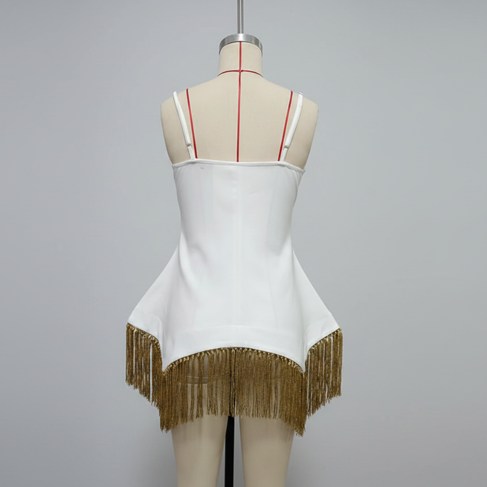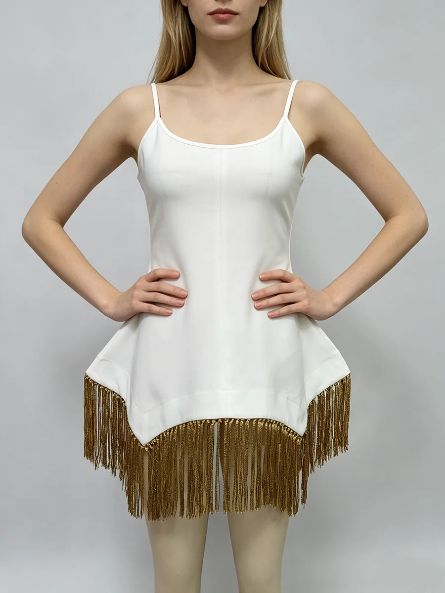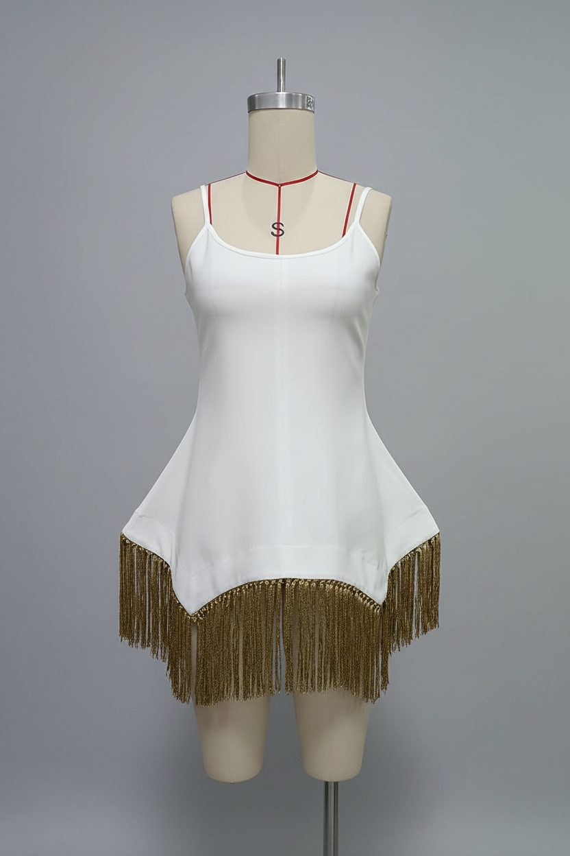 Own the room in the Trend4us Luxe Fringe Hem Slip Mini Dress. The sleek slip silhouette and playful fringe tassel hem create a look that is effortlessly cool and undeniably chic — a perfect balance of understated elegance and statement-making energy. The slight stretch woven fabric moves beautifully with the body, making this dress as comfortable as it is captivating.
