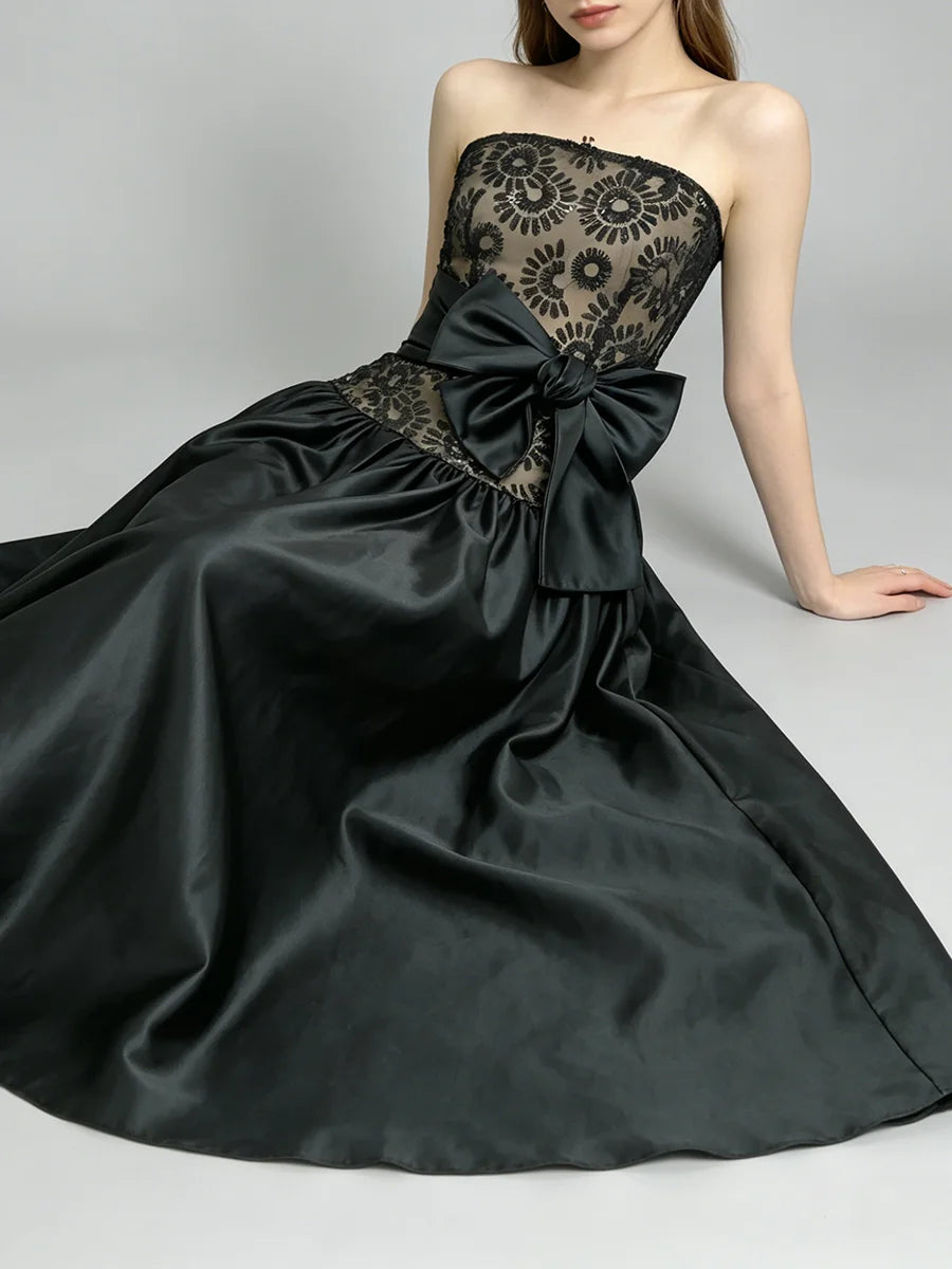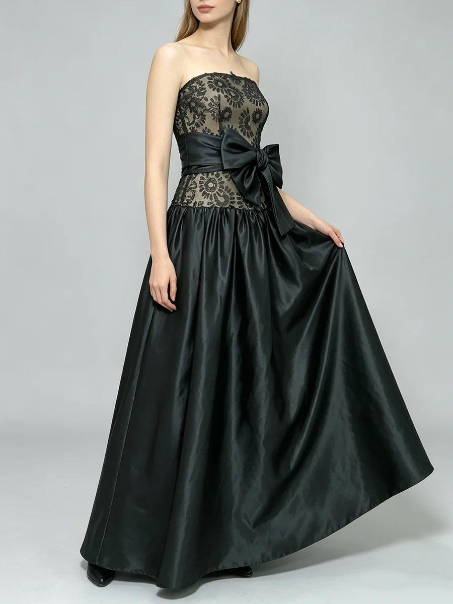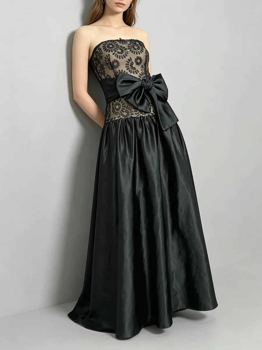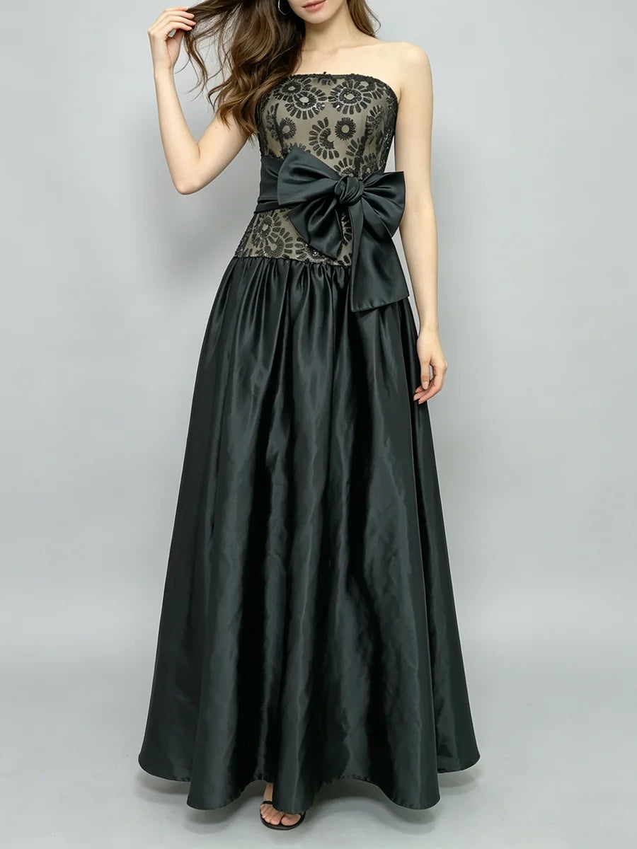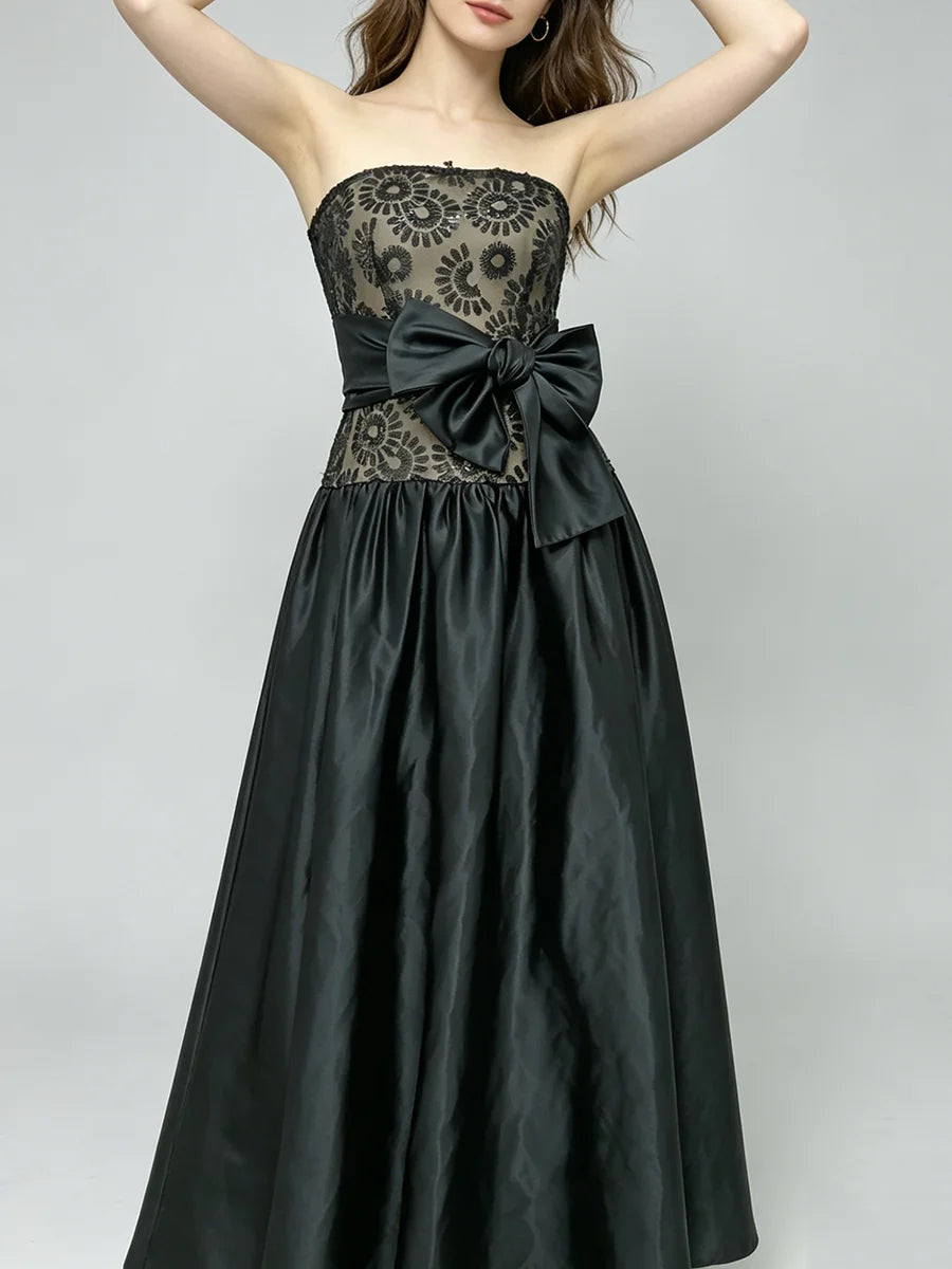 Command the room in this luxe sequin bow waist strapless maxi evening dress. The all-over sequin patchwork catches every light, while the dramatic bow waist detail and empire waistline create a flattering, feminine silhouette. The strapless A-line cut flows gracefully to mid-calf length — a showstopping choice for galas, weddings, formal dinners, and special occasions. Available in Black.