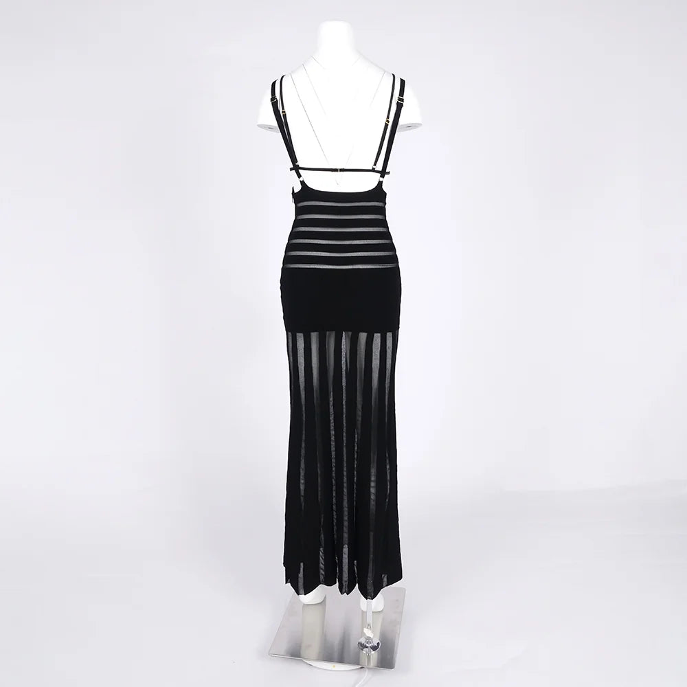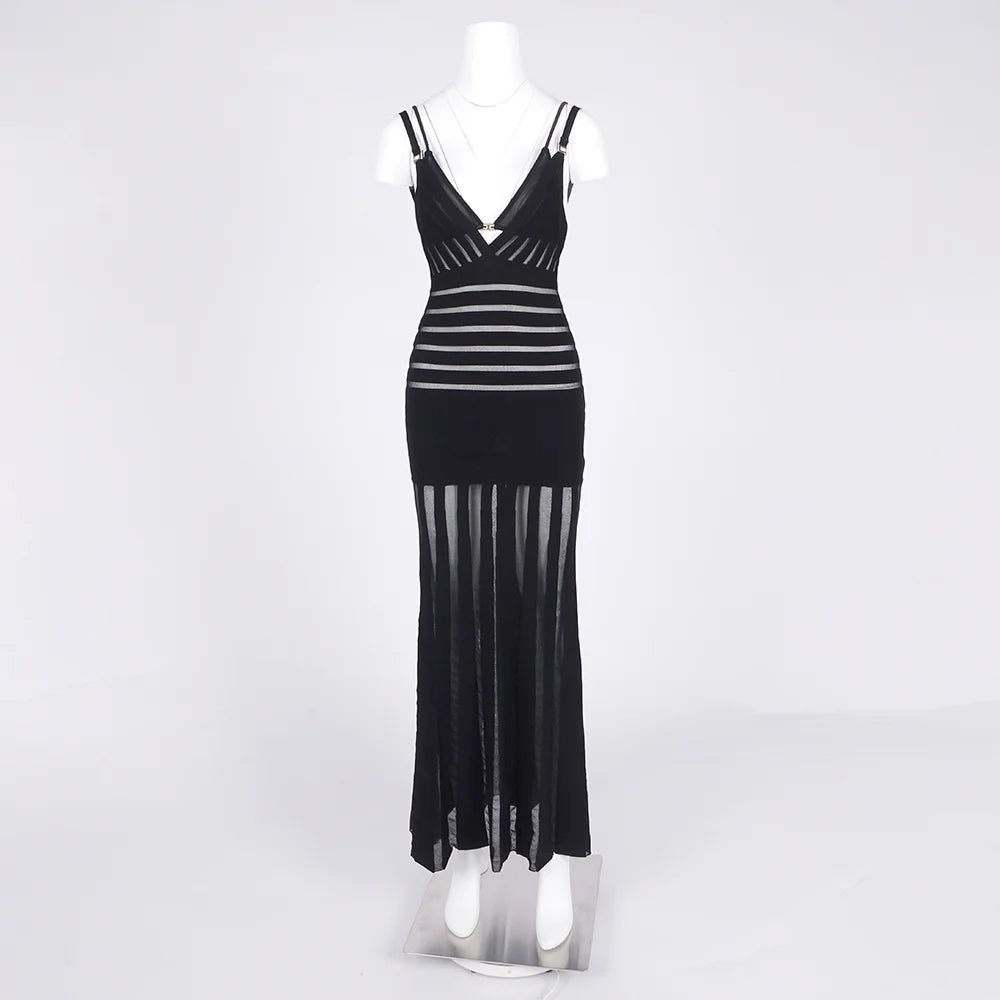 The deep V-neckline and delicate multi-strap shoulders frame your décolletage with precision, while the backless design delivers an irresistible touch of glamour. Horizontal contour lines at the waist sculpt your curves before flowing into a dramatic flared hem — sheer vertical panels catching the light with every step.