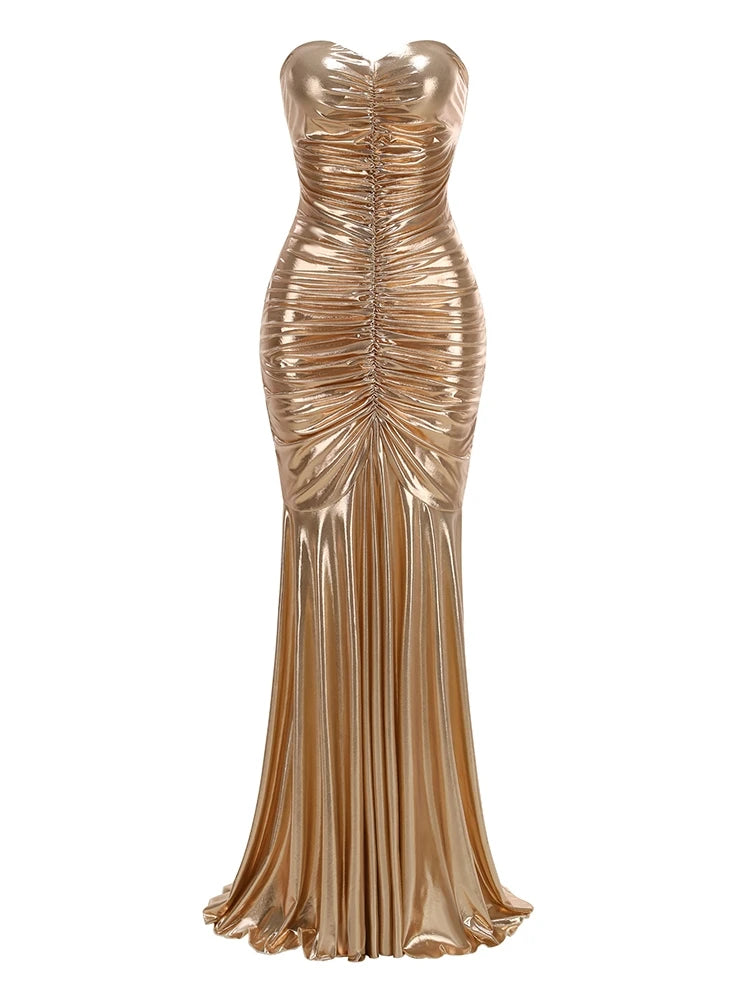 Trend4us Luxe Metallic Gold Ruched Strapless Mermaid Gown