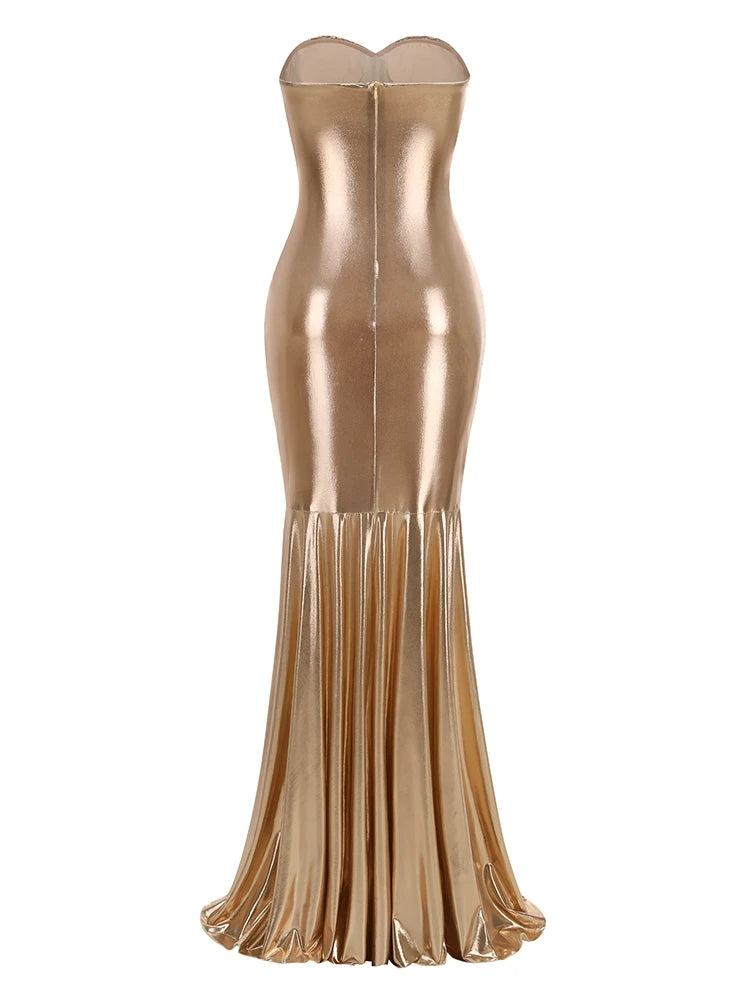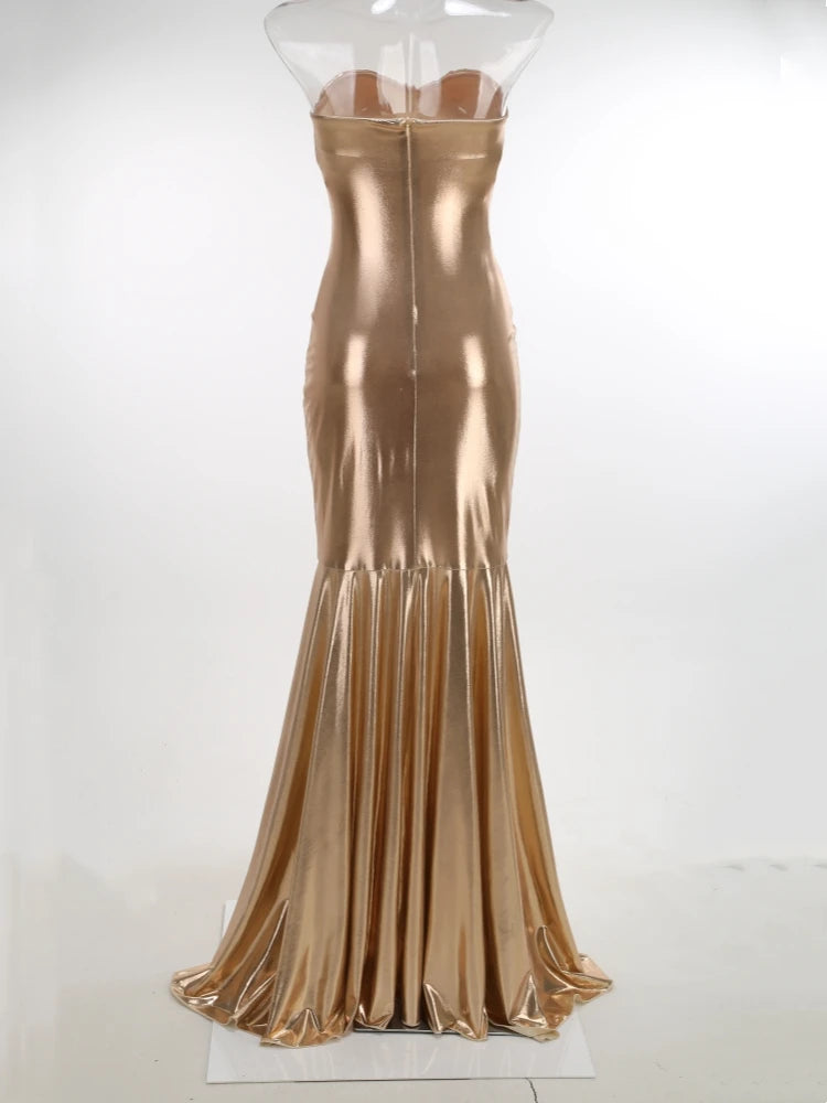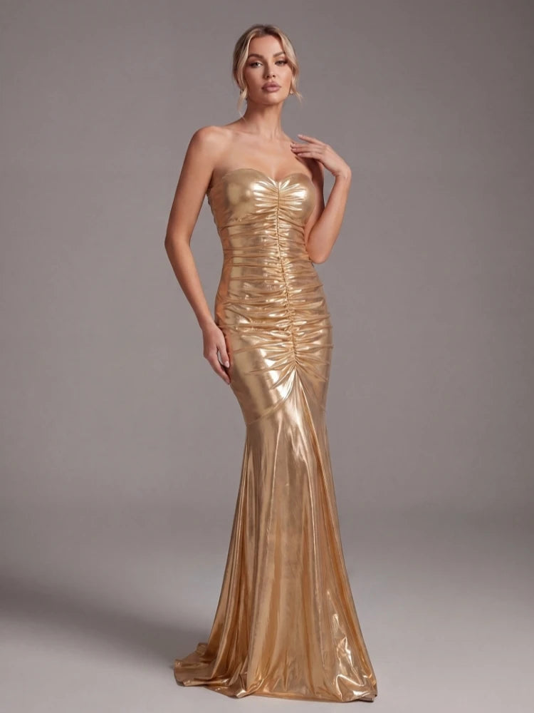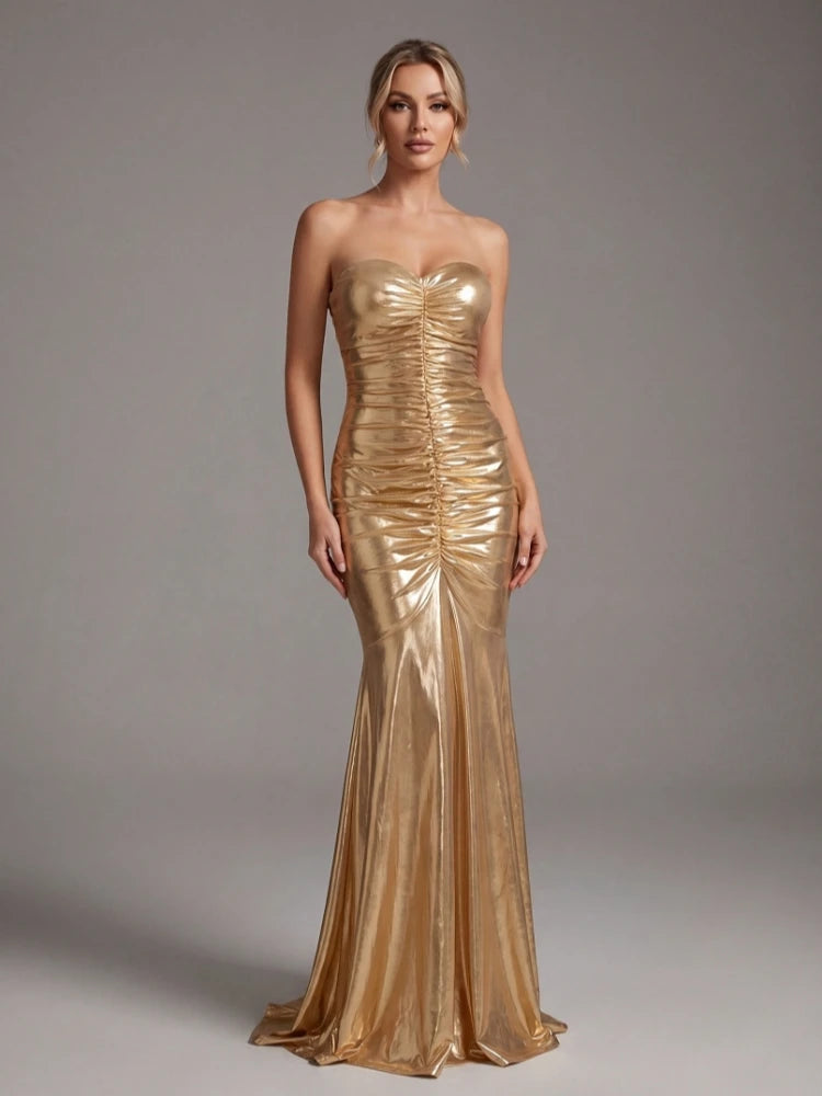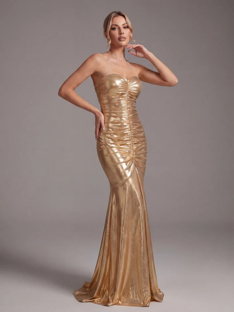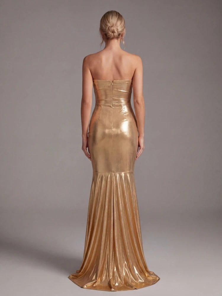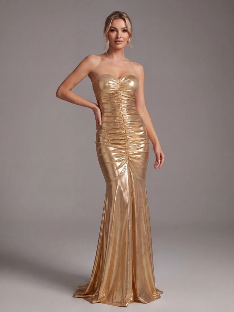 Make a statement in this floor-length metallic gold mermaid gown. Crafted from sleek polyester with a ruched silhouette, strapless neckline, and zipper closure — designed to turn heads at any evening event.
