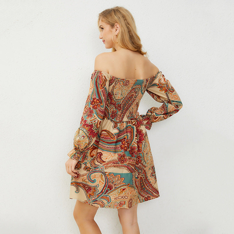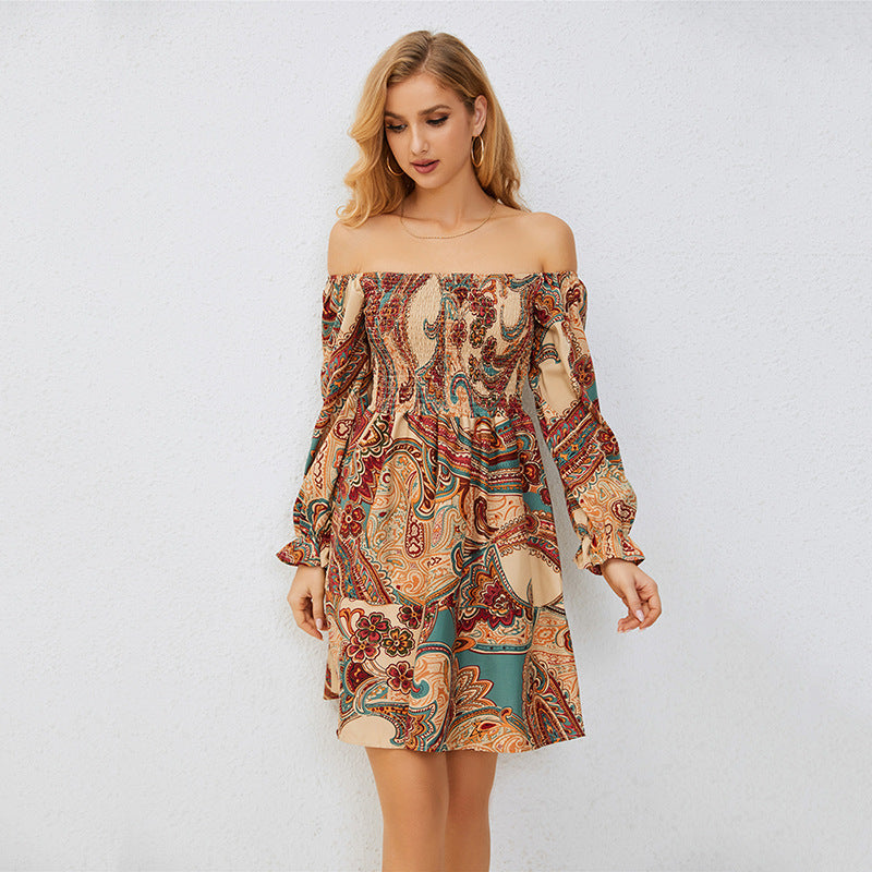 Trend4us Retro Bohemian Print Off-Shoulder Dress