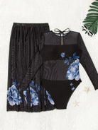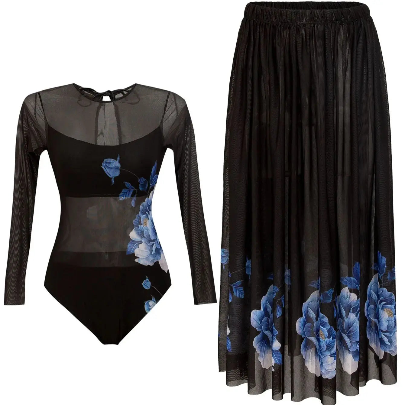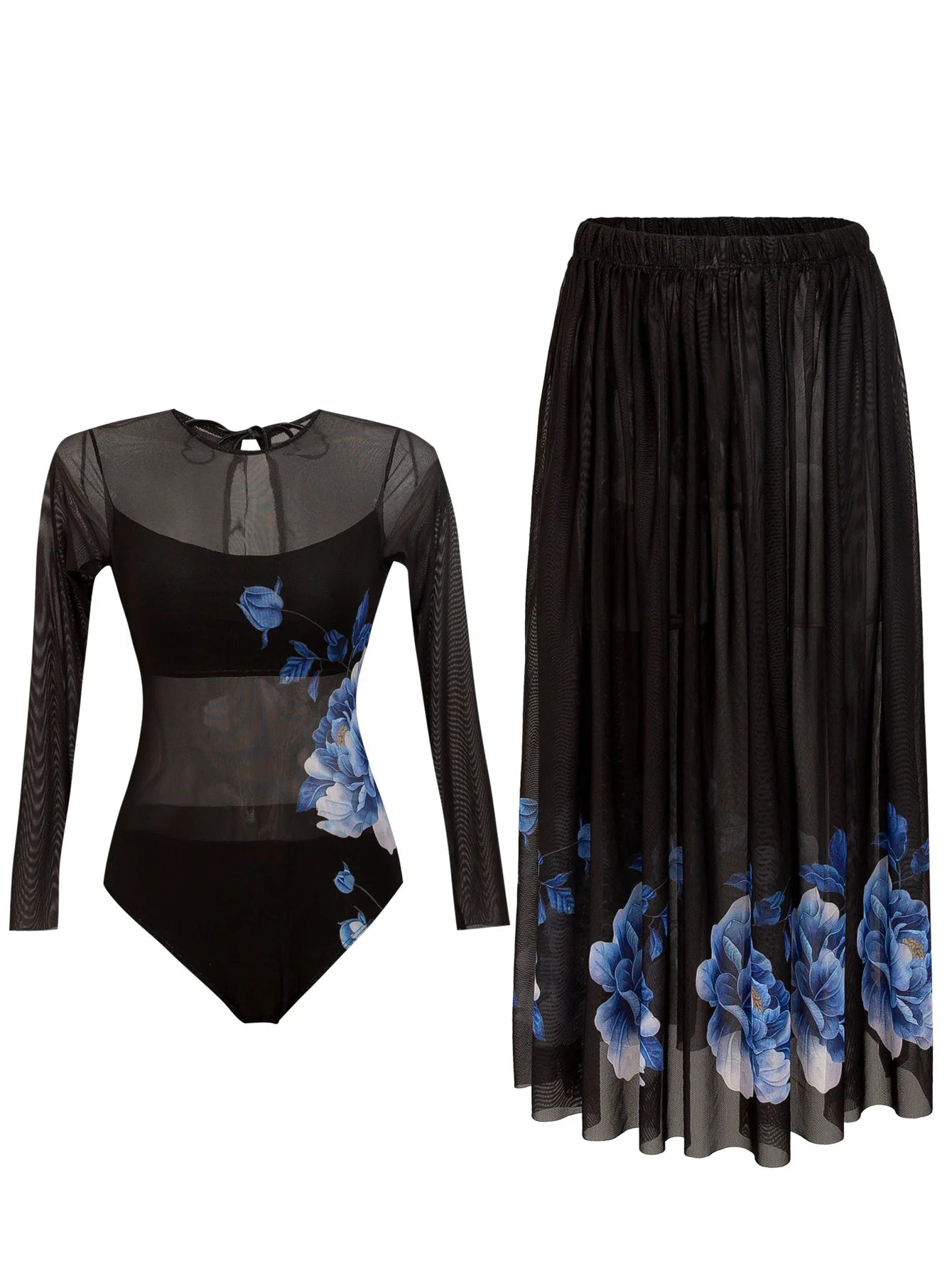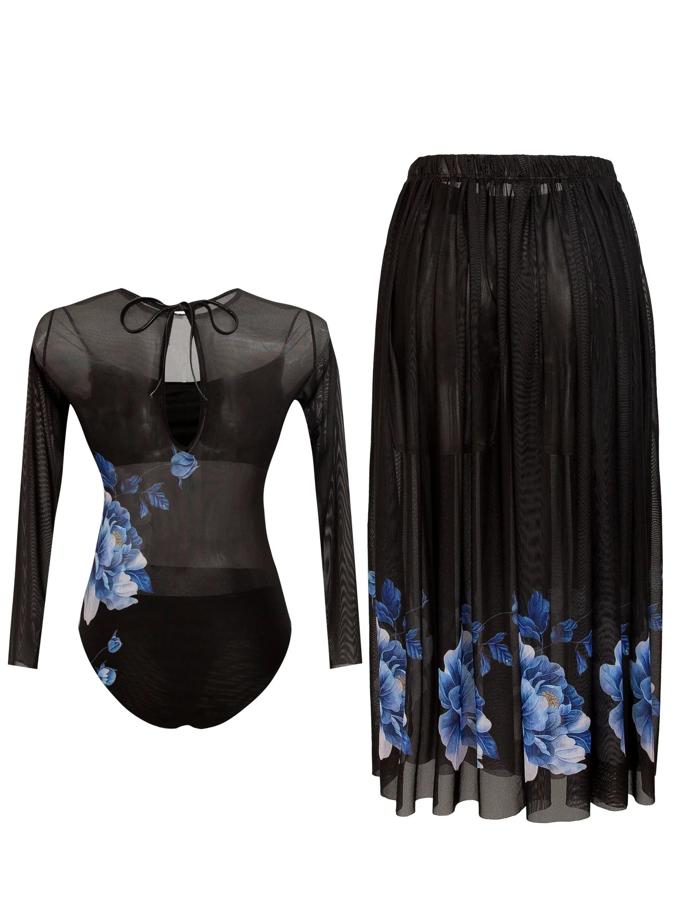 Trend4us Sheer Mesh Floral Bodysuit & Pleated Skirt Two-Piece Set