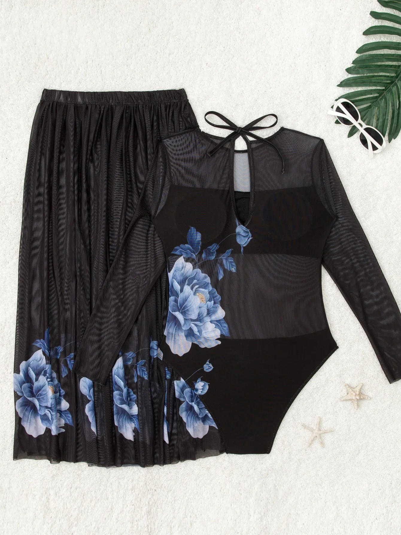 Effortlessly elegant and resort-ready, this sheer mesh floral bodysuit and pleated skirt two-piece set is a standout beach-to-dinner look. The high-neck sheer bodysuit features delicate floral detailing for a romantic, feminine touch, while the flowing pleated skirt adds graceful movement and coverage. A perfect set for beach occasions, vacations, and special events.