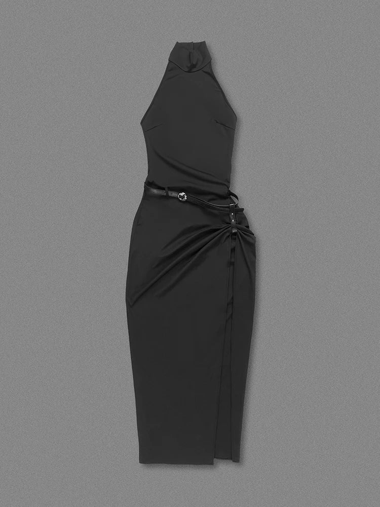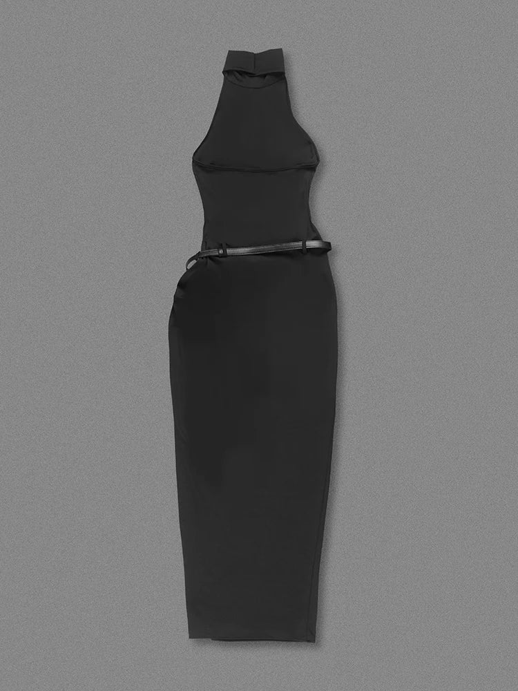 Trend4us Sleek Halter Backless Belted Slit Dress
