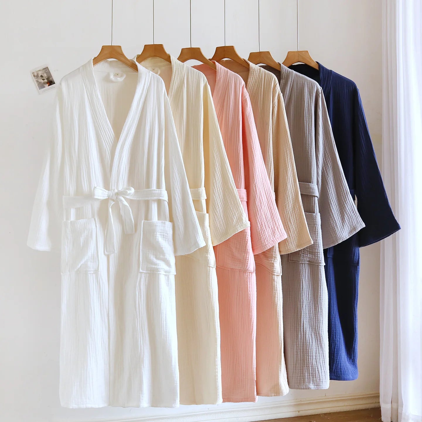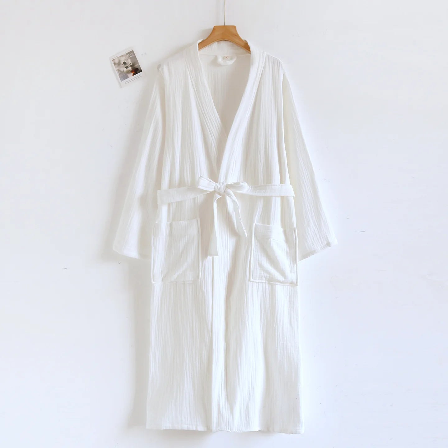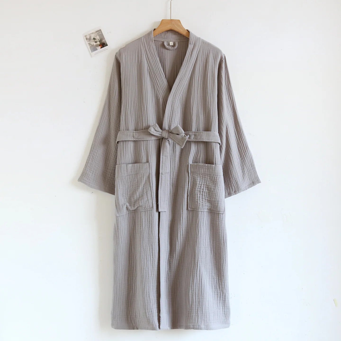 This robe embodies the essence of relaxed luxury. Imagine stepping out of a warm bath and slipping into the soft embrace of premium cotton—the crinkle texture adds a sophisticated touch while the tie belt cinches at the waist for a flattering silhouette. Whether you're enjoying your morning coffee, preparing for the day, or winding down in the evening, this robe transforms everyday moments into rituals of self-care.