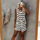 Breezy, textured, and effortlessly resort-ready — this wavy striped crochet knit sleeveless top and drawstring shorts two-piece set is your go-to beach cover-up. The V-neck sleeveless top and matching drawstring shorts create a cohesive, laid-back look perfect for beach days, poolside lounging, or casual summer outings. Available in White.