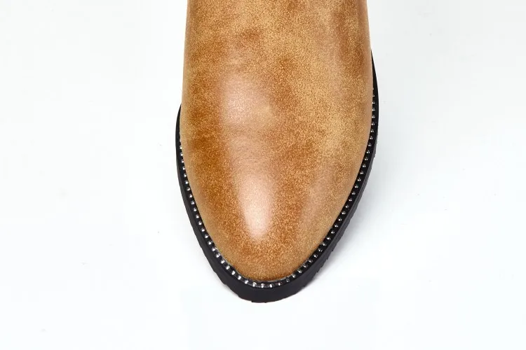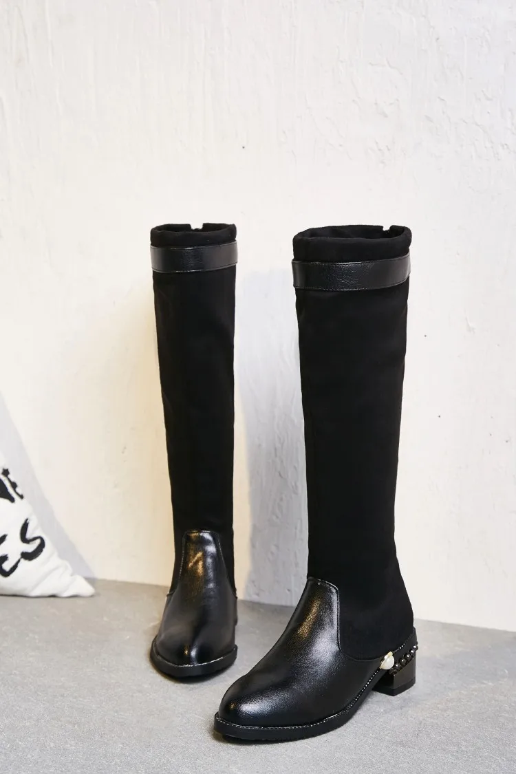 The pearl accent at the heel adds a touch of refined femininity, complemented by metallic micro-studs for subtle edge. Their low block heel ensures all-day wearability, while the high shaft provides warmth and style for any setting—whether you're dressing up a winter ensemble, layering with coats, or polishing an everyday chic look.