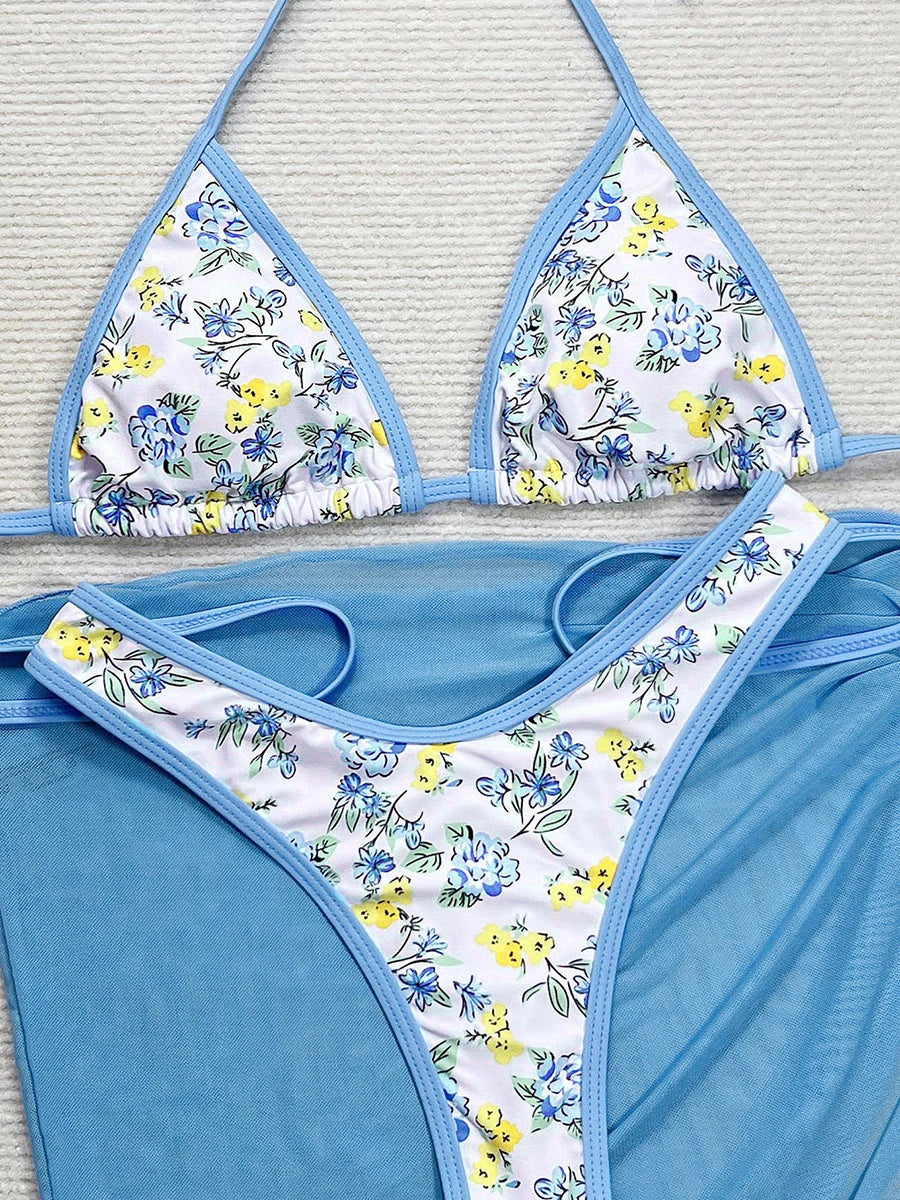 Soak up the sun in the Trend4us Floral Print Bikini & Sheer Sarong Set. This 3-piece set features a delicate floral triangle bikini with a flattering high-leg bottom, trimmed in pastel blue for a soft contrast. Complete with a lightweight sheer mesh sarong, it’s the perfect combo for beach days, poolside lounging, or tropical vacations.