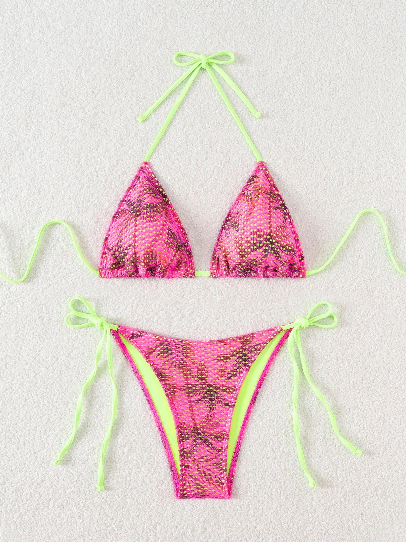 Stand out in bold color and mesh detail with the Trend4us Neon Floral Mesh Tie-Back Bikini Set. Designed to turn heads, this two-piece features a vibrant neon green lining layered with a sheer pink mesh floral overlay. The triangle halter top and adjustable tie-side bottoms offer a flattering, customizable fit. Perfect for beach parties, pool days, and tropical getaways—this set combines daring color with floral charm.