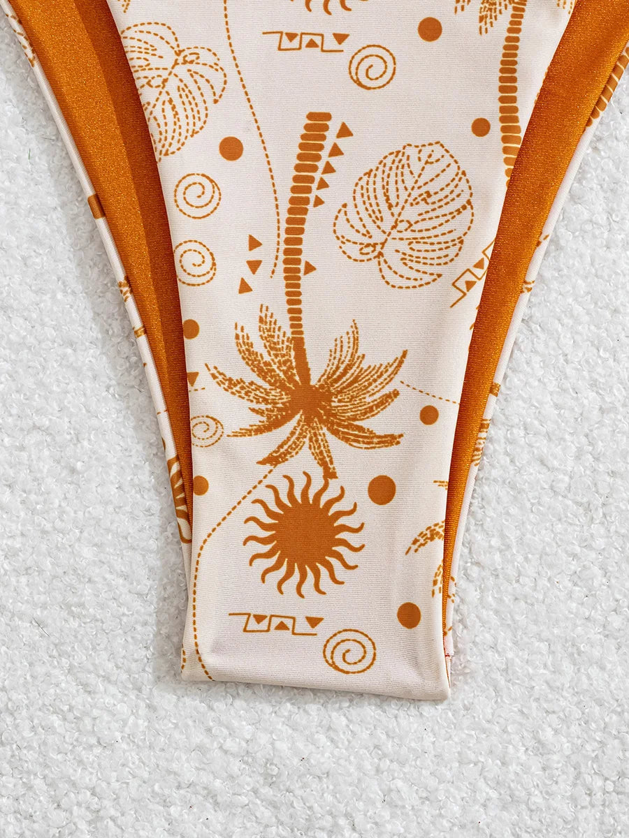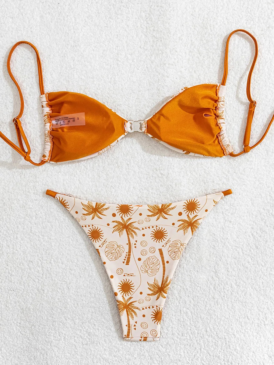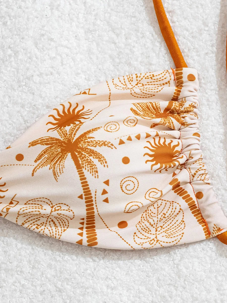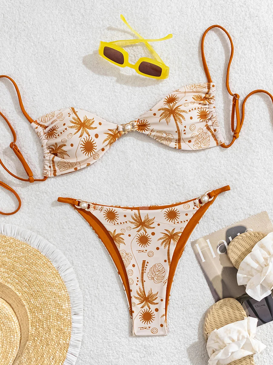 Elevate your beachwear with the Trend4us Tropical Pearl Accent Bikini Set. Featuring a palm tree and shell-inspired print, this ruched bandeau-style top and high-cut bottom are adorned with pearl detailing for a refined tropical touch. Designed for sun-kissed days, this set brings together vintage island charm and modern femininity.