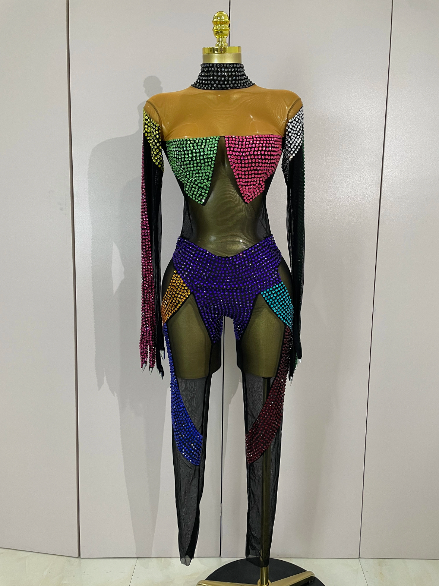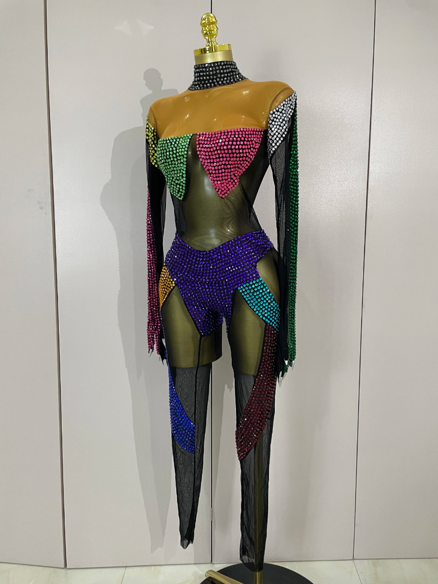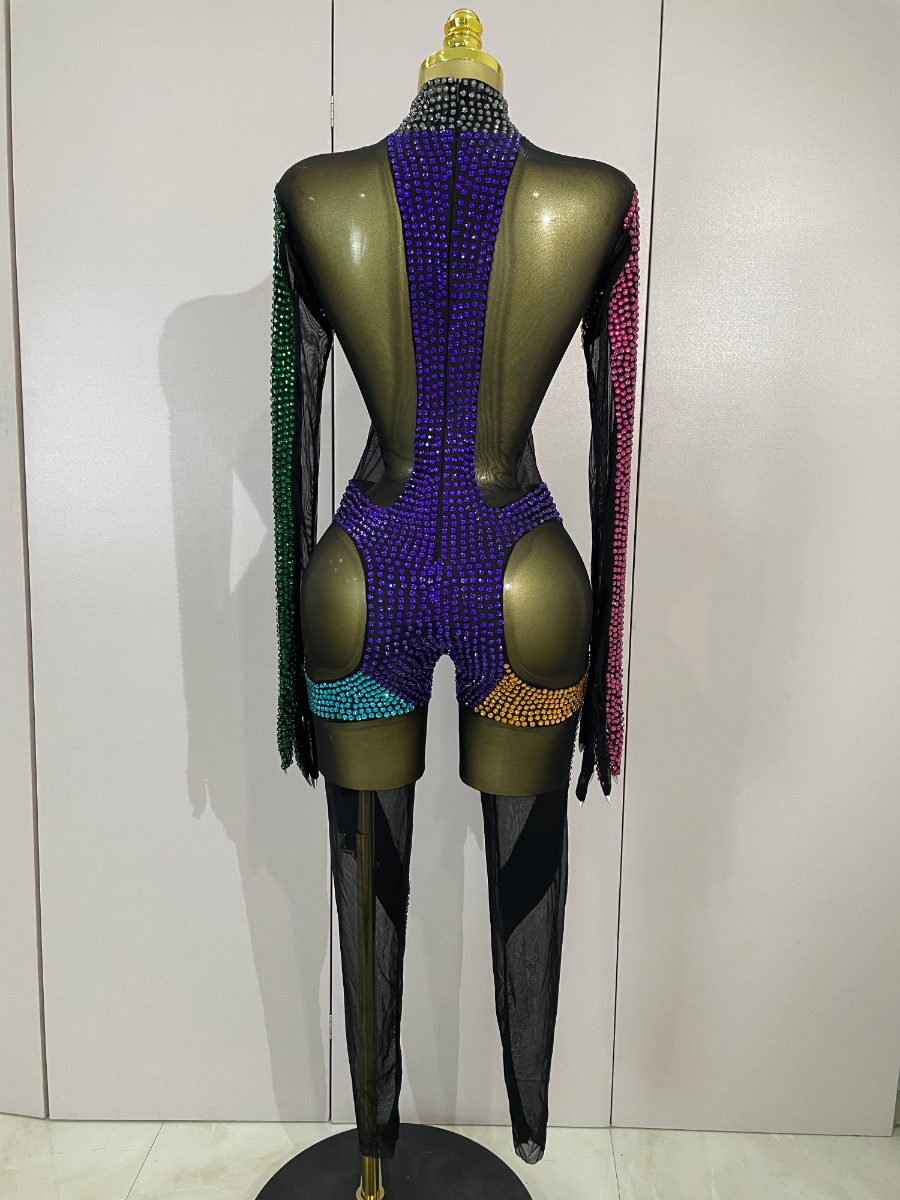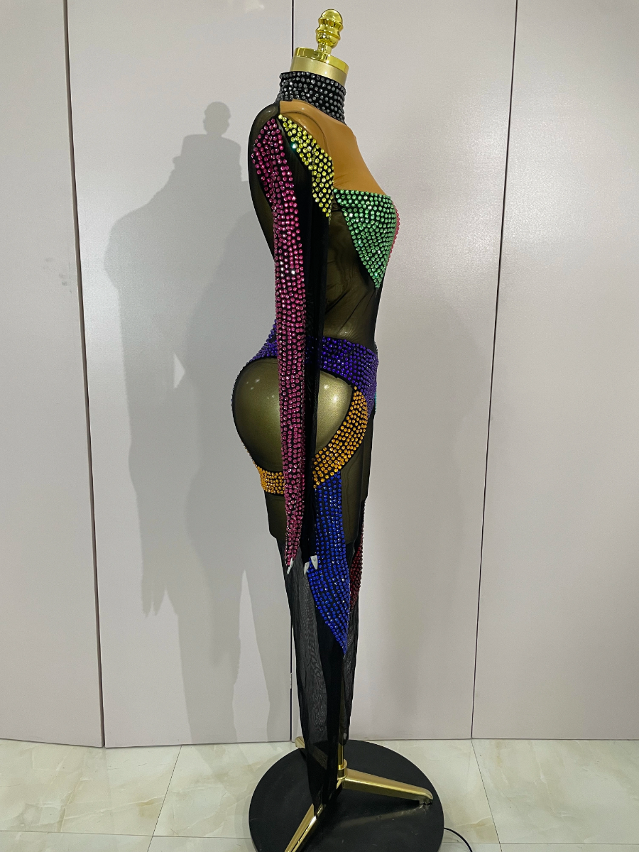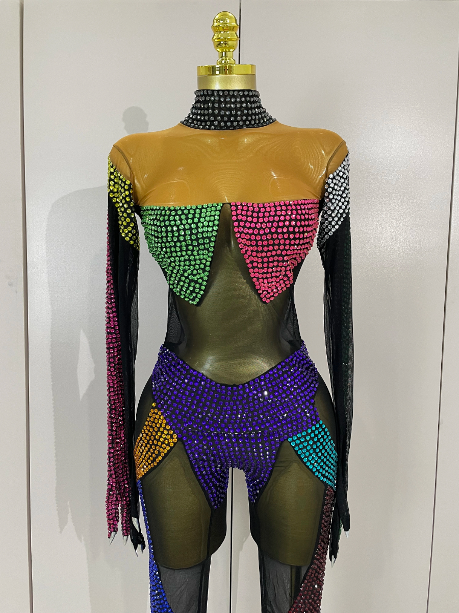 Crafted from ultra-stretch sheer mesh, this bodysuit features multicolor crystal embellishments strategically placed to sculpt and highlight the body with dramatic contrast and movement. The cutout panel design creates a striking visual effect under stage lights, while the second-skin fit ensures flexibility, comfort, and confidence during high-energy performances.