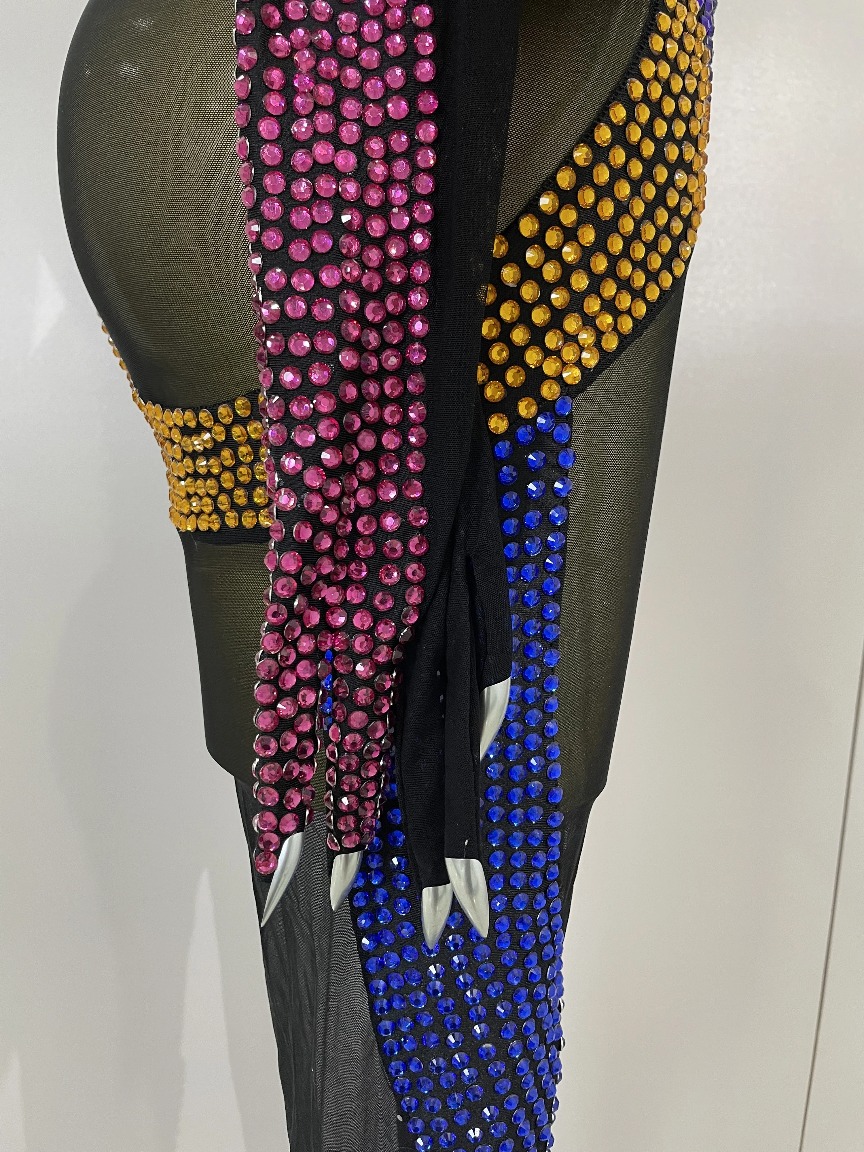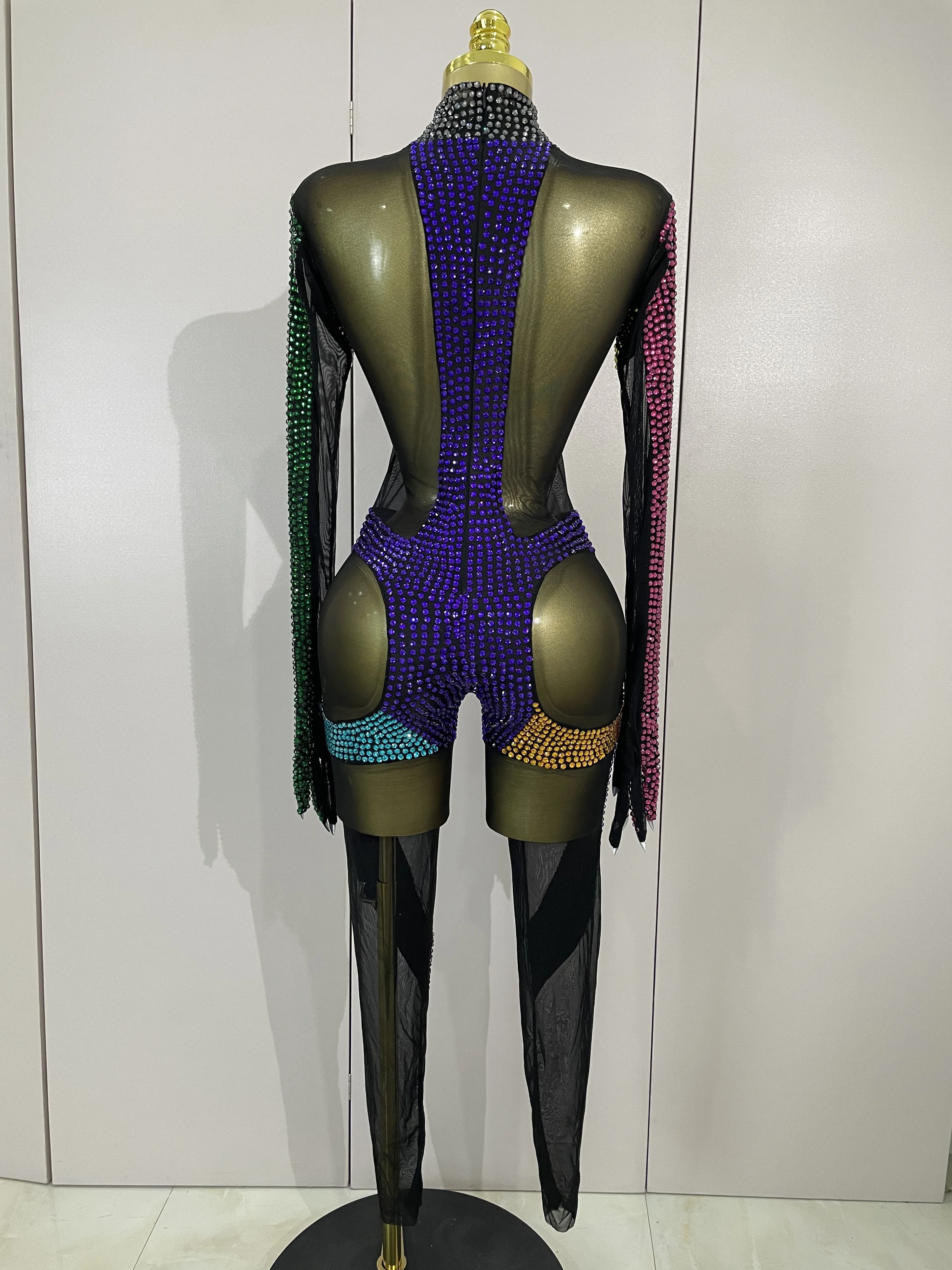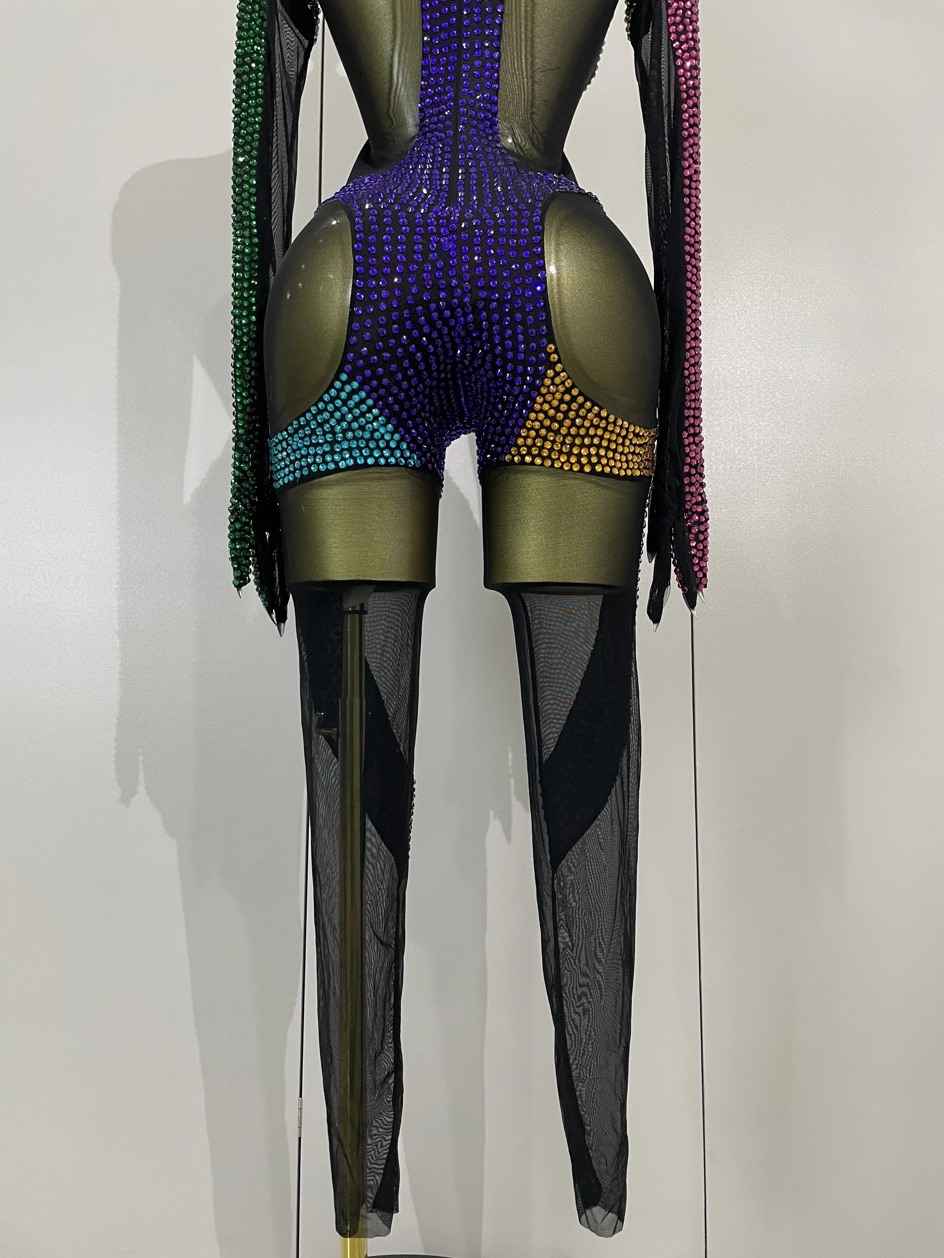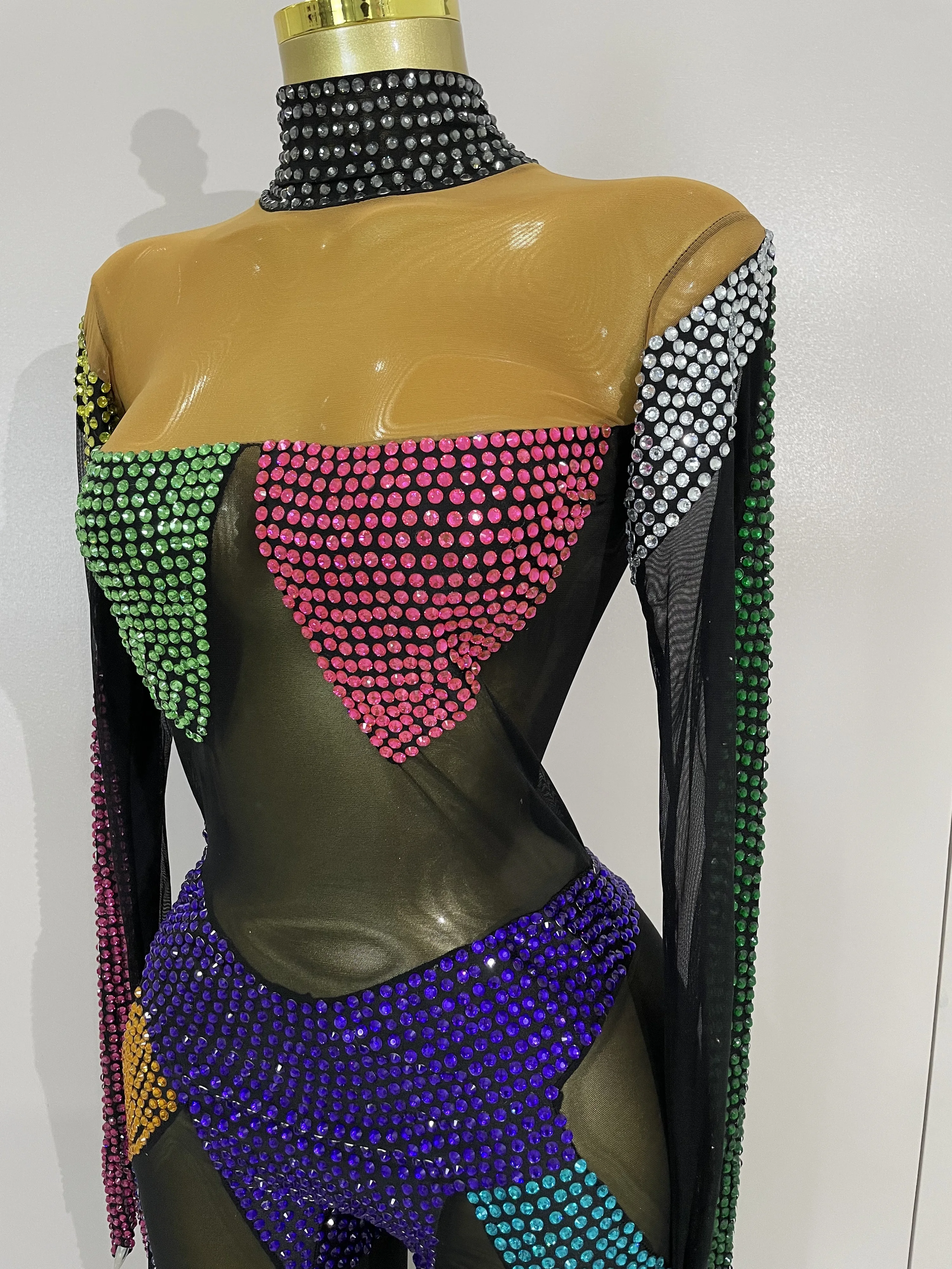 Crafted from ultra-stretch sheer mesh, this bodysuit features multicolor crystal embellishments strategically placed to sculpt and highlight the body with dramatic contrast and movement. The cutout panel design creates a striking visual effect under stage lights, while the second-skin fit ensures flexibility, comfort, and confidence during high-energy performances.