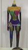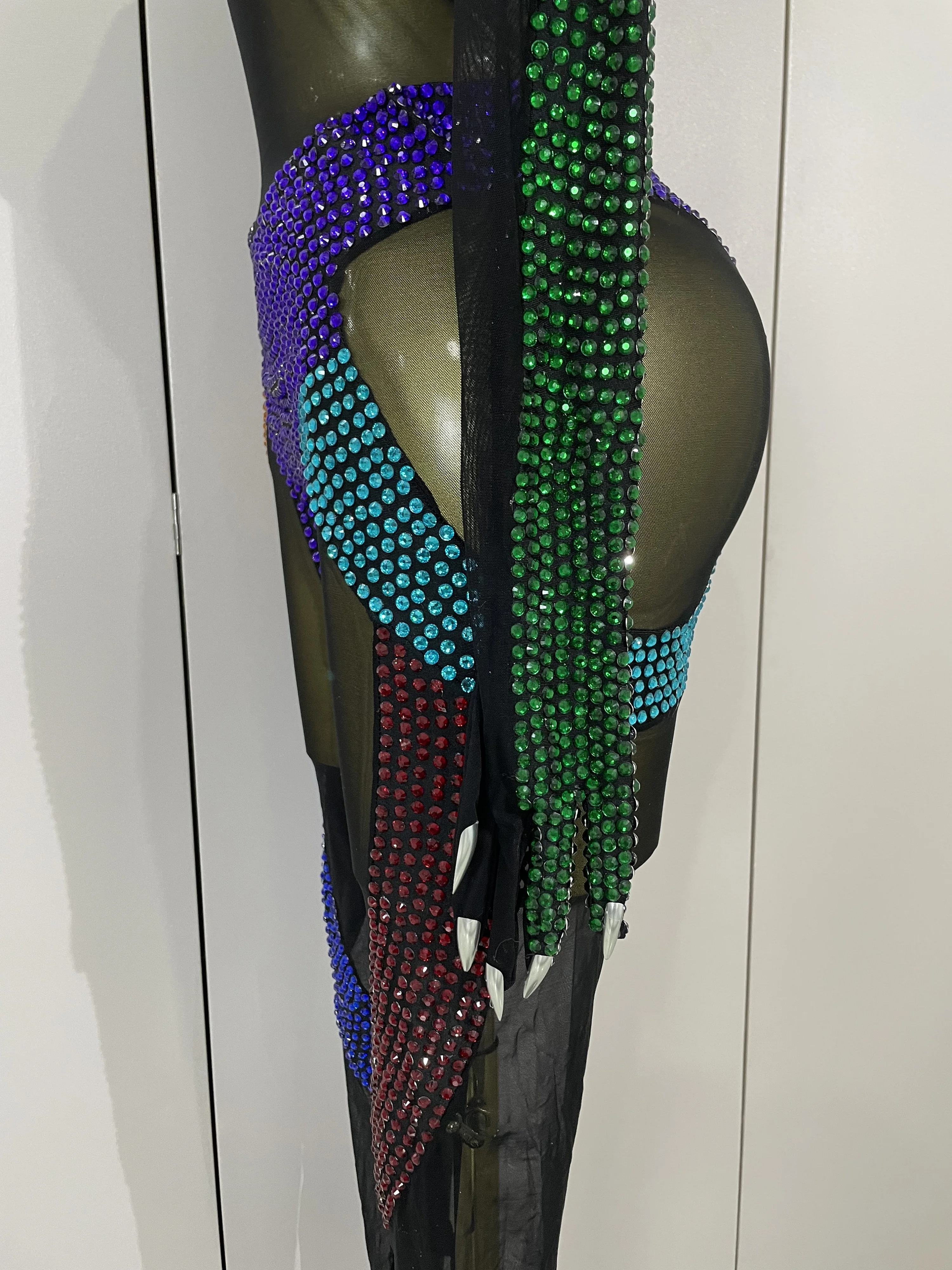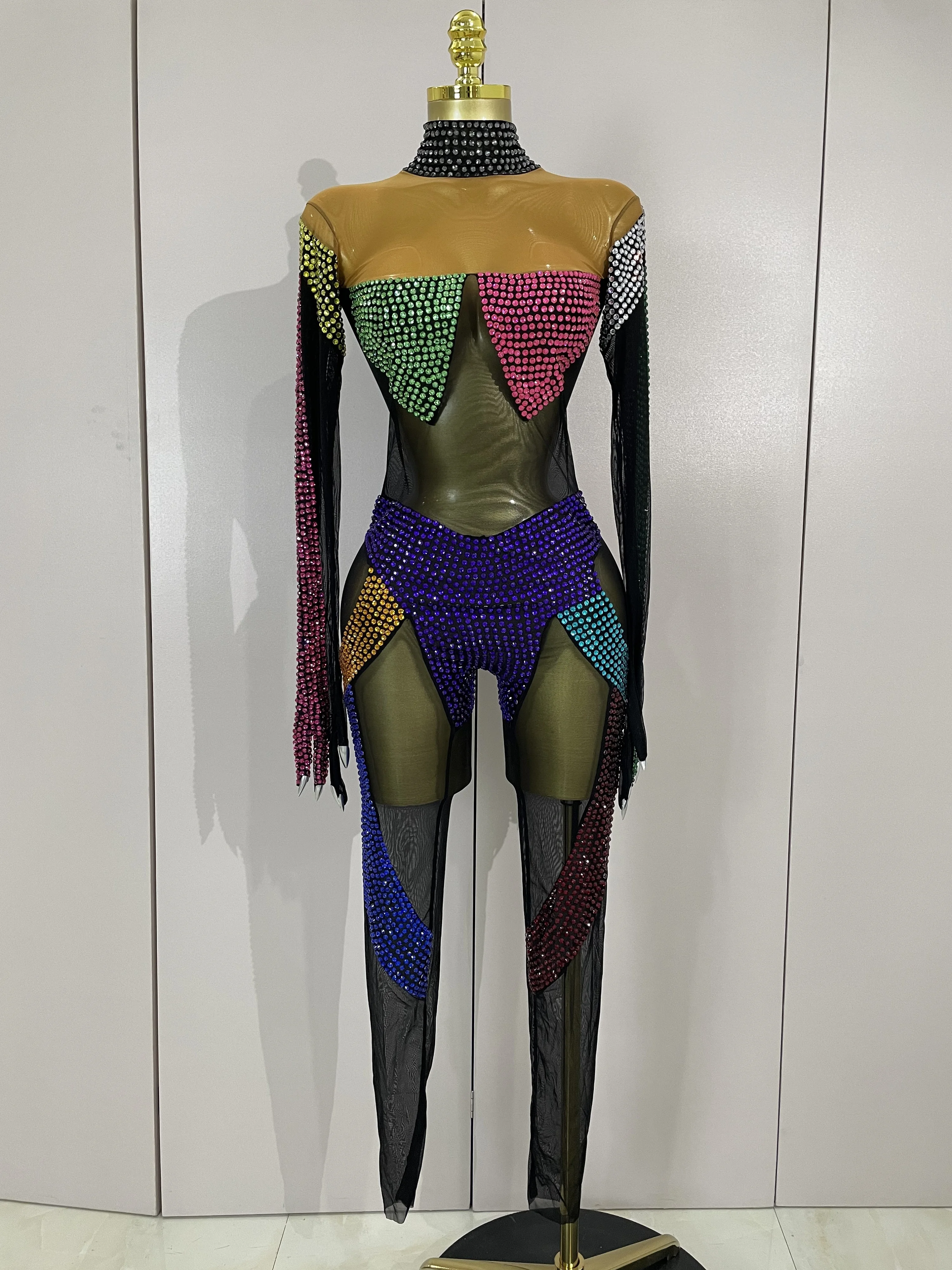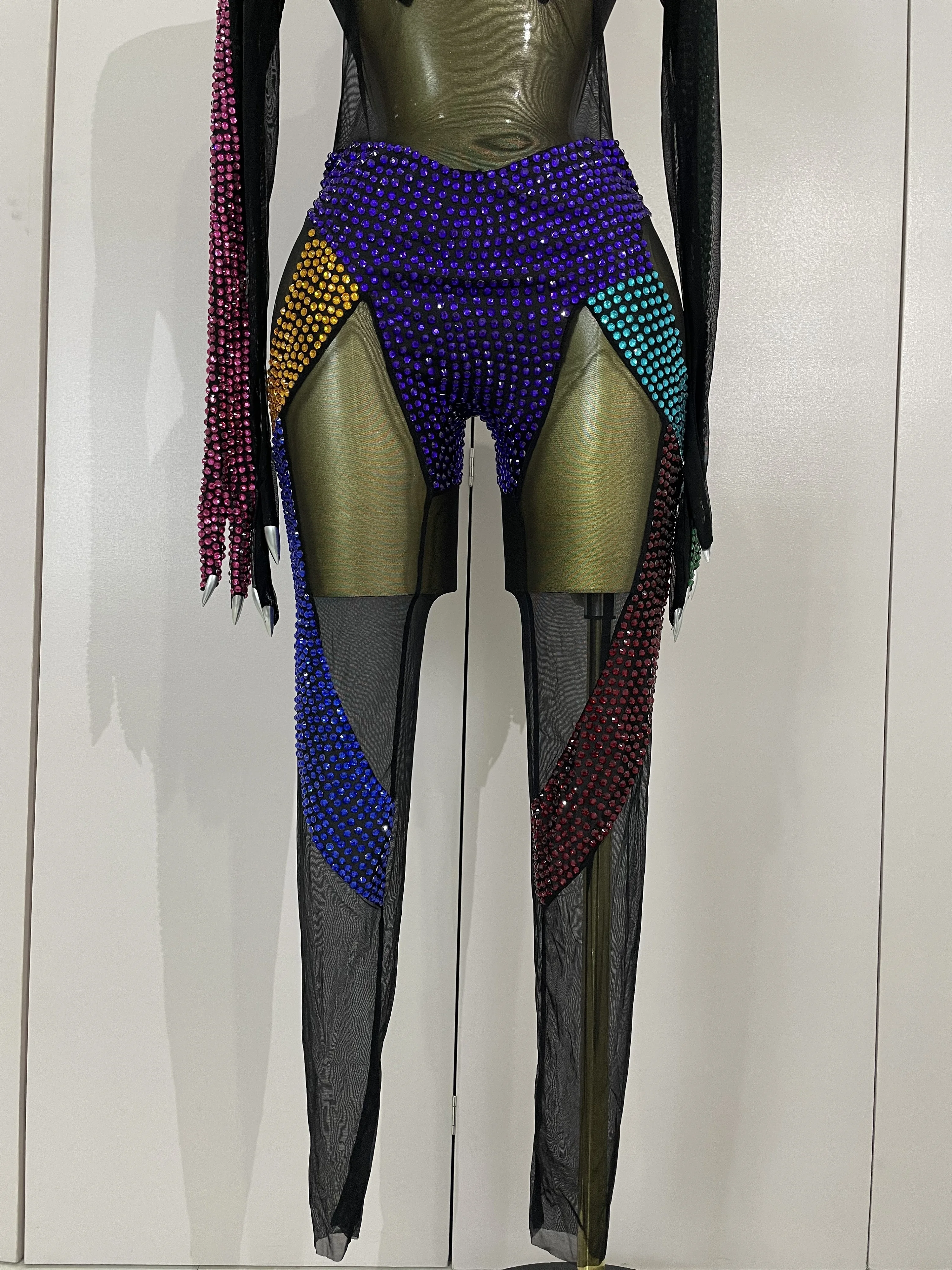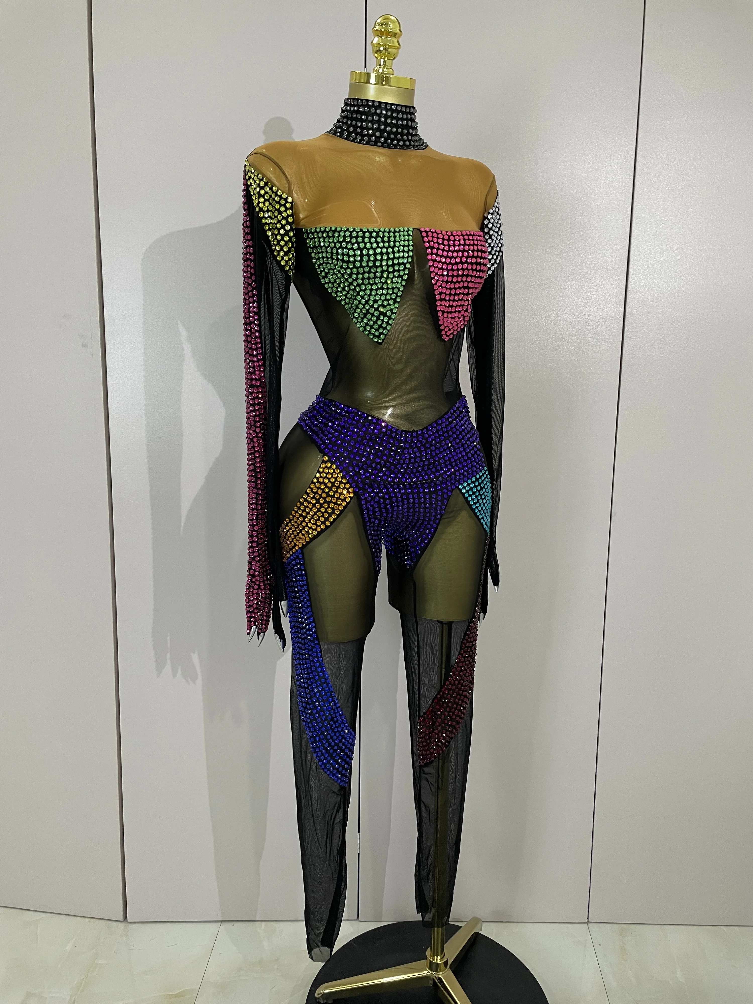 Crafted from ultra-stretch sheer mesh, this bodysuit features multicolor crystal embellishments strategically placed to sculpt and highlight the body with dramatic contrast and movement. The cutout panel design creates a striking visual effect under stage lights, while the second-skin fit ensures flexibility, comfort, and confidence during high-energy performances.