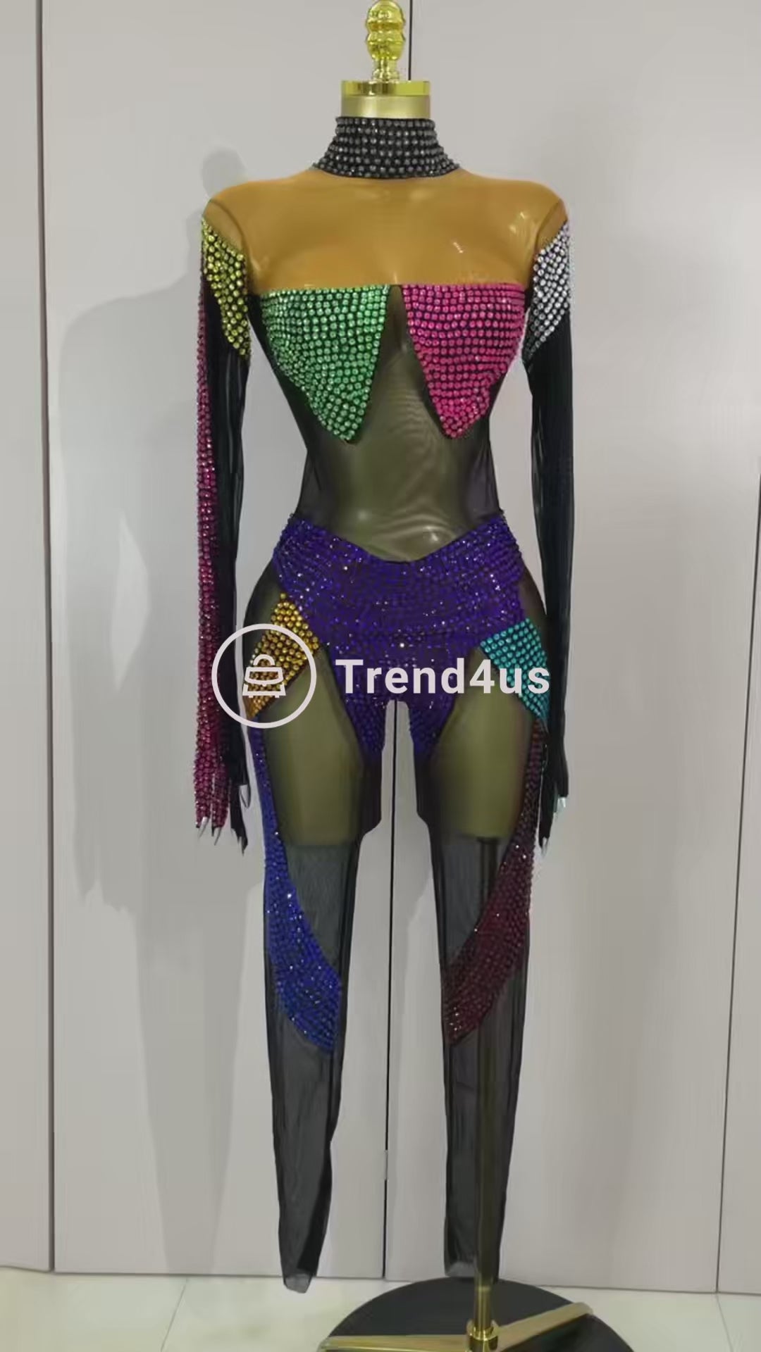 Command the spotlight in the Trend4us Crystal Sheer Mesh Performance Bodysuit — a bold, high-impact statement piece designed for dance, stage, festival, and performance wear.
