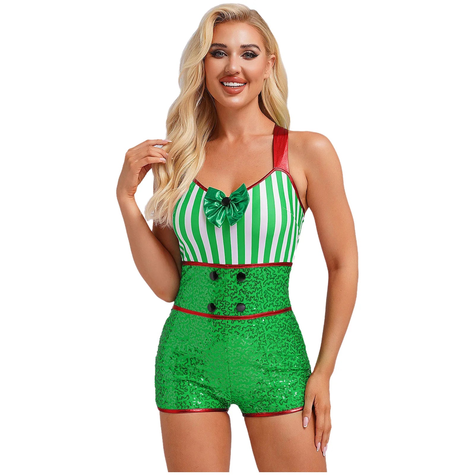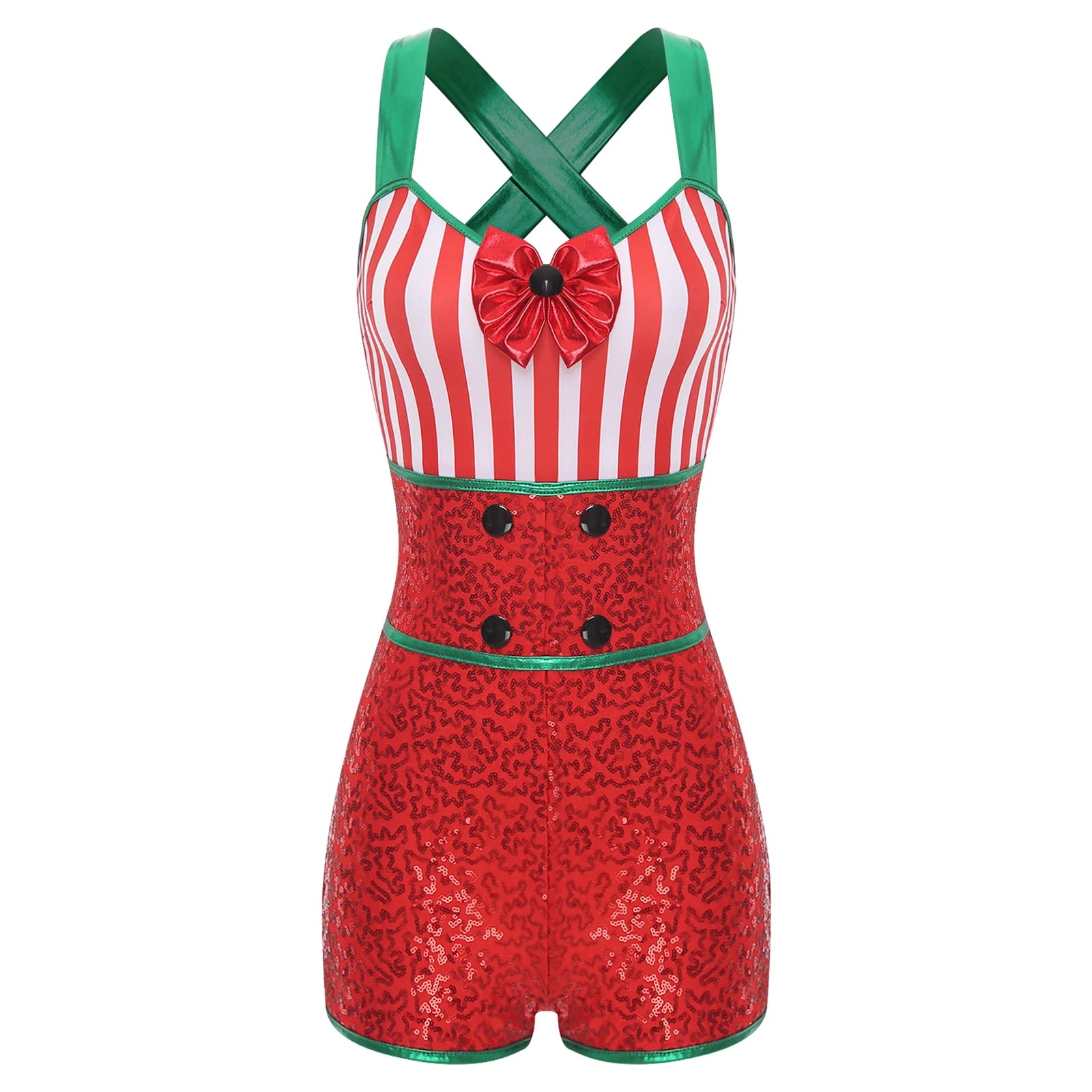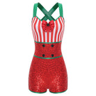 Turn heads this holiday season with the Trend4us Festive Striped Bow Sequin Christmas Romper. Designed with playful candy cane stripes and sparkling red sequin shorts, this one-piece brings holiday cheer in style. Featuring a flattering sweetheart neckline with a statement satin bow, metallic green straps, and a cinched high-waist silhouette adorned with button details, it combines festive flair with a glamorous edge. Perfect for Christmas parties, themed events, or playful holiday photoshoots, this romper delivers comfort, sparkle, and undeniable charm.