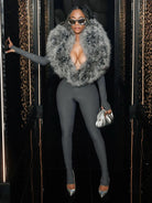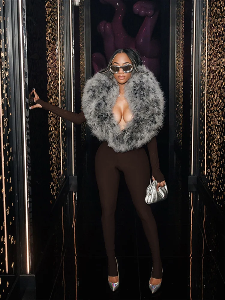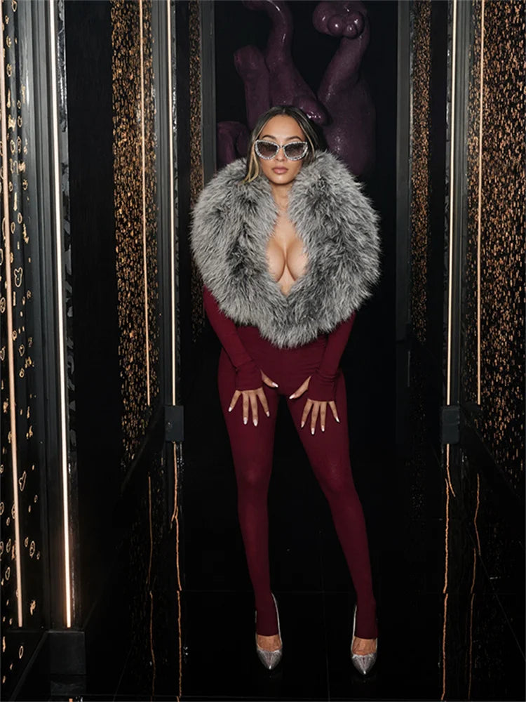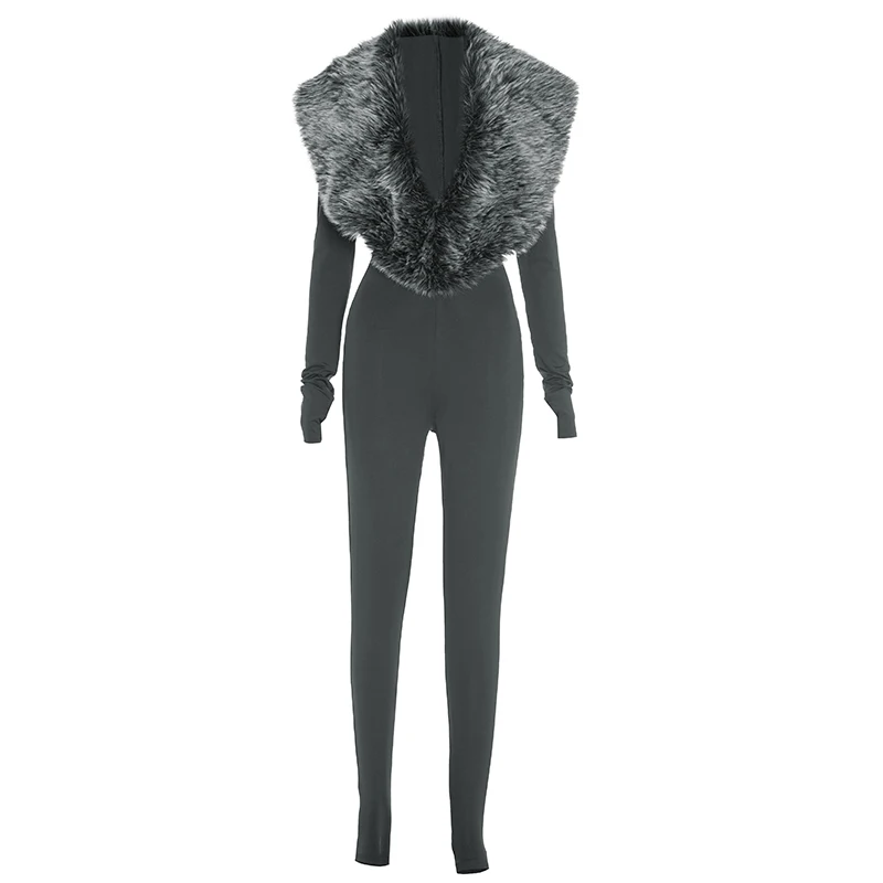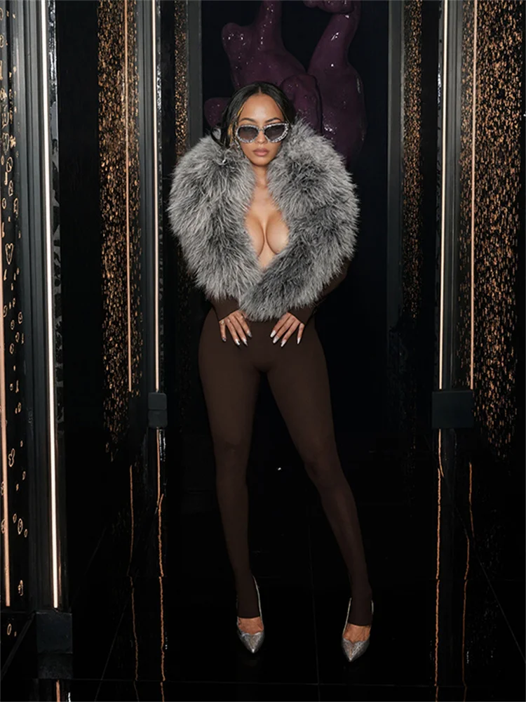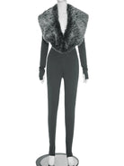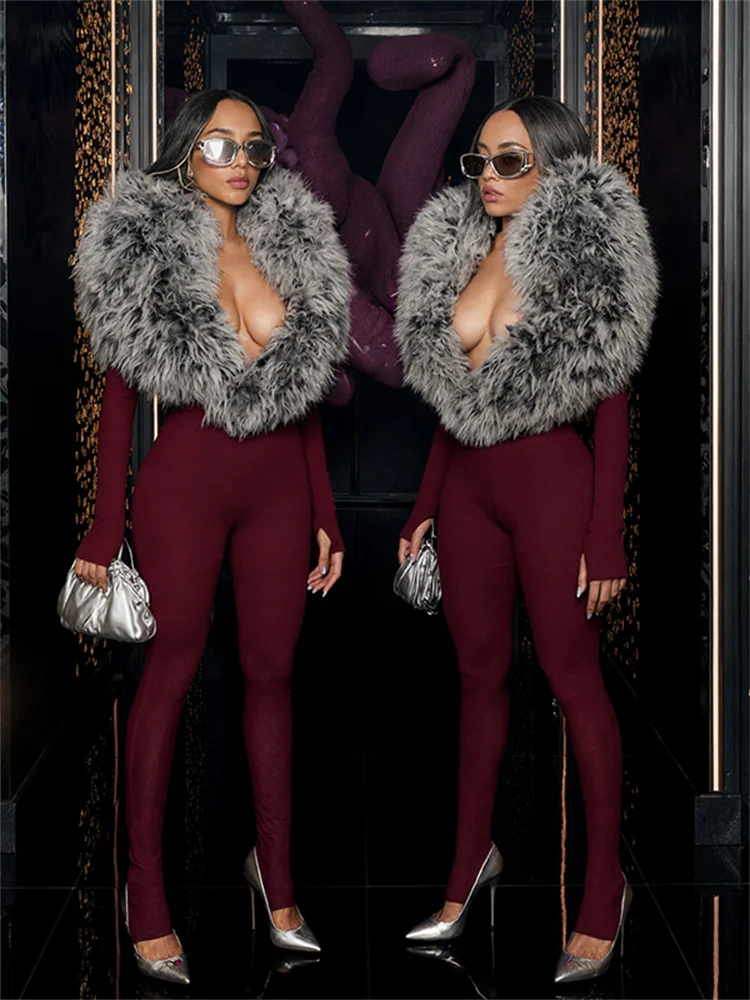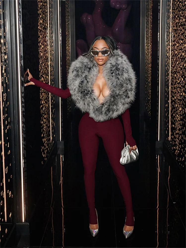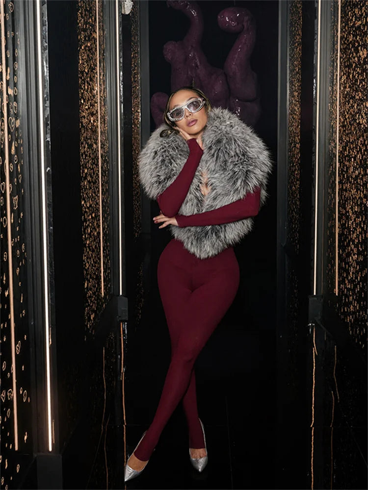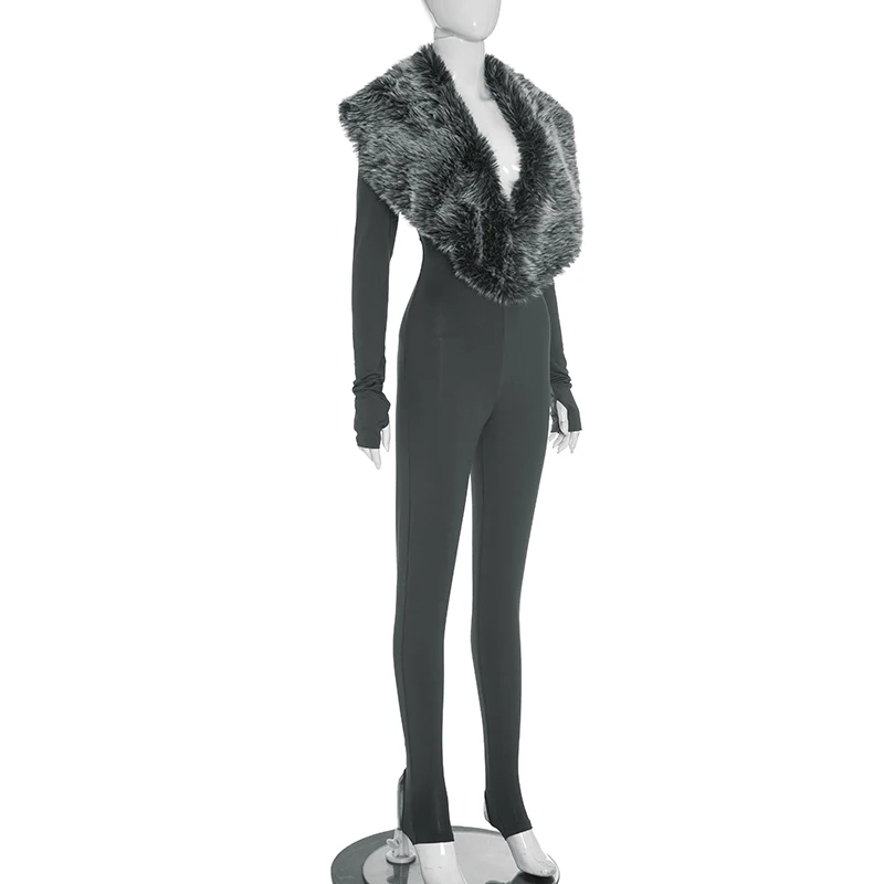 Command attention with elevated winter glamour. The Trend4us Luxe Faux Fur Shawl-Collar Sculpted Long-Sleeve Jumpsuit is a statement piece designed for bold evenings, high-fashion moments, and luxe seasonal styling. Featuring a dramatic faux fur shawl collar that cascades across the neckline and shoulders, this jumpsuit blends opulence with sleek minimalism.