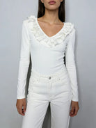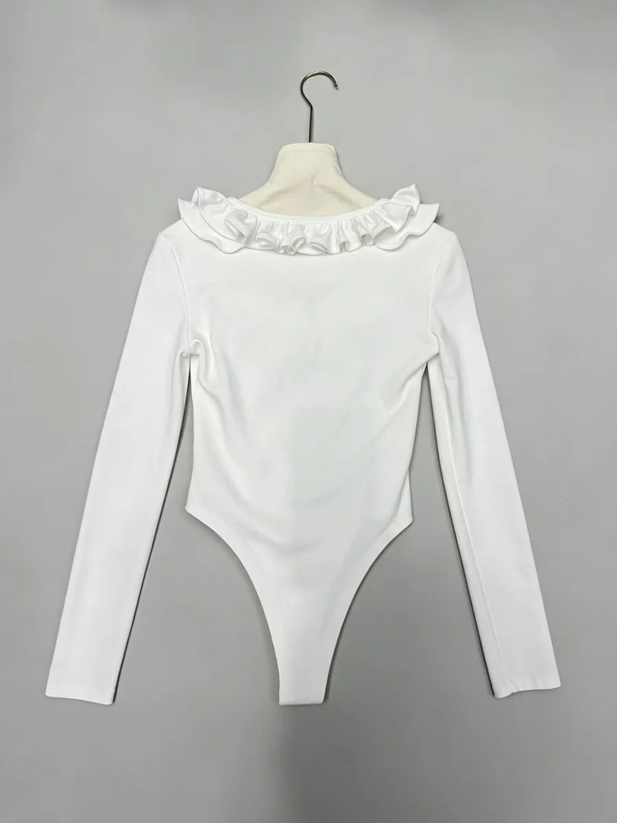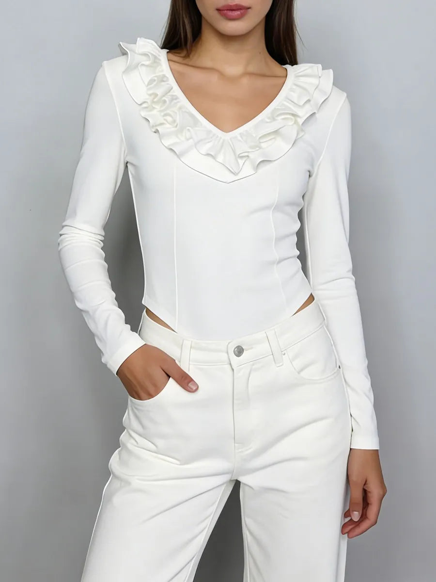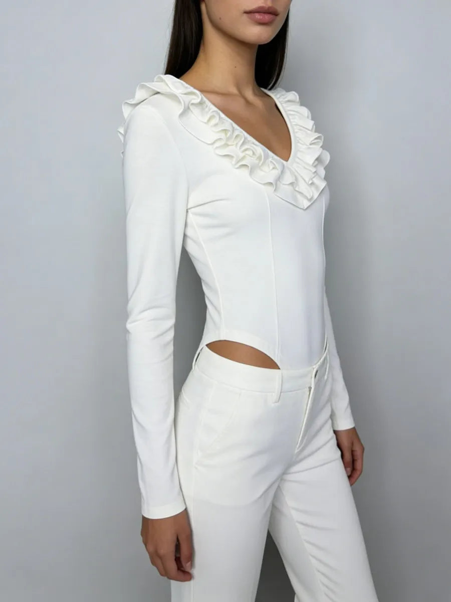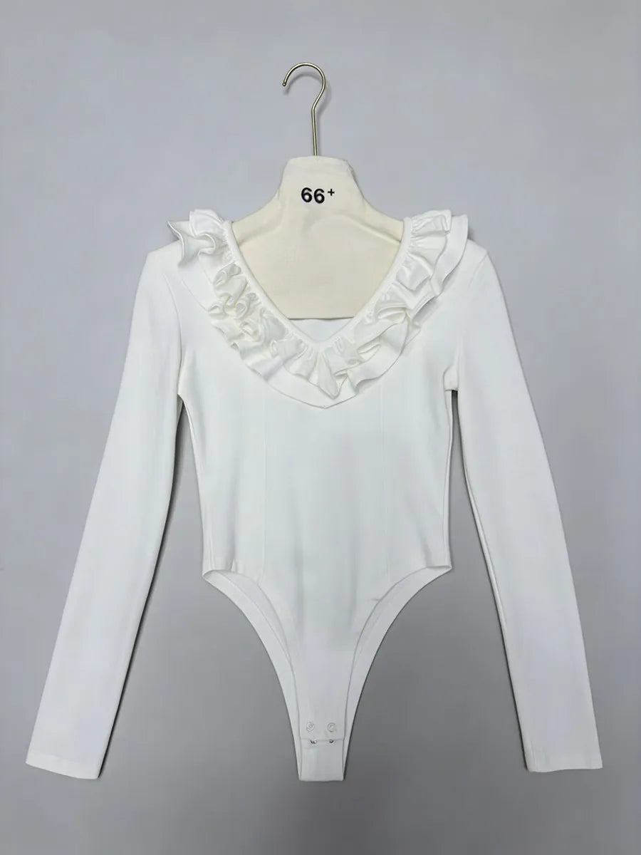 Refined and effortlessly feminine, the Trend4us Ruffled Long-Sleeve Sculpting Bodysuit is designed to elevate everyday styling. Featuring a soft V-neckline framed with delicate ruffle detailing, this bodysuit adds a romantic touch while maintaining a sleek, modern silhouette. The sculpting stretch fabric smooths and contours the body, while long sleeves and a streamlined cut make it perfect for both layering and stand-alone wear. Finished with a snap-button closure for comfort and ease, this piece transitions seamlessly from day to night.