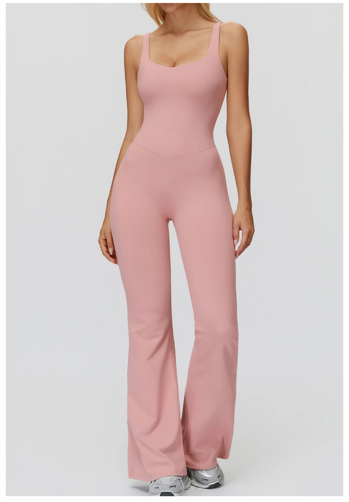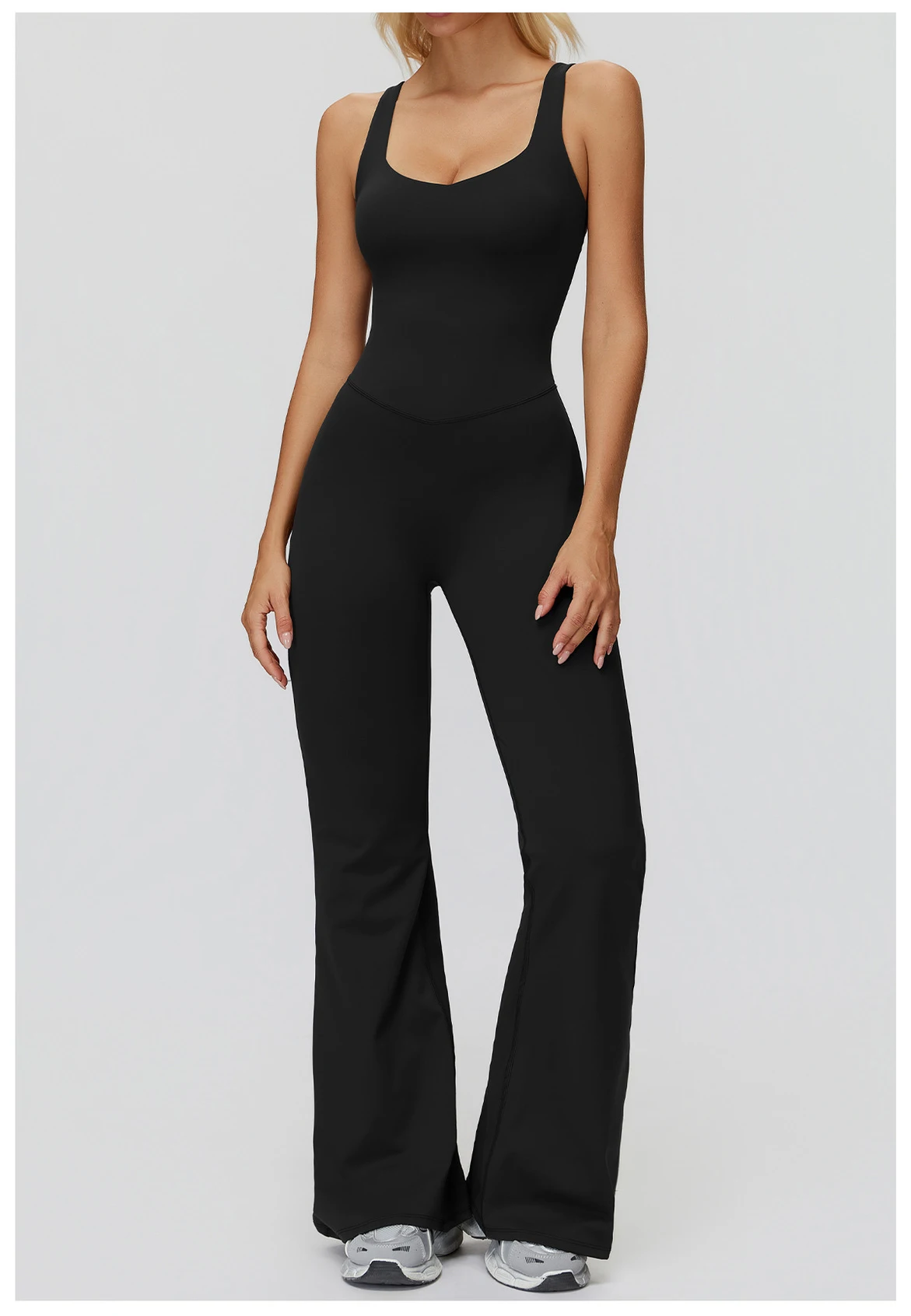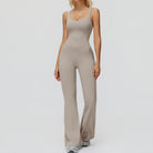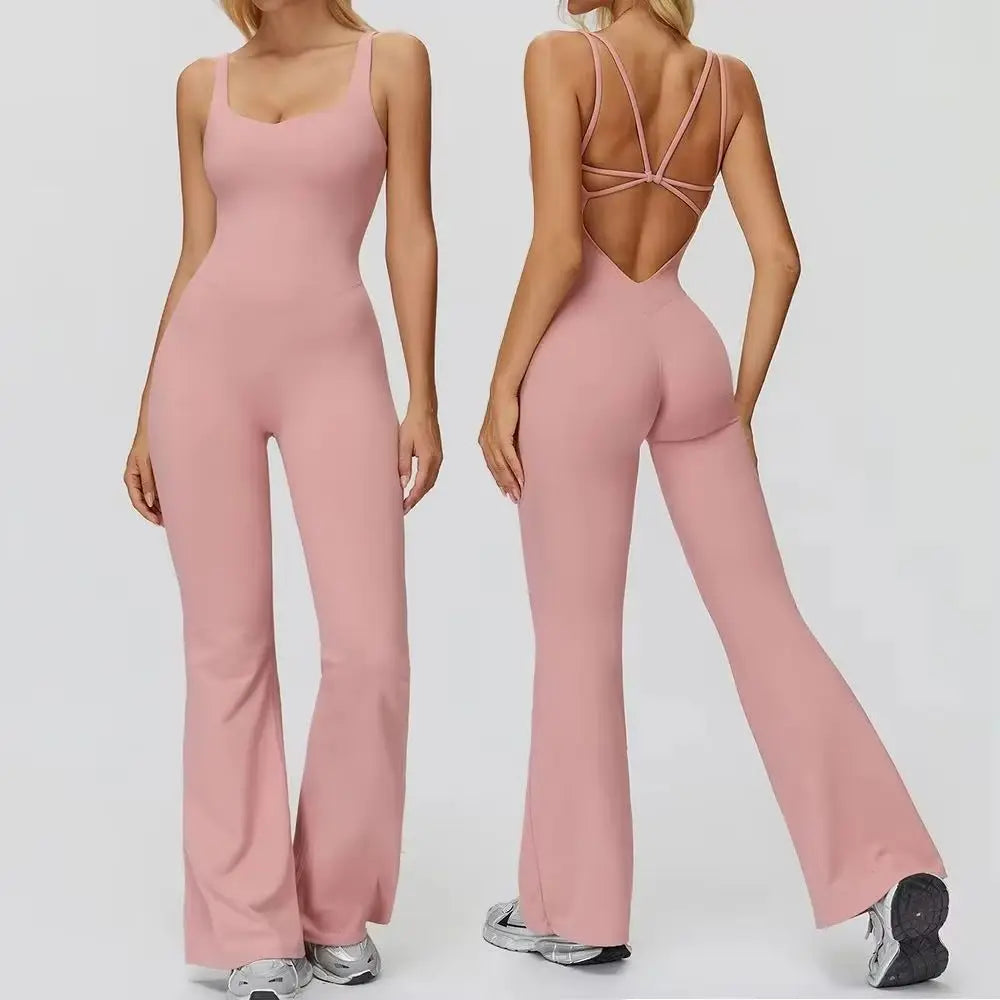Designed to sculpt, support, and move with you, the Trend4us Seamless Open-Back Flare Yoga Jumpsuit blends performance and style effortlessly. Crafted from a buttery-soft seamless fabric, this one-piece jumpsuit features a flattering scoop neckline and a striking open-back design with supportive straps that enhance breathability and visual appeal. The flare-leg silhouette elongates the legs while offering freedom of movement, making it perfect for yoga, Pilates, gym sessions, or elevated athleisure looks.