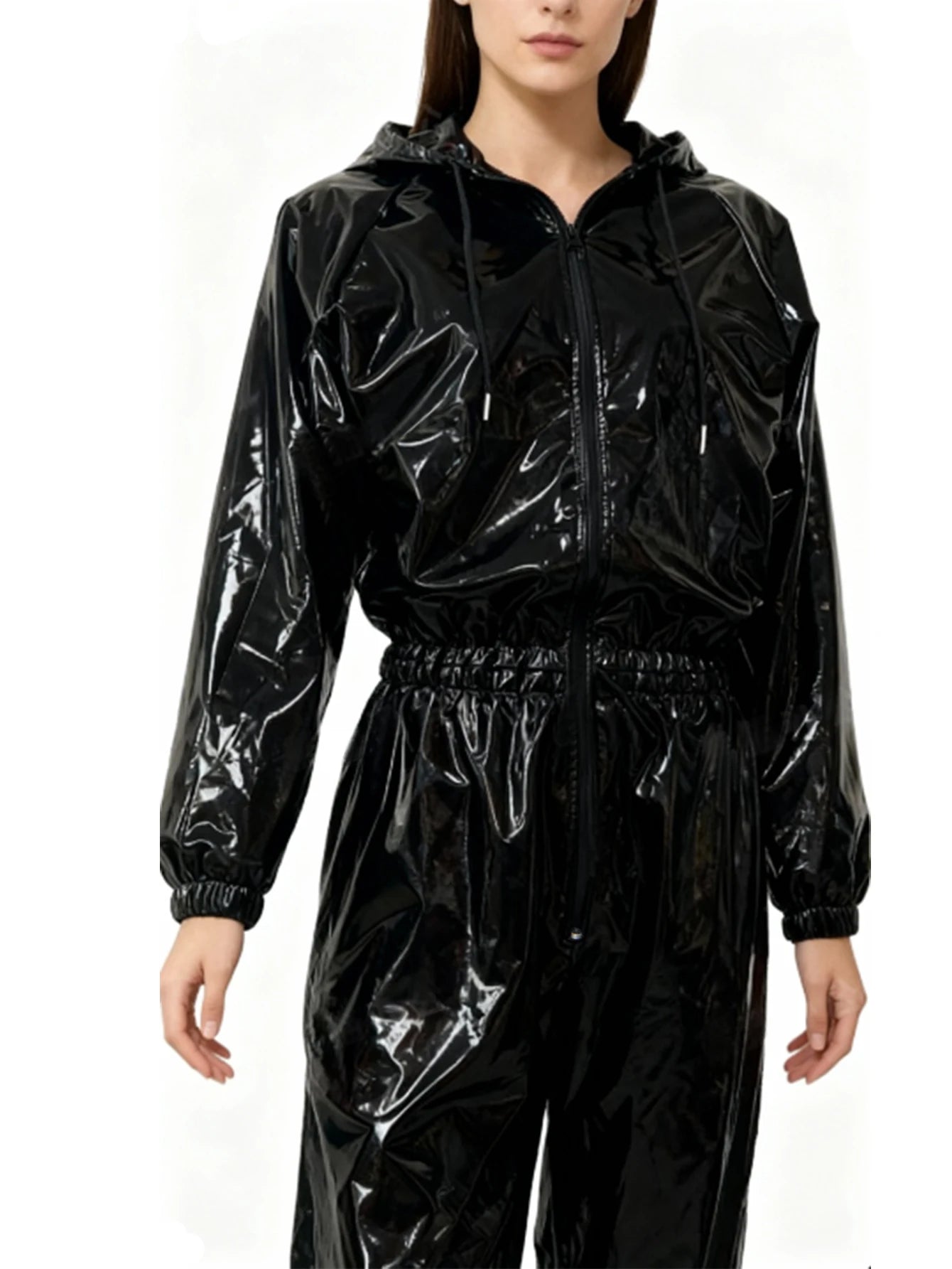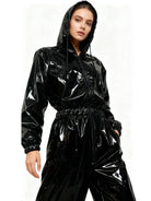 Trend4us Sleek Glossy Faux Leather Hooded Zip-Up Jumpsuit