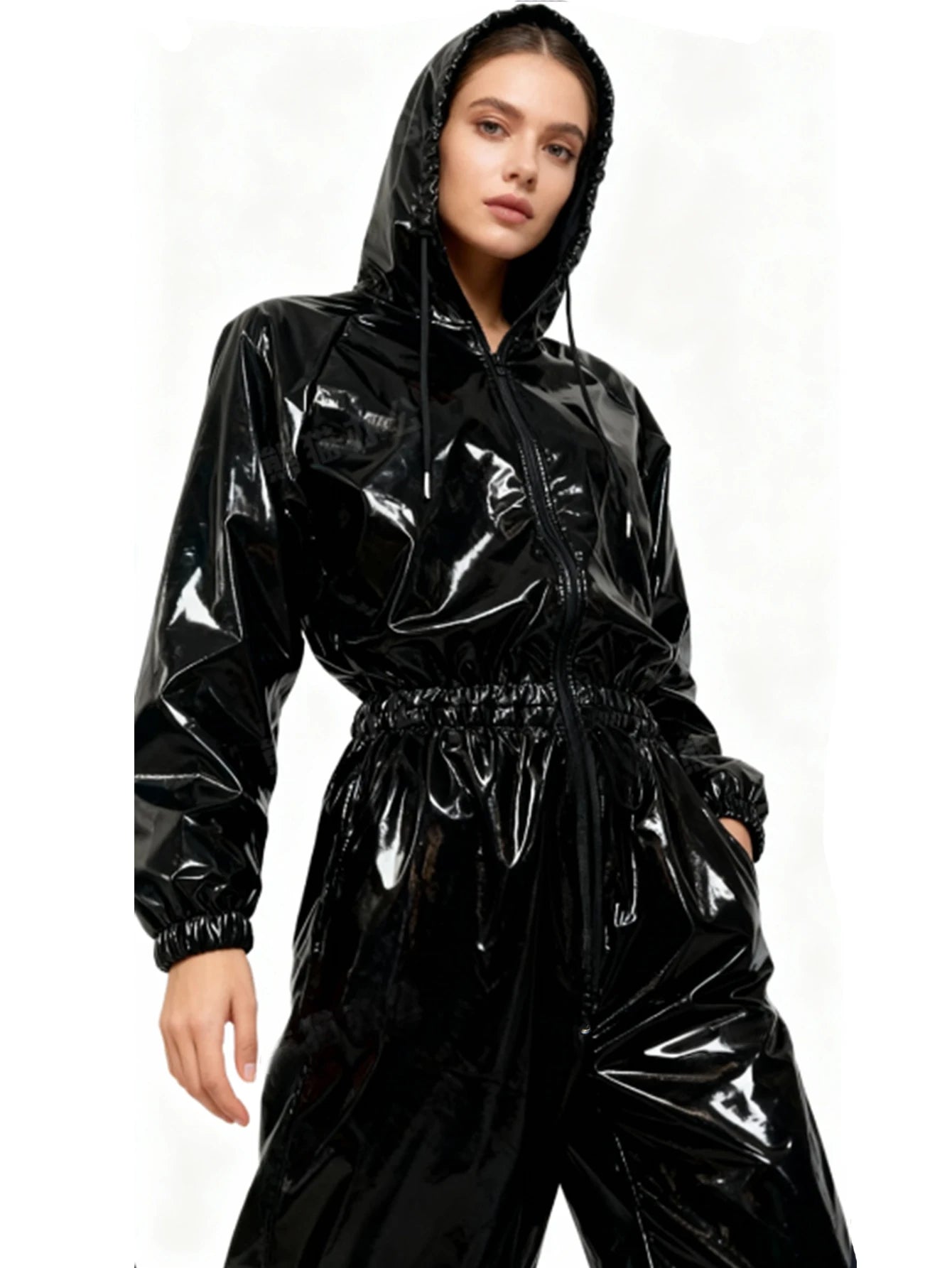 The zip-up front allows versatile styling—from subtly open to fully zipped—while the attached hood adds a streetwear-inspired touch. Elasticized waist and cuffs enhance comfort and shape, creating a flattering, cinched fit that moves with you. Perfect for clubwear, nightlife, performance looks, or elevated street style, this jumpsuit is made to stand out.