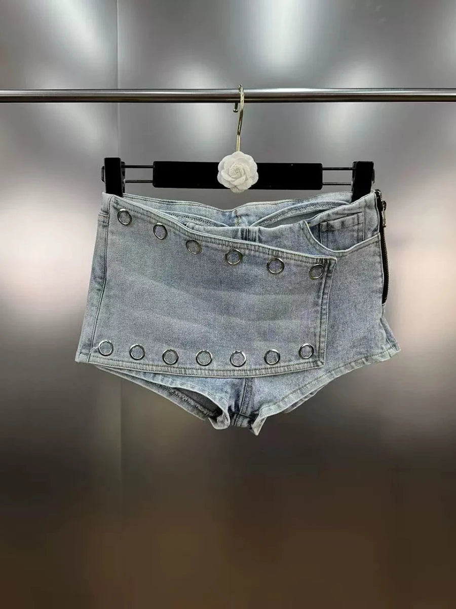 Upgrade your casual wardrobe with the Trend4us Grommet Detail Layered Denim Casual Shorts, a bold fusion of streetwear style and everyday comfort. Featuring a unique layered front panel accented with oversized metal grommets, these shorts deliver an edgy yet playful vibe.