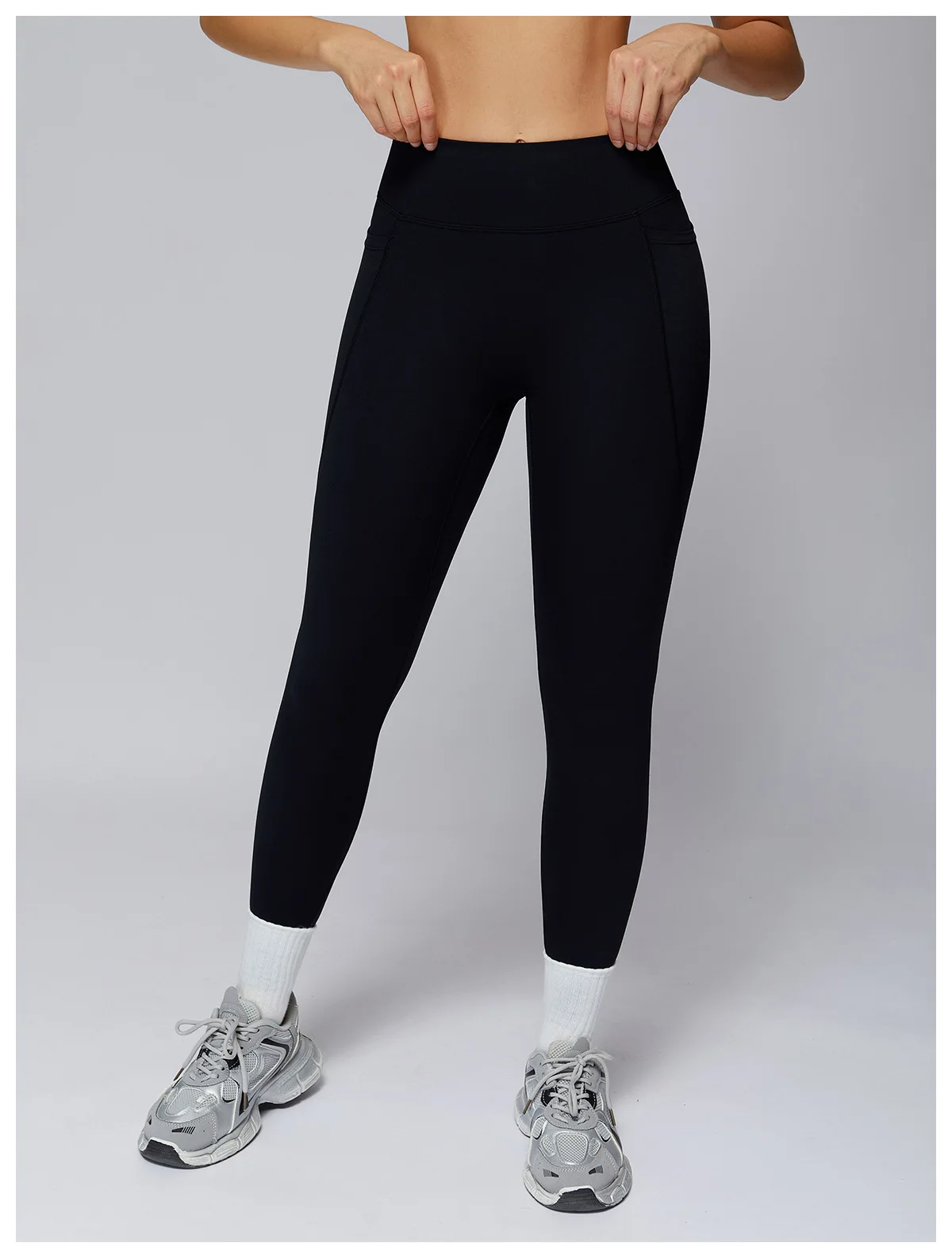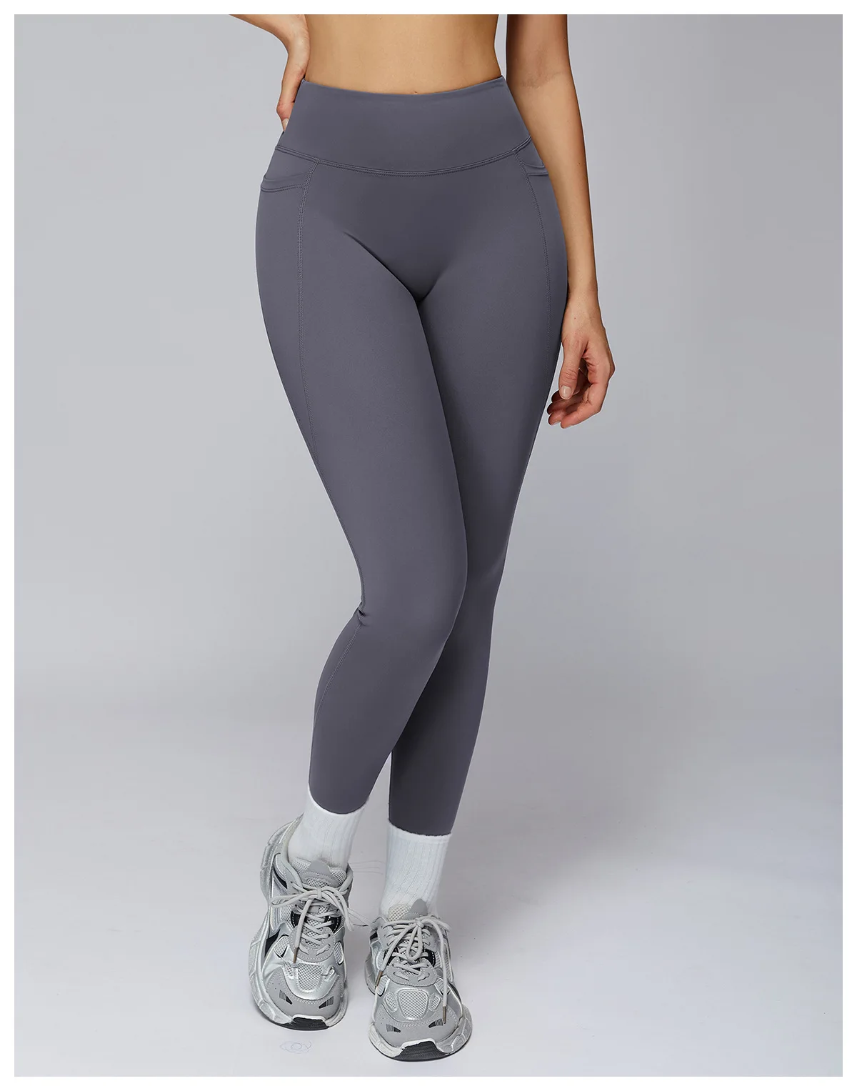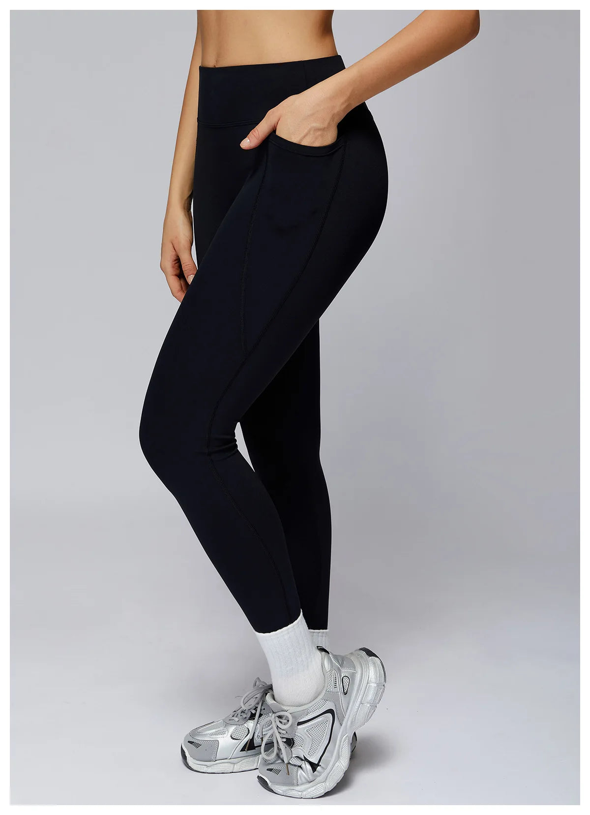 Designed with a supportive high-rise waistband, these leggings contour your shape and stay perfectly in place during every movement. The sculpting compression fabric offers a smooth, flattering fit that hugs your curves while maintaining flexibility and breathability. Functional side pockets let you carry your essentials hands-free — perfect for phones, keys, or cards.