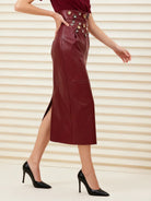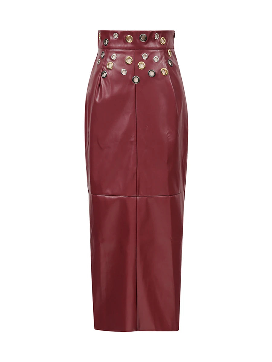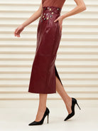Elevate your wardrobe with the Trend4us Luxe Studded Faux Leather Midi Skirt — a bold blend of edgy sophistication and modern elegance. Crafted from smooth burgundy faux leather, this high-waisted skirt features metallic stud embellishments in gold and silver tones, adding a striking detail to its sleek silhouette. The back slit provides both comfort and allure, making it ideal for day-to-night transitions. Whether paired with heels for a chic evening look or styled with boots for a statement daytime outfit, this skirt delivers high-fashion appeal with timeless versatility.