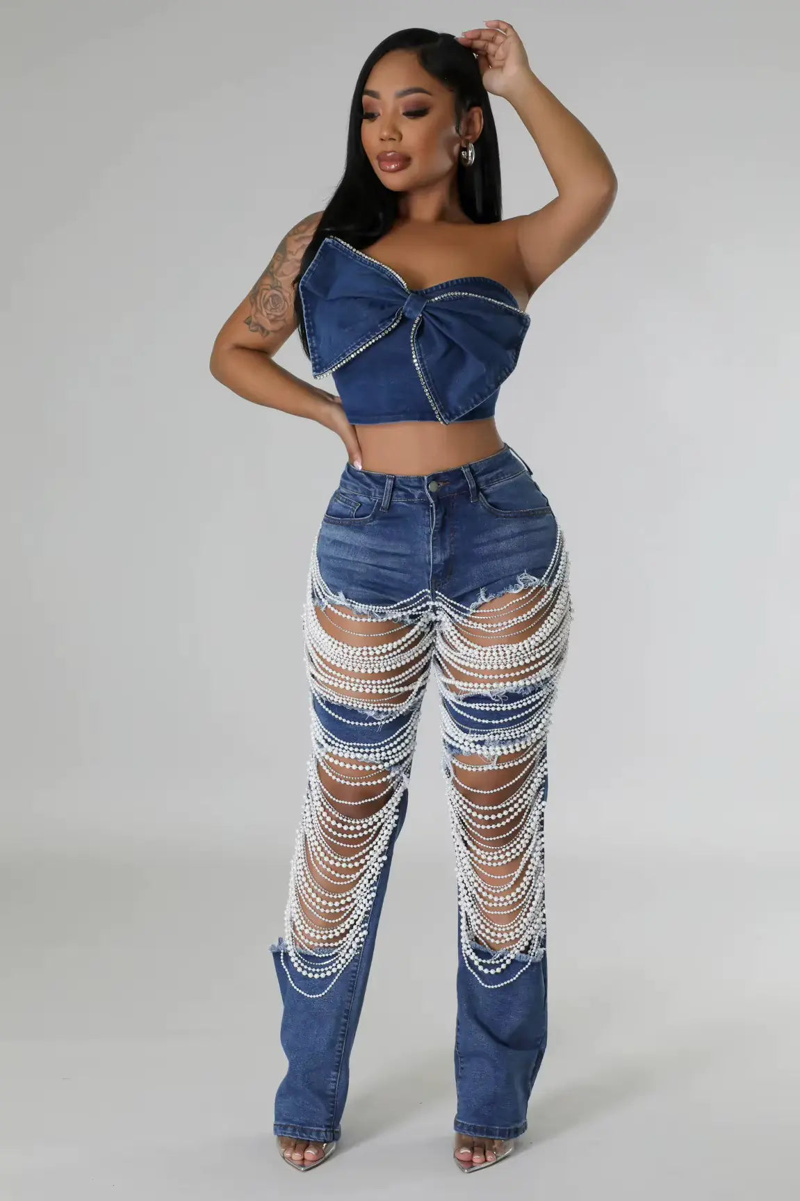 Turn heads and make a statement with the Trend4us Pearl-Embellished Cutout Ripped Denim Jeans, a perfect fusion of edgy and elegant fashion. These high-waisted jeans feature daring cutouts adorned with cascading pearl embellishments, giving a bold yet sophisticated vibe. Designed in a flattering straight-leg silhouette, these jeans are crafted from premium stretch denim for a comfortable and flexible fit.